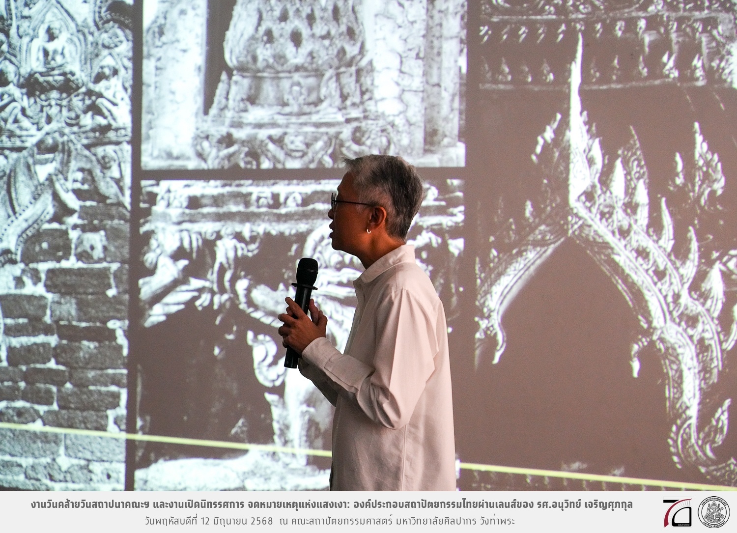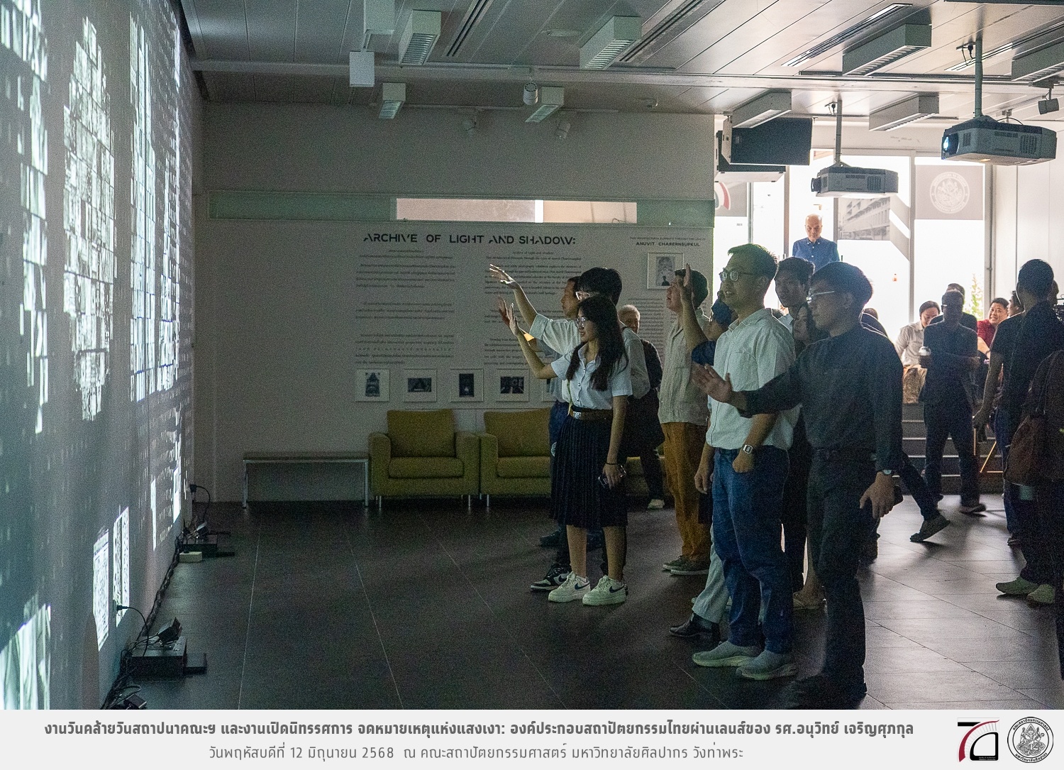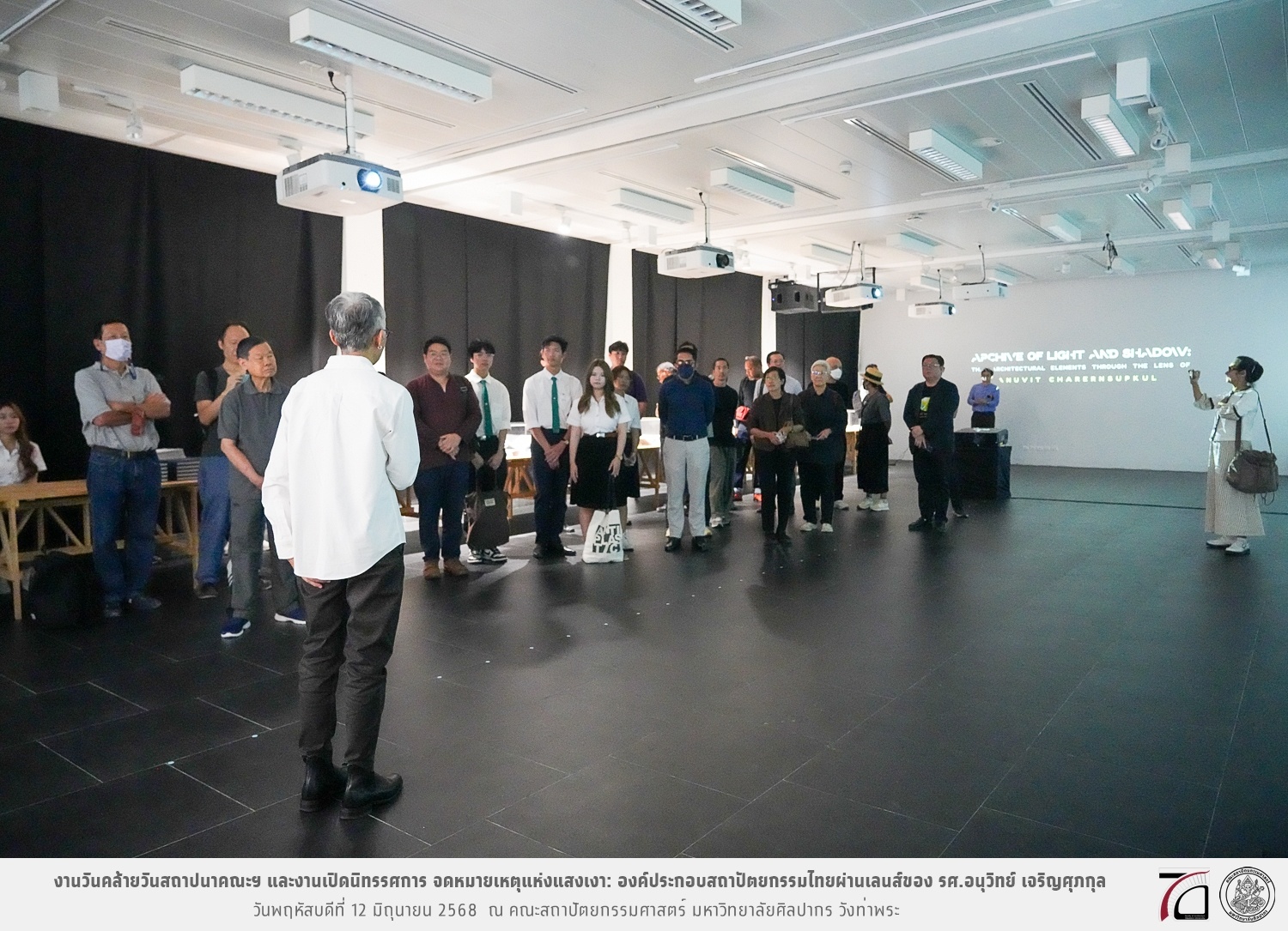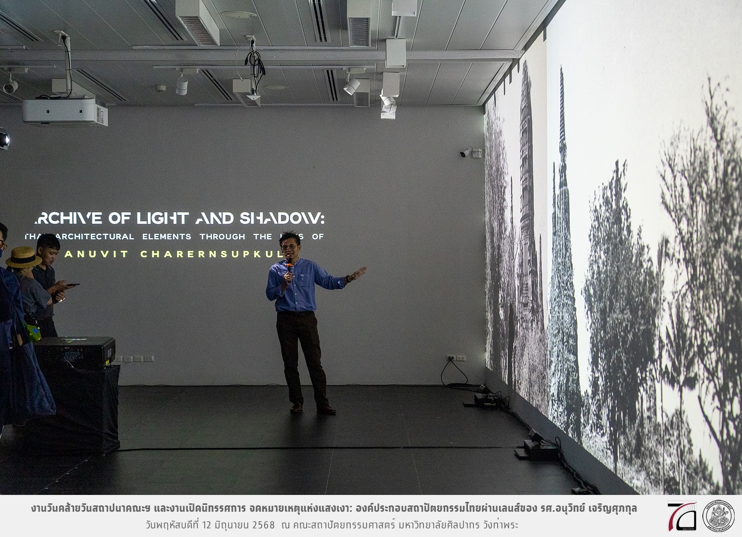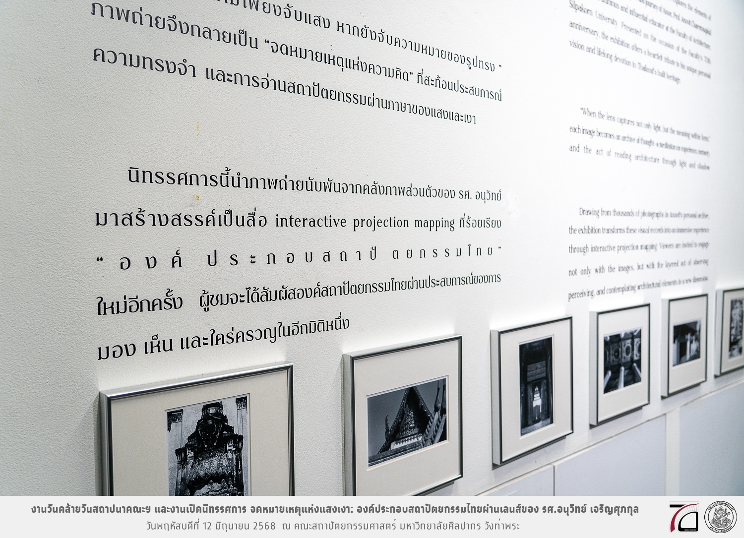 ภาพบรรยากาศงานวันคล้ายวันสถาปนาคณะฯ ในโอกาสก้าวเข้าสู่ปีที่ 71 เมื่อวันพฤหัสบดีที่ 12 มิถุนายน 2568 และมีการเปิดนิทรรศการ จดหมายเหตุแห่งแสงเงา: องค์ประกอบสถาปัตยกรรมไทยผ่านเลนส์ของ รศ.อนุวิทย์ เจริญศุภกุล และเสวนาหัวข้อ “ในแสงมีนัย: บทสนทนากับ รศ. อนุวิทย์ เจริญศุภกุล In Light, There Is Insight: A Conversation with Assoc. Prof. Anuwit Charoensupakul ณ หอศิลปะสถาปัตยกรรมพระพรหมพิจิตร (ห้อง 104) คณะสถาปัตยกรรมศาสตร์