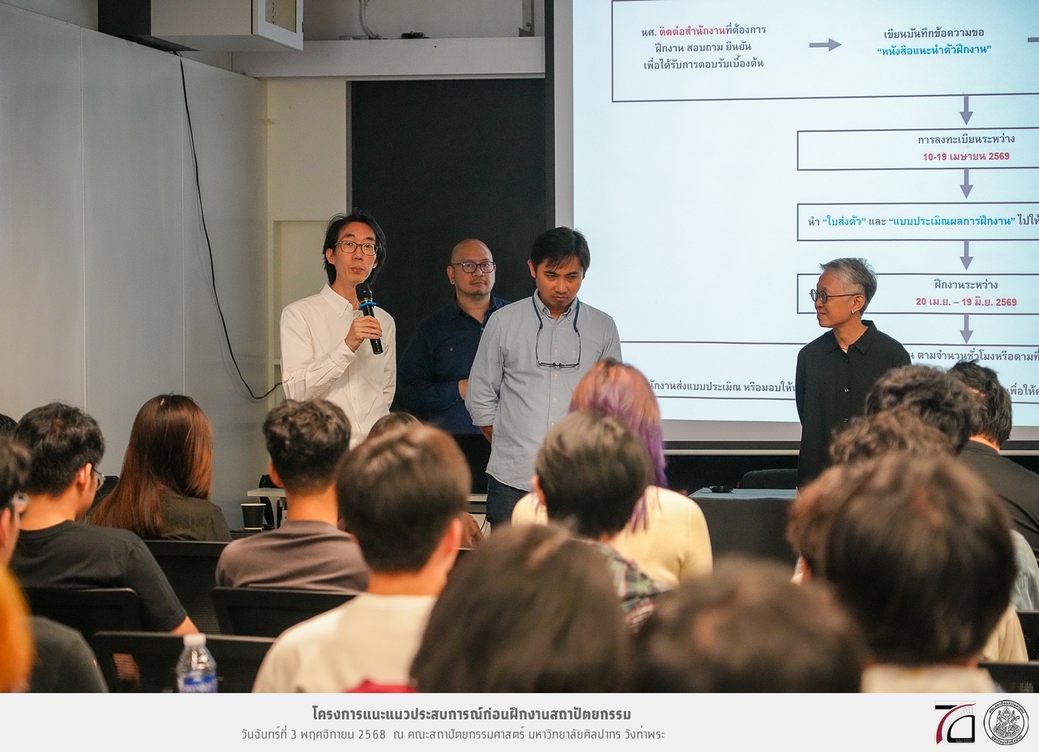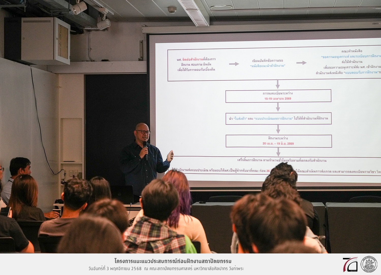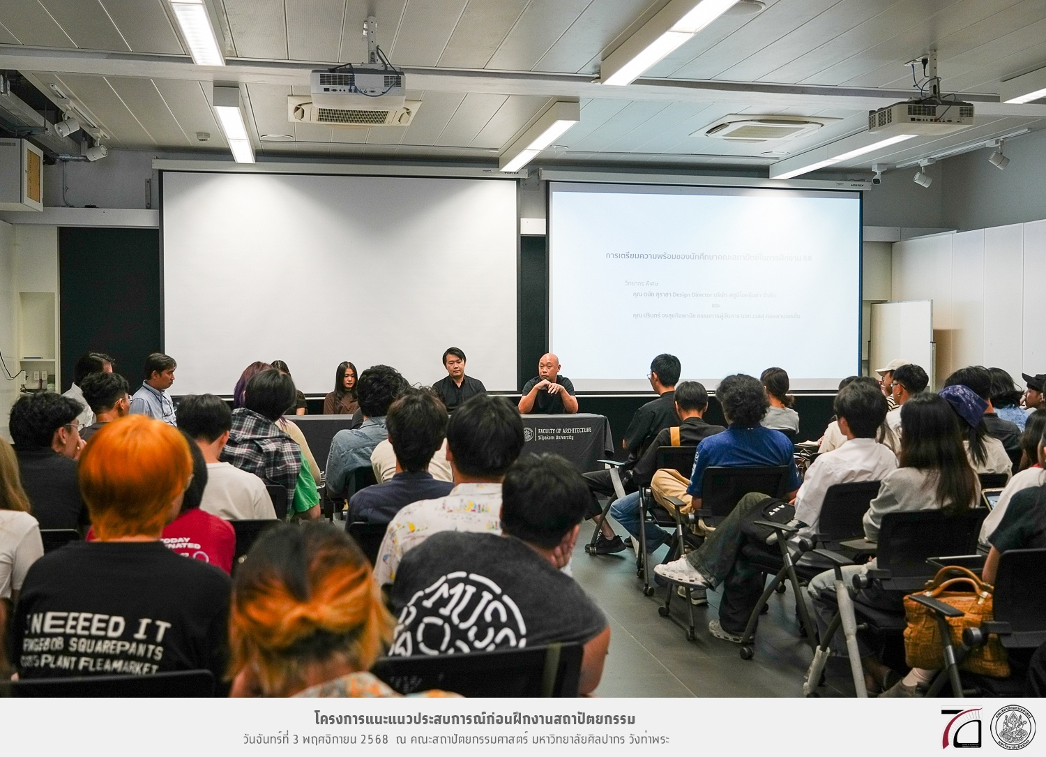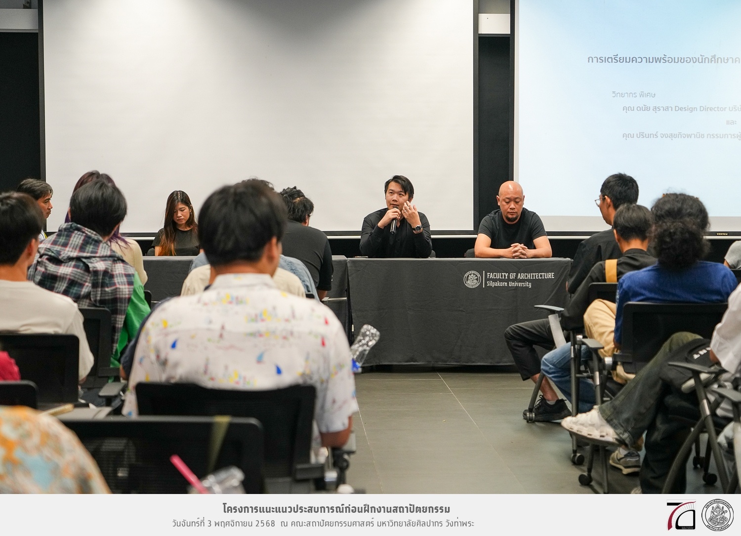 คณะสถาปัตยกรรมศาสตร์ มหาวิทยาลัยศิลปากร จัดกิจกรรมแนะแนวประสบการณ์ก่อนฝึกงานสถาปัตยกรรม เมื่อวันจันทร์ที่ 3 พฤศจิกายน 2568 แก่นักศึกษาชั้นปีที่ 4 หลักสูตรสถาปัตยกรรมศาสตรบัณฑิต สาขาวิชาสถาปัตยกรรม และสาขาวิชาสถาปัตยกรรมไทย เพื่อเป็นแนวทางในการเตรียมความพร้อมของนักศึกษาในการออกไปฝึกประสบการณ์วิชาชีพก่อนที่จะสำเร็จการศึกษา ซึ่งต้องฝึกงานสถาปัตยกรรมภาคปฏิบัติด้านการออกแบบ เขียนแบบ ปฏิบัติงานด้านวิจัย หรือควบคุมการก่อสร้างทั้งในหน่วยงานราชการและบริษัทเอกชน หรือสำนักงานที่ดำเนินธุรกิจเกี่ยวกับการปฏิบัติวิชาชีพสถาปัตยกรรม ในระหว่างภาคการศึกษาพิเศษฤดูร้อน