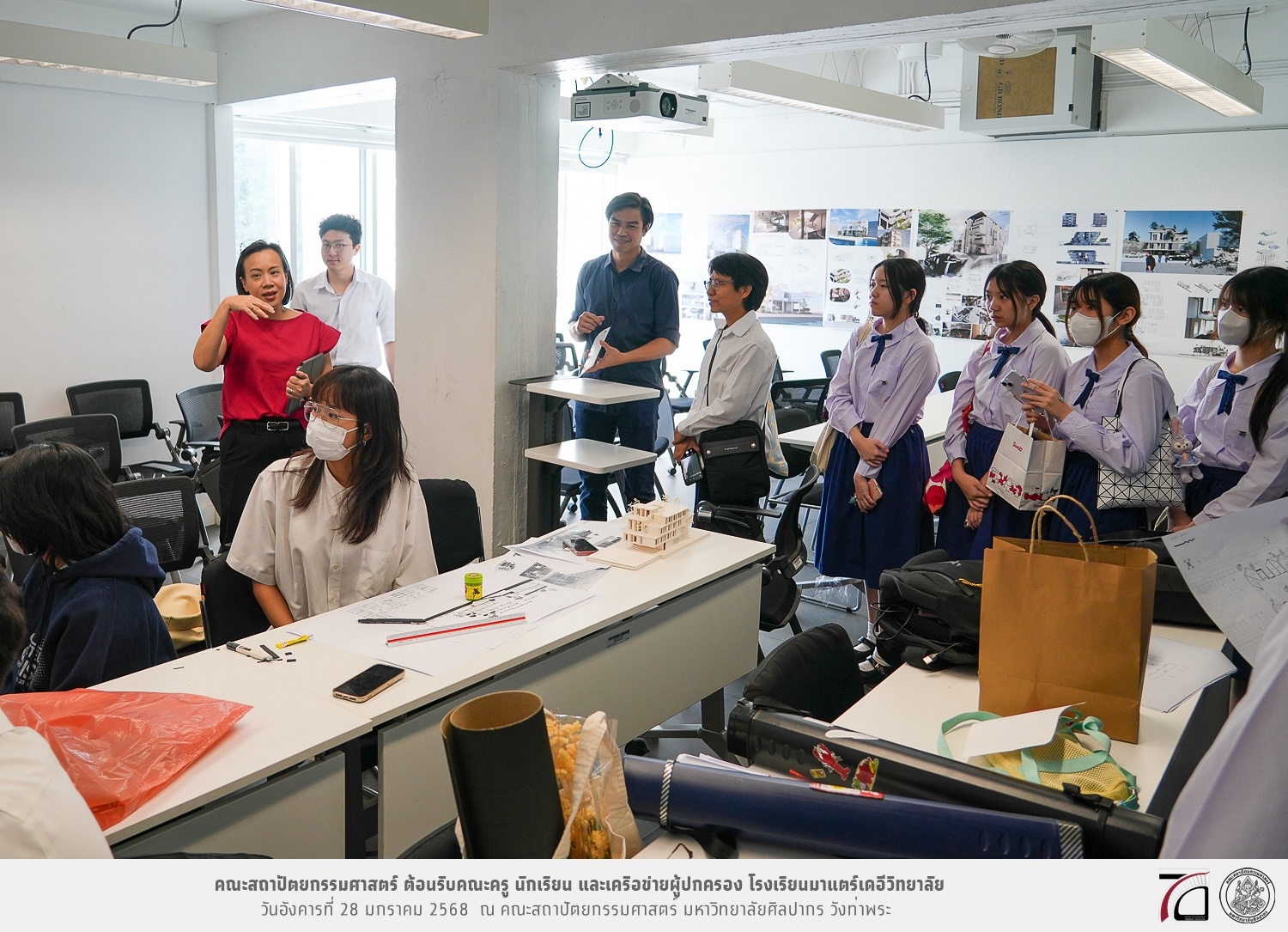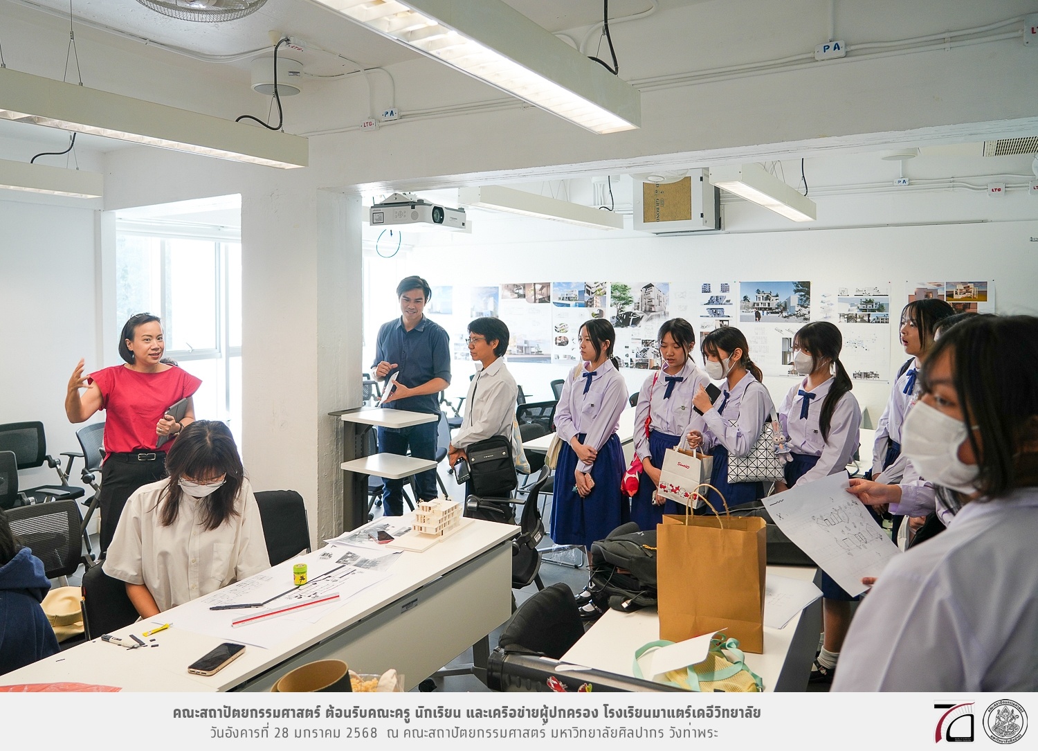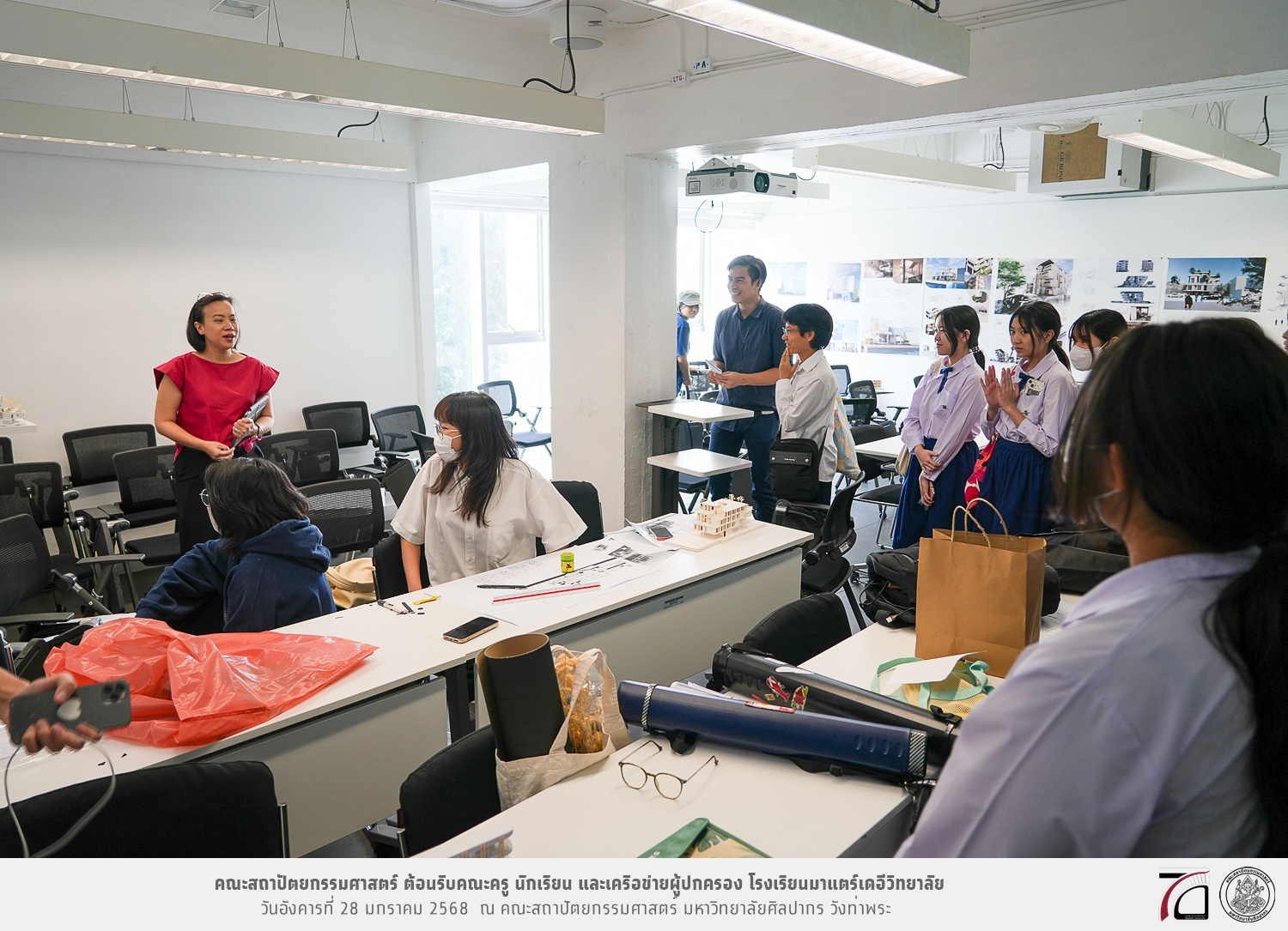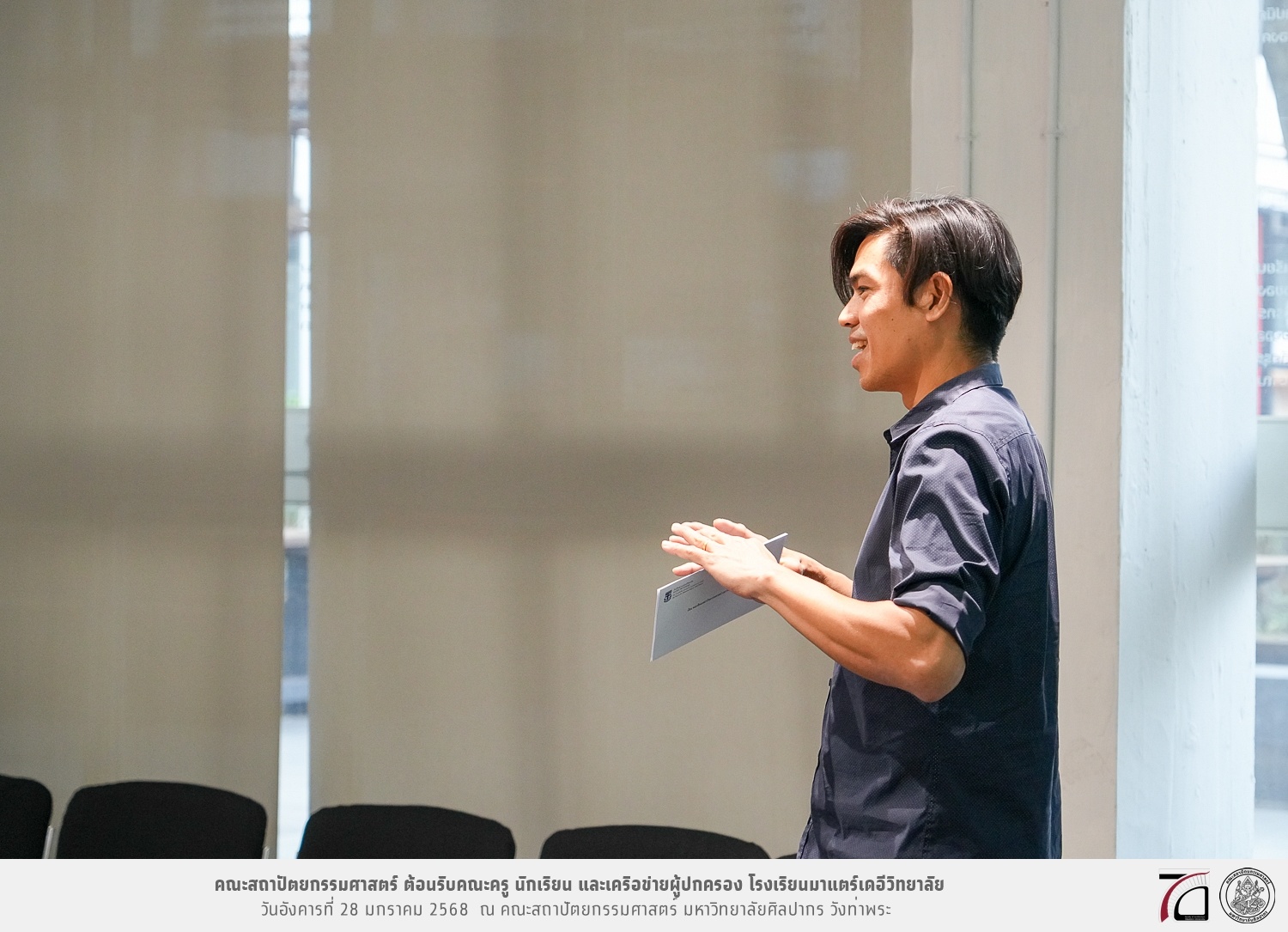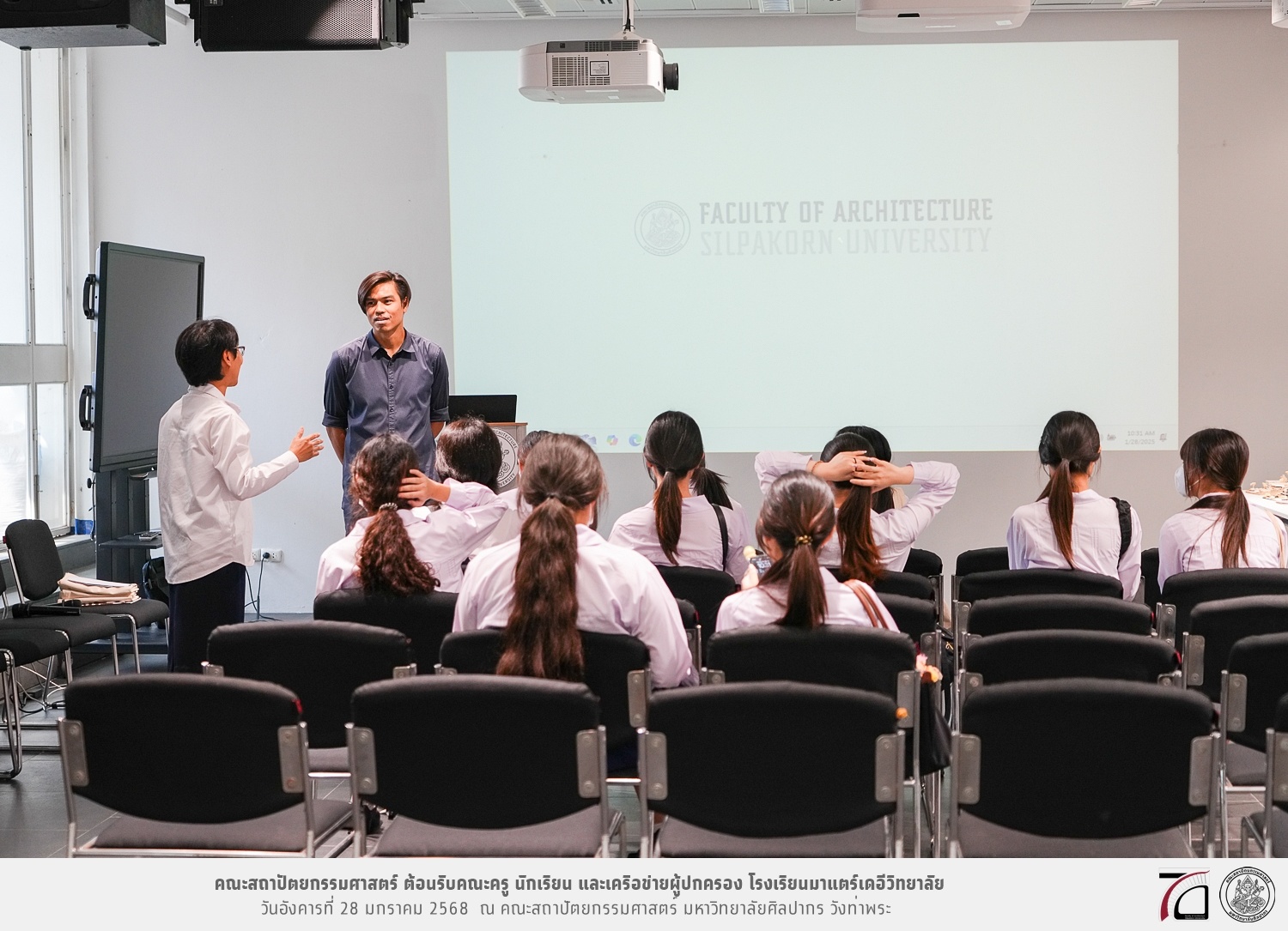 คณะครู นักเรียน และเครือข่ายผู้ปกครอง โรงเรียนมาแตร์เดอีวิทยาลัย เยี่ยมชมการเรียนการสอนคณะสถาปัตยกรรมศาสตร์ โดยมีผู้ช่วยศาสตราจารย์ ดร. เจนยุทธ ล่อใจ รองคณบดีฝ่ายกิจการนักศึกษา และผู้ช่วยศาสตราจารย์ ดร. ธาริณี รามสูต รองคณบดีฝ่ายวิชาการ ให้เกียรติแนะแนวการศึกษาต่อและนำชมคณะสถาปัตยกรรมศาสตร์ และบรรยากาศโดยรอบของมหาวิทยาลัยศิลปากร วังท่าพระ เมื่อวันอังคารที่ 28 มกราคม 2568 ณ คณะสถาปัตยกรรมศาสตร์ มหาวิทยาลัยศิลปากร วังท่าพระ