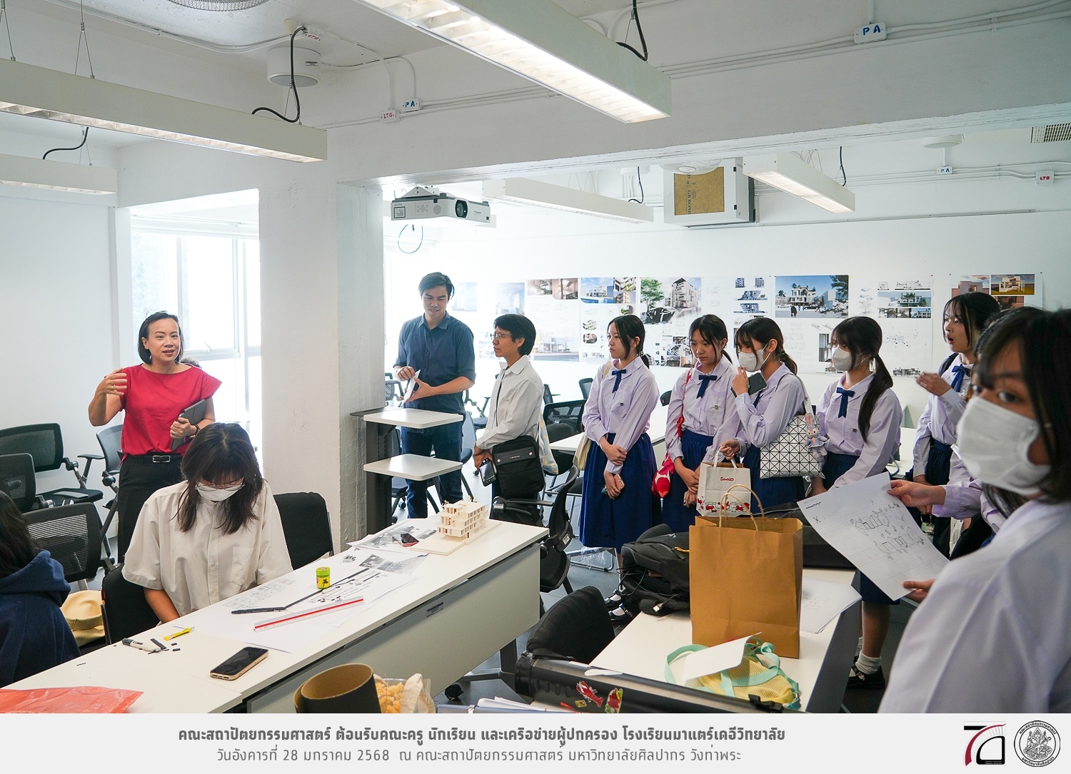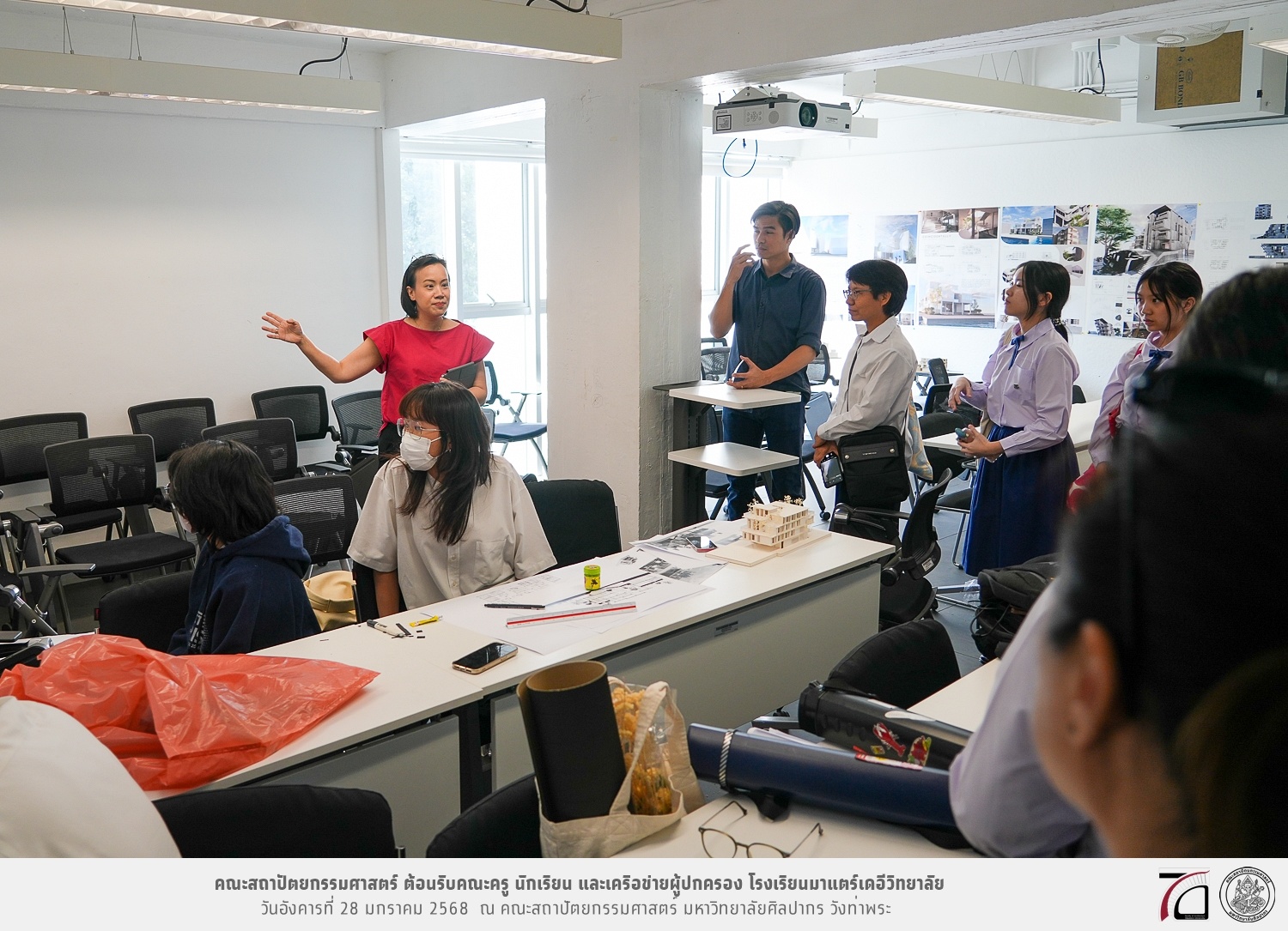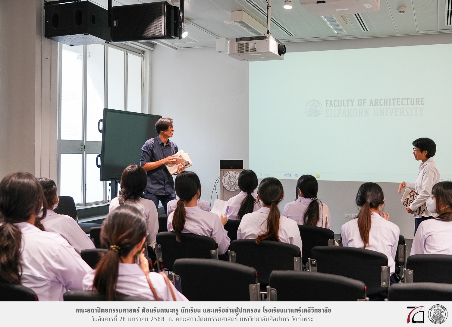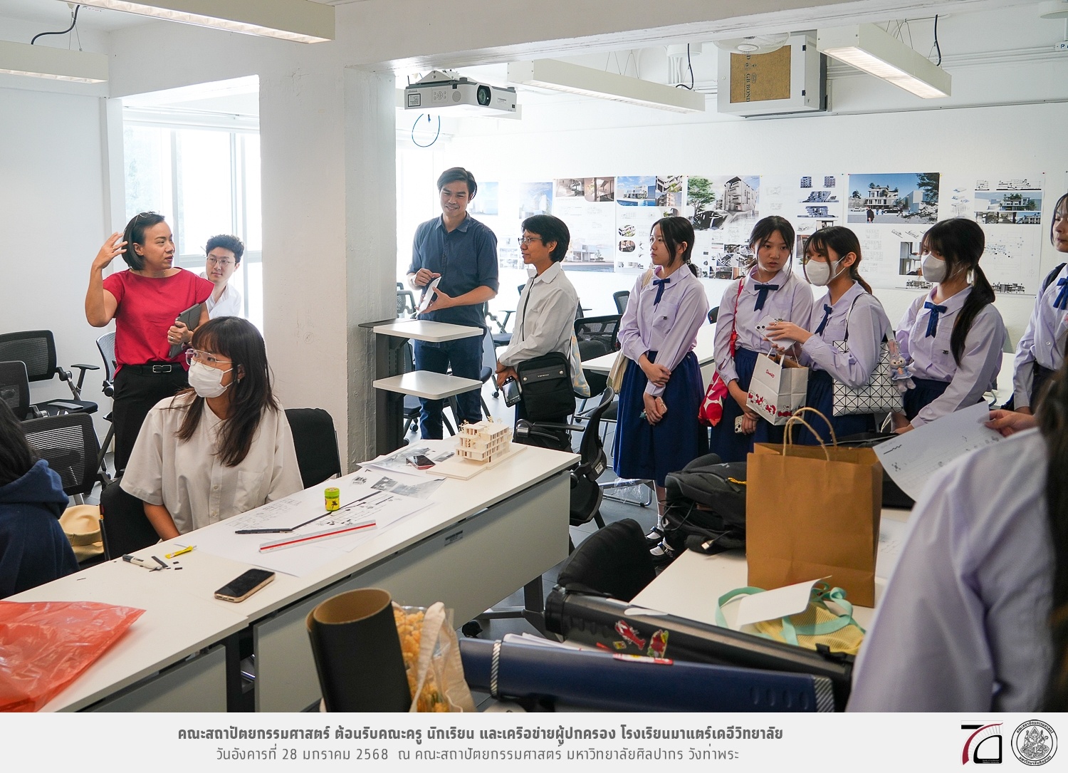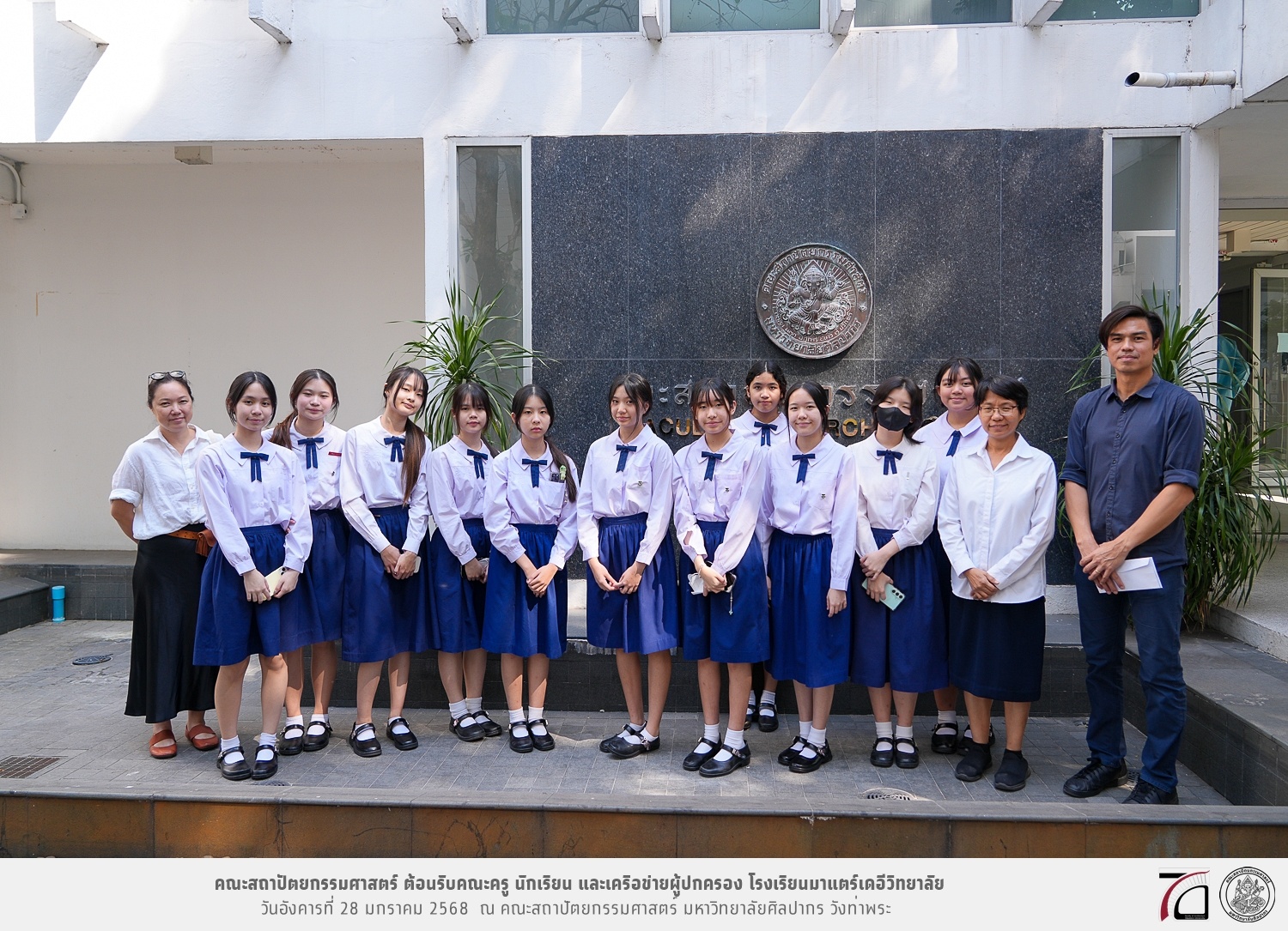คณะครู นักเรียน และเครือข่ายผู้ปกครอง โรงเรียนมาแตร์เดอีวิทยาลัย เยี่ยมชมการเรียนการสอนคณะสถาปัตยกรรมศาสตร์ โดยมีผู้ช่วยศาสตราจารย์ ดร. เจนยุทธ ล่อใจ รองคณบดีฝ่ายกิจการนักศึกษา และผู้ช่วยศาสตราจารย์ ดร. ธาริณี รามสูต รองคณบดีฝ่ายวิชาการ ให้เกียรติแนะแนวการศึกษาต่อและนำชมคณะสถาปัตยกรรมศาสตร์ และบรรยากาศโดยรอบของมหาวิทยาลัยศิลปากร วังท่าพระ เมื่อวันอังคารที่ 28 มกราคม 2568 ณ คณะสถาปัตยกรรมศาสตร์ มหาวิทยาลัยศิลปากร วังท่าพระ