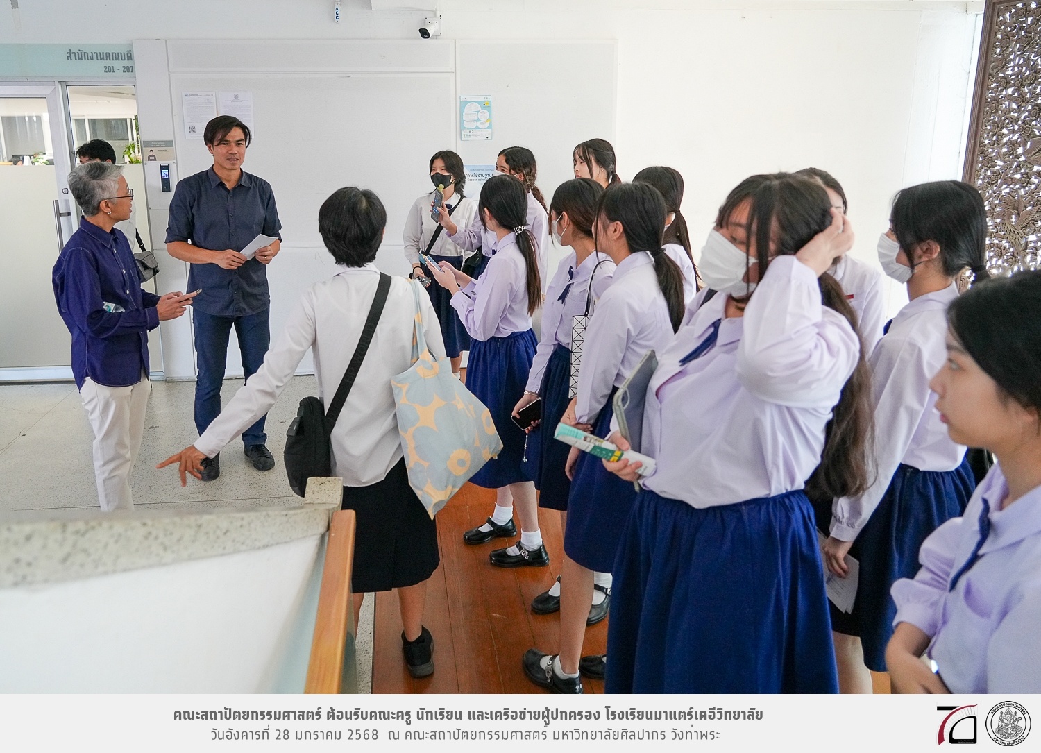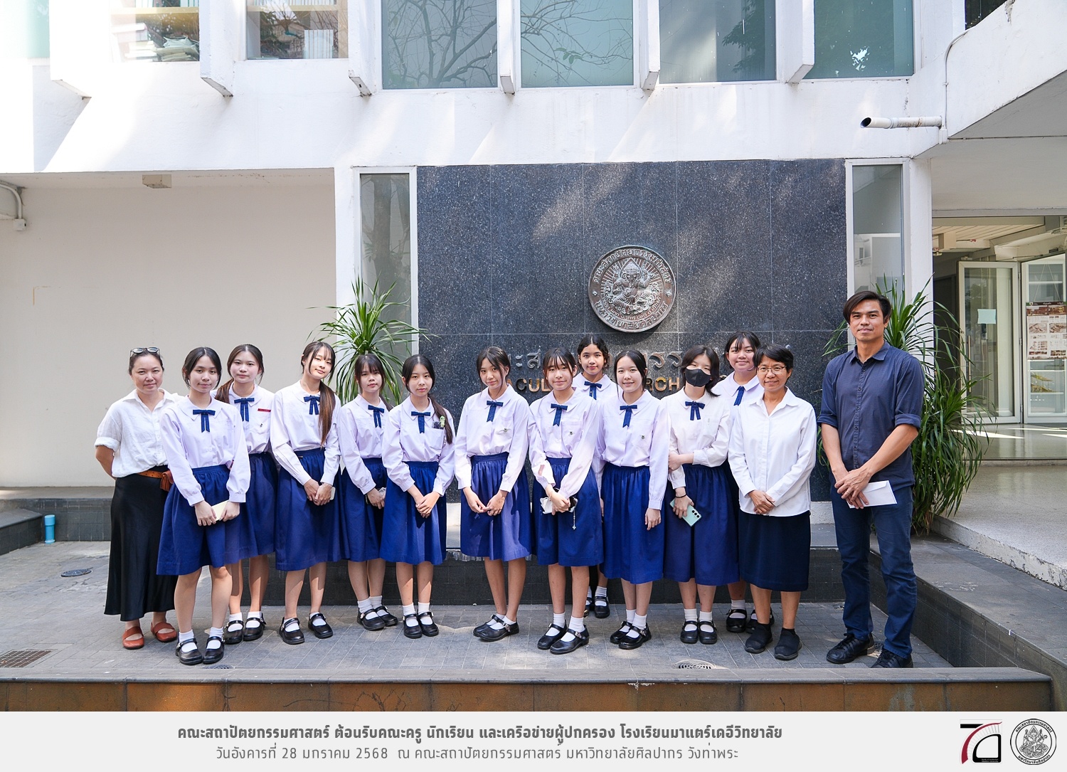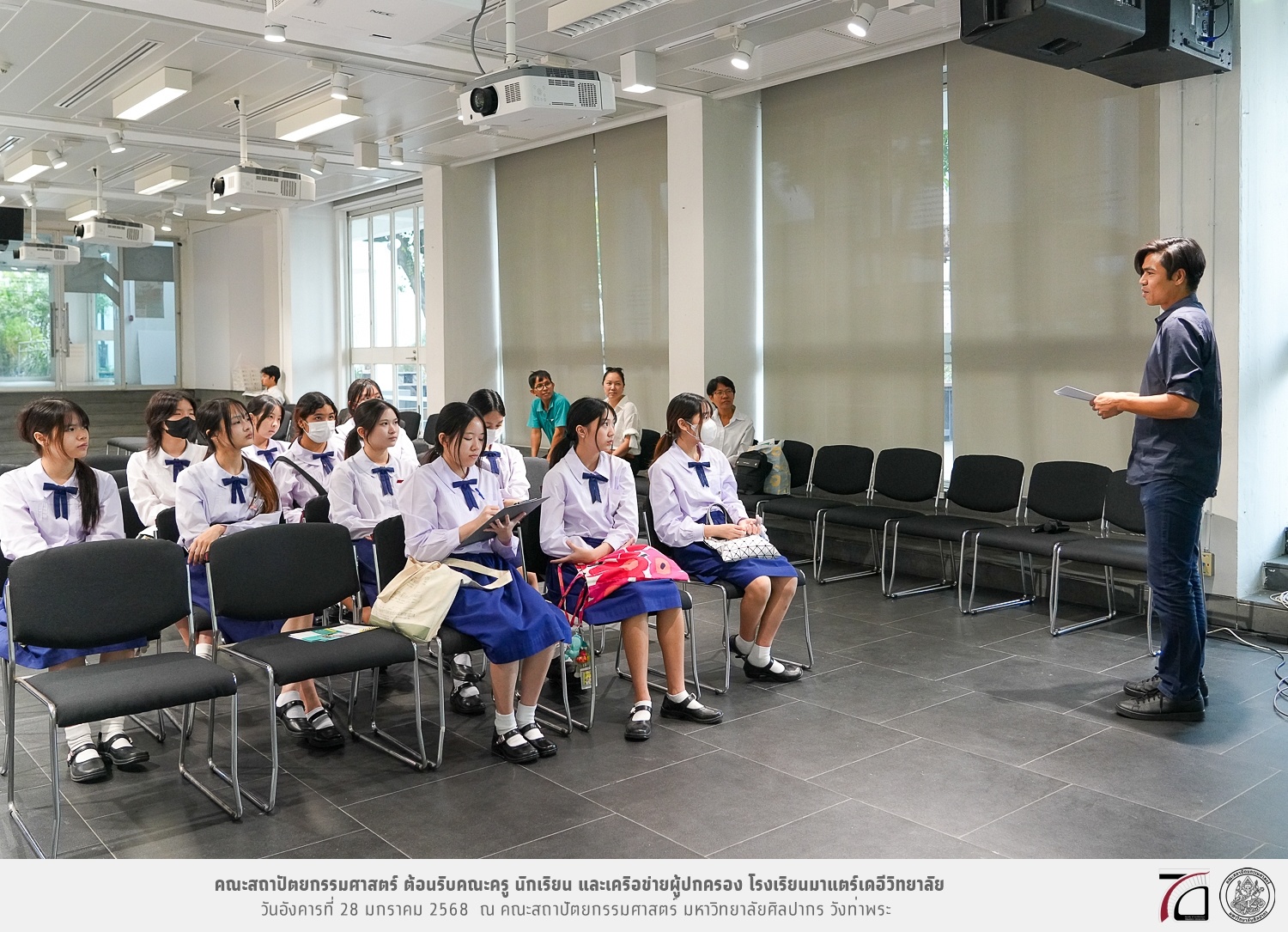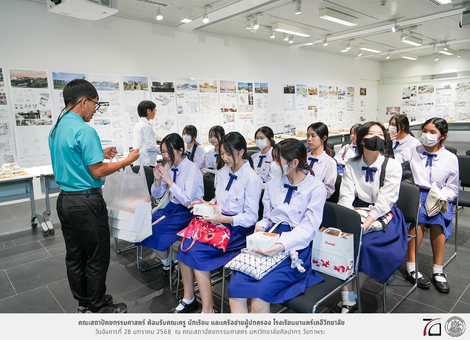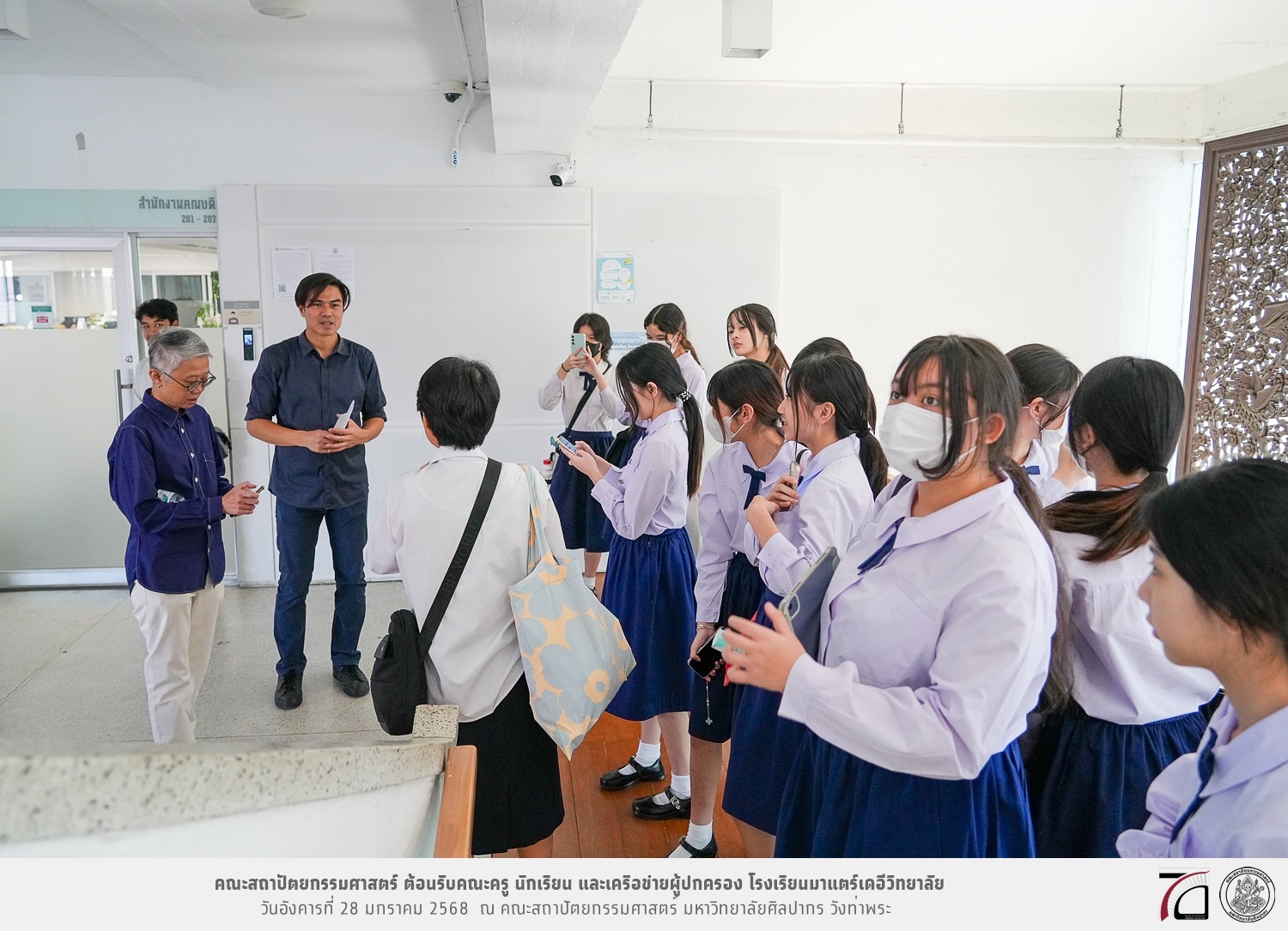คณะครู นักเรียน และเครือข่ายผู้ปกครอง โรงเรียนมาแตร์เดอีวิทยาลัย เยี่ยมชมการเรียนการสอนคณะสถาปัตยกรรมศาสตร์ โดยมีผู้ช่วยศาสตราจารย์ ดร. เจนยุทธ ล่อใจ รองคณบดีฝ่ายกิจการนักศึกษา และผู้ช่วยศาสตราจารย์ ดร. ธาริณี รามสูต รองคณบดีฝ่ายวิชาการ ให้เกียรติแนะแนวการศึกษาต่อและนำชมคณะสถาปัตยกรรมศาสตร์ และบรรยากาศโดยรอบของมหาวิทยาลัยศิลปากร วังท่าพระ เมื่อวันอังคารที่ 28 มกราคม 2568 ณ คณะสถาปัตยกรรมศาสตร์ มหาวิทยาลัยศิลปากร วังท่าพระ