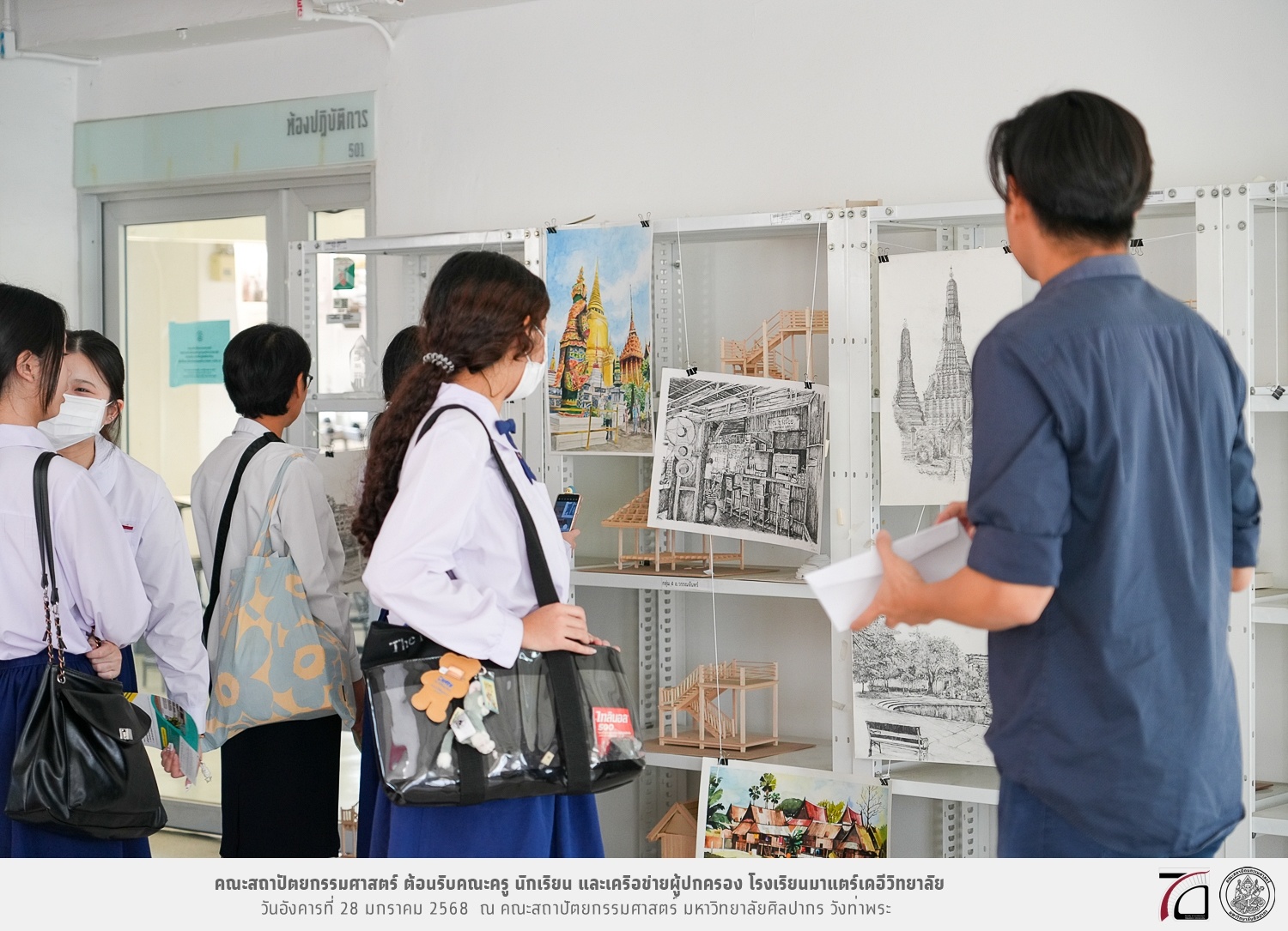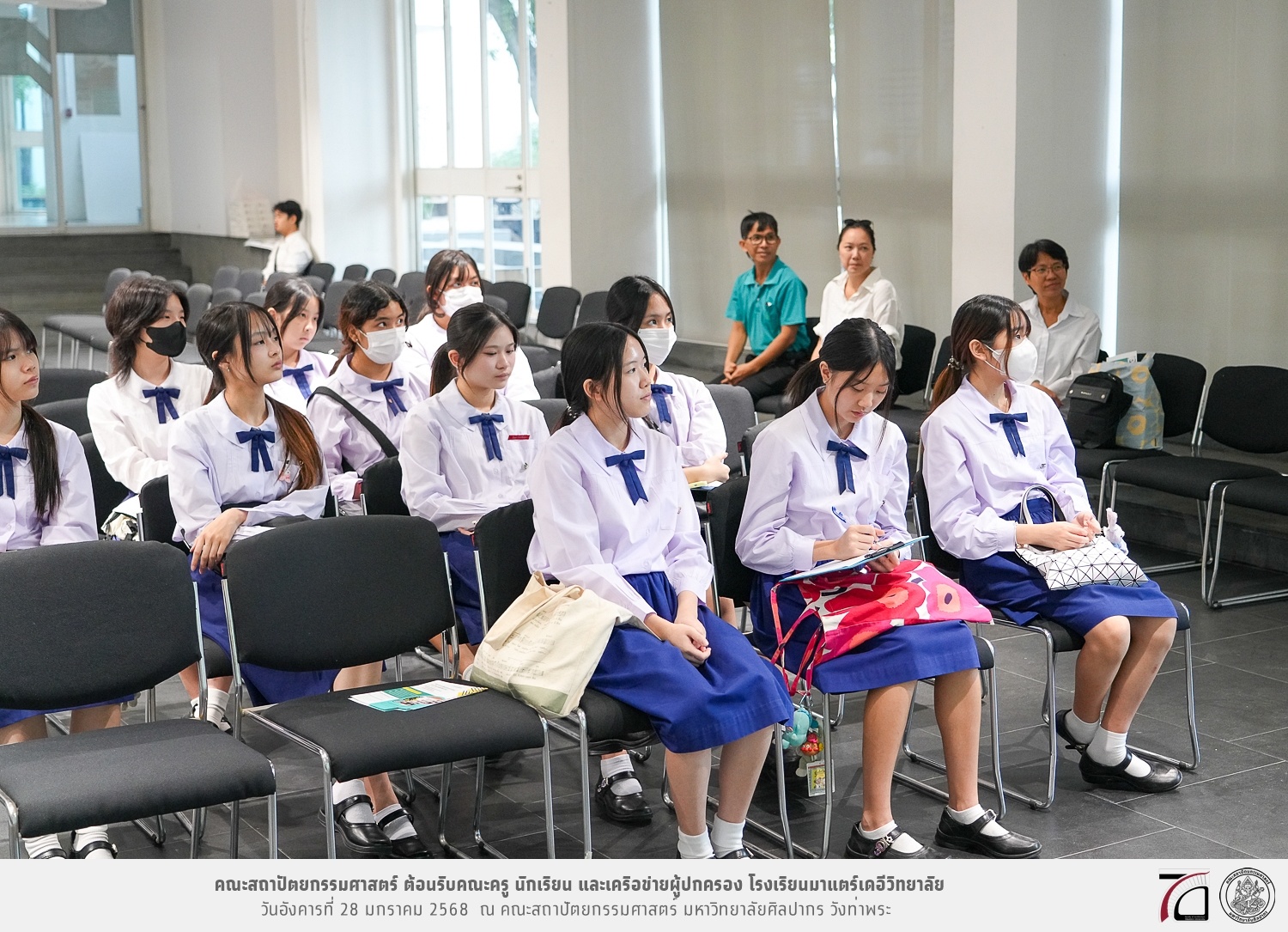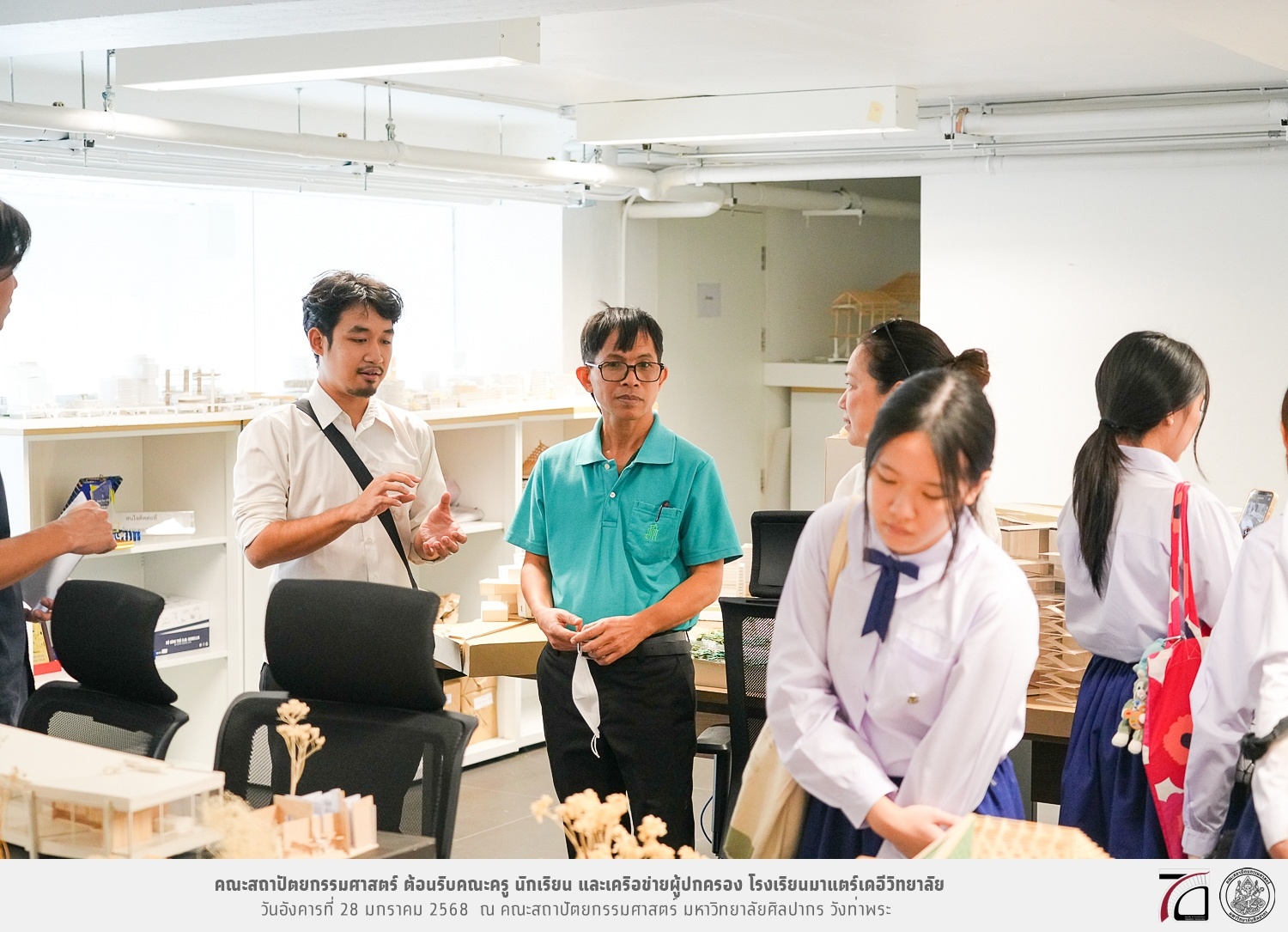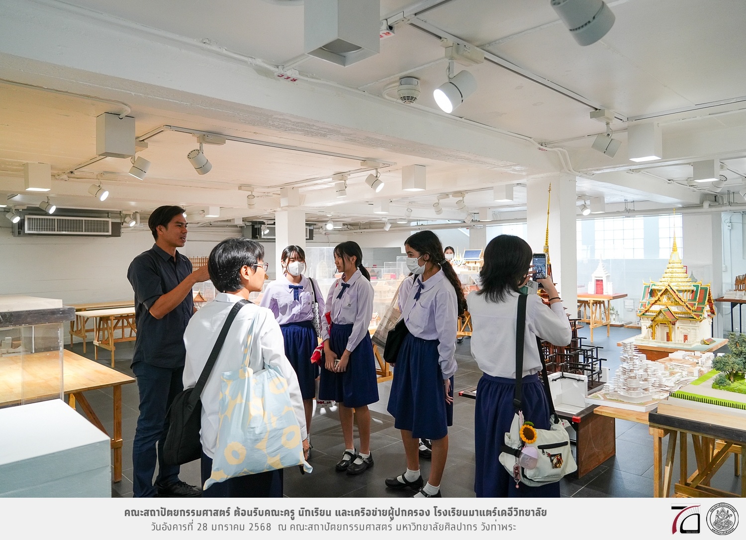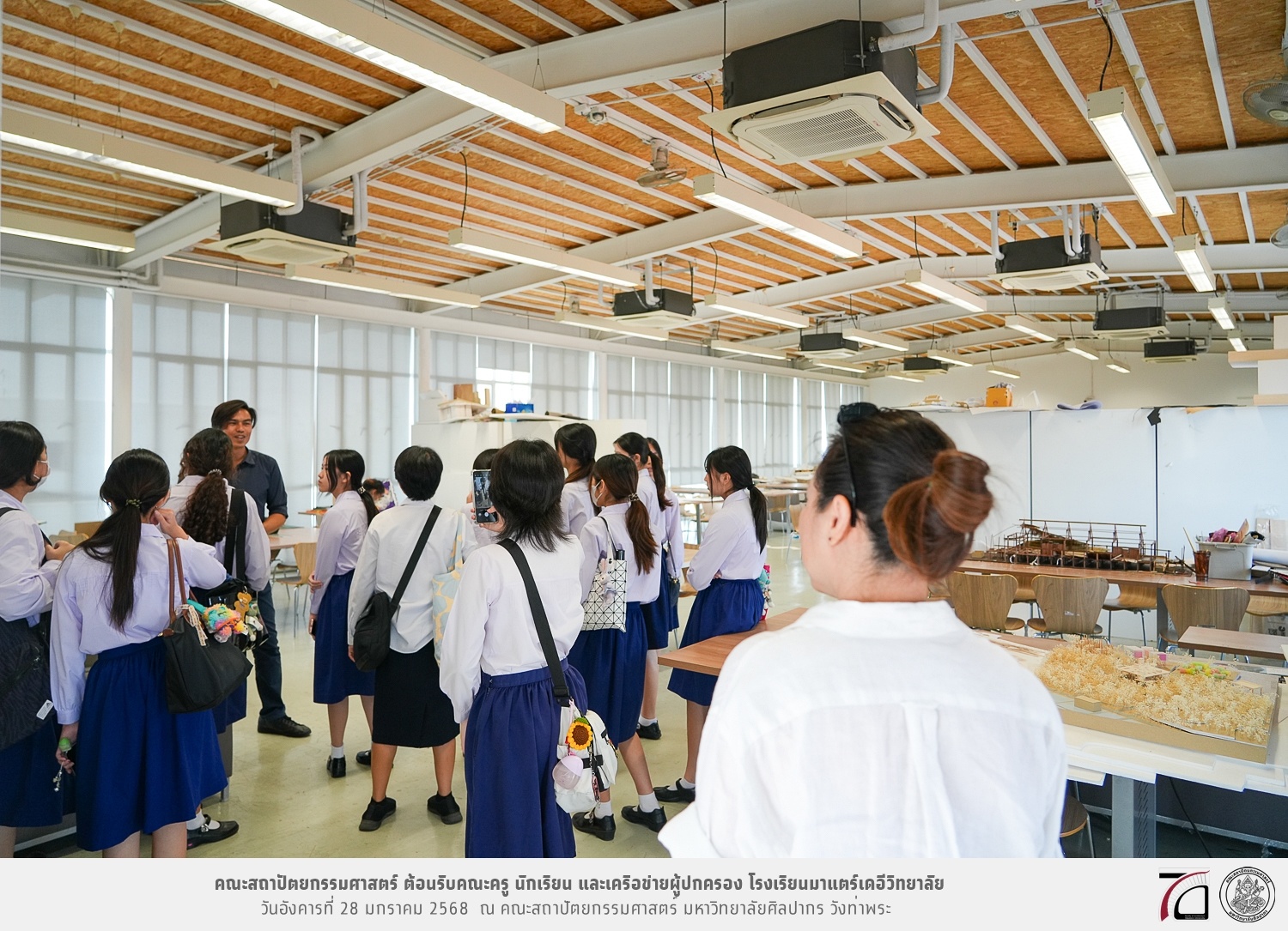 คณะครู นักเรียน และเครือข่ายผู้ปกครอง โรงเรียนมาแตร์เดอีวิทยาลัย เยี่ยมชมการเรียนการสอนคณะสถาปัตยกรรมศาสตร์ โดยมีผู้ช่วยศาสตราจารย์ ดร. เจนยุทธ ล่อใจ รองคณบดีฝ่ายกิจการนักศึกษา และผู้ช่วยศาสตราจารย์ ดร. ธาริณี รามสูต รองคณบดีฝ่ายวิชาการ ให้เกียรติแนะแนวการศึกษาต่อและนำชมคณะสถาปัตยกรรมศาสตร์ และบรรยากาศโดยรอบของมหาวิทยาลัยศิลปากร วังท่าพระ เมื่อวันอังคารที่ 28 มกราคม 2568 ณ คณะสถาปัตยกรรมศาสตร์ มหาวิทยาลัยศิลปากร วังท่าพระ