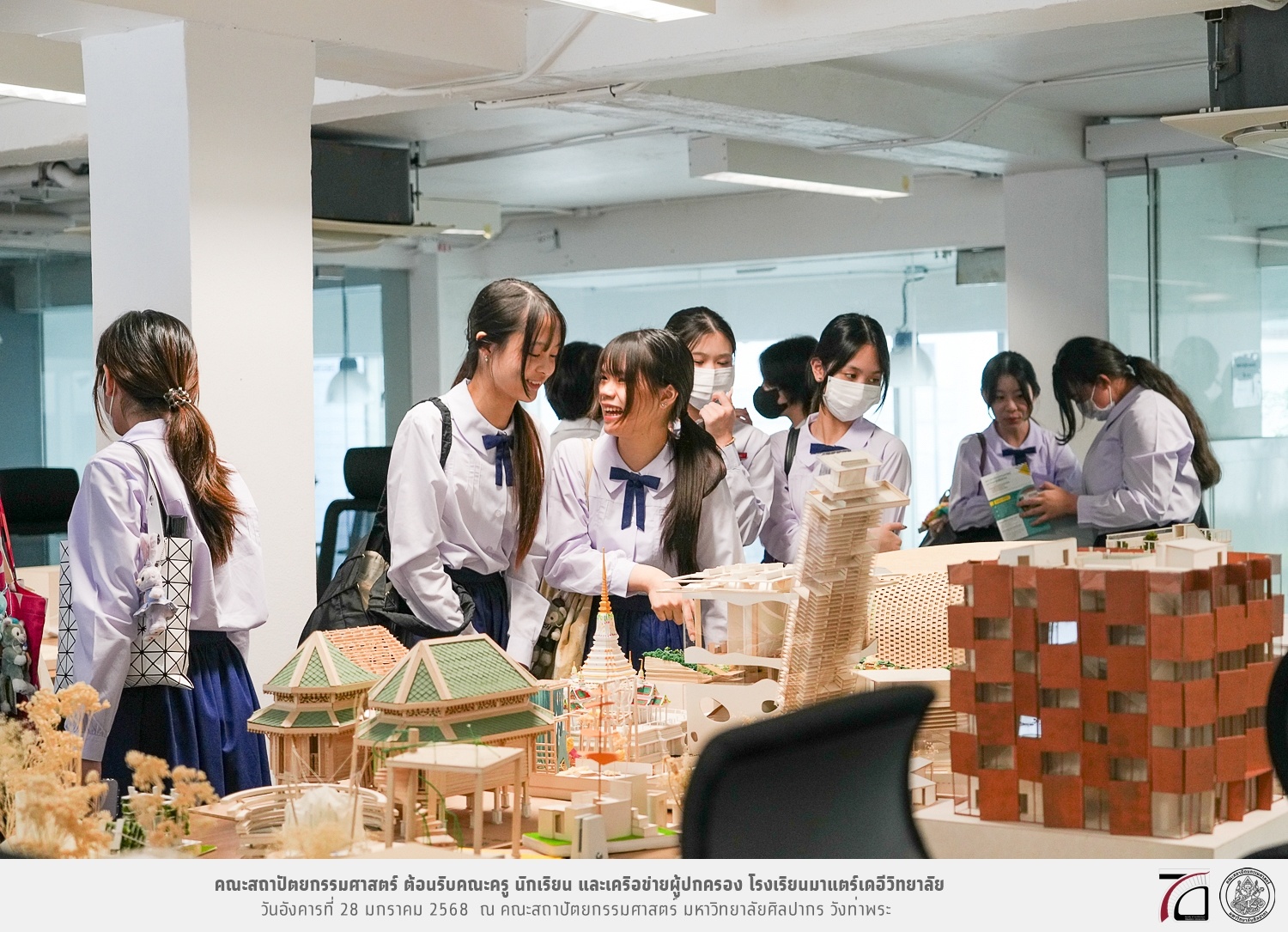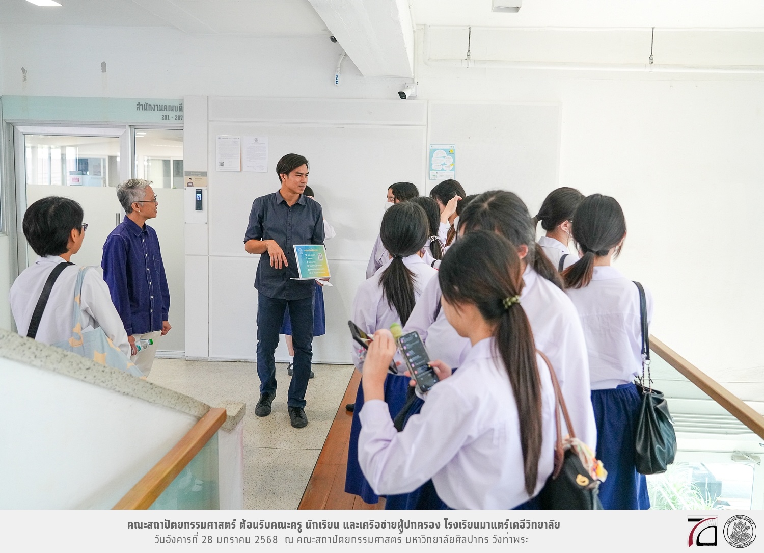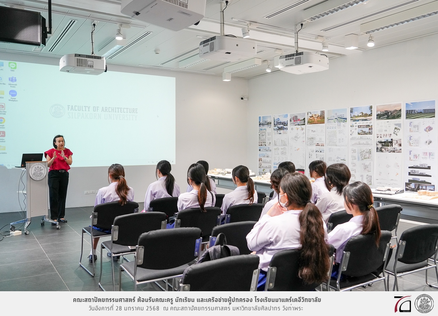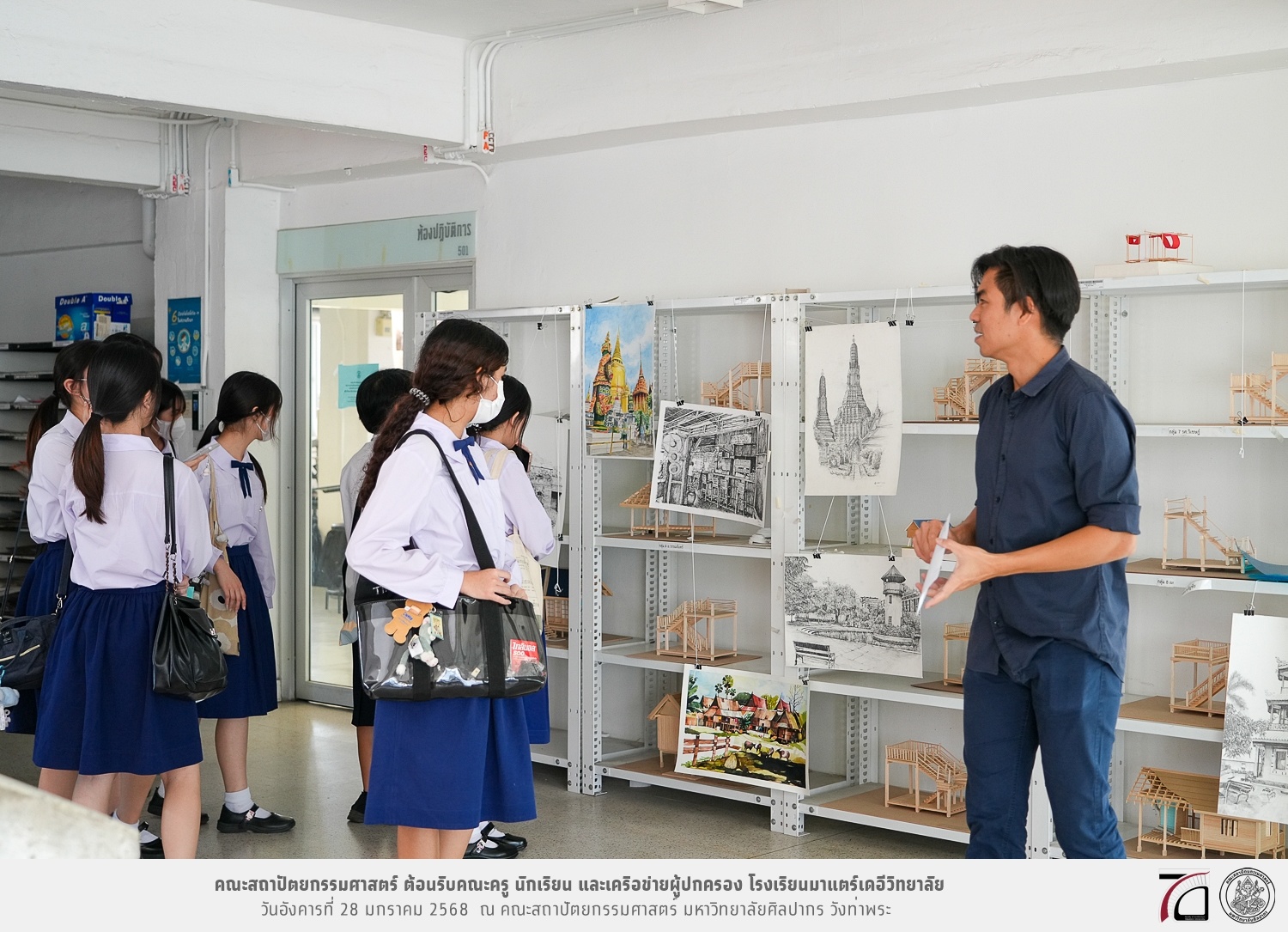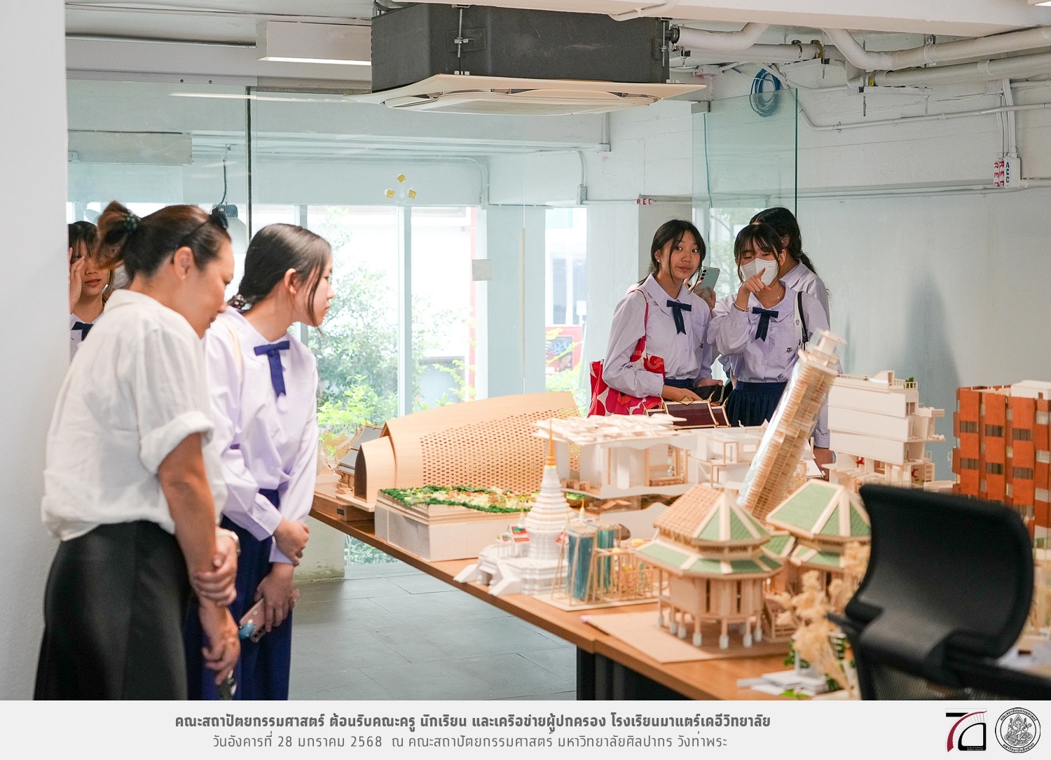 คณะครู นักเรียน และเครือข่ายผู้ปกครอง โรงเรียนมาแตร์เดอีวิทยาลัย เยี่ยมชมการเรียนการสอนคณะสถาปัตยกรรมศาสตร์ โดยมีผู้ช่วยศาสตราจารย์ ดร. เจนยุทธ ล่อใจ รองคณบดีฝ่ายกิจการนักศึกษา และผู้ช่วยศาสตราจารย์ ดร. ธาริณี รามสูต รองคณบดีฝ่ายวิชาการ ให้เกียรติแนะแนวการศึกษาต่อและนำชมคณะสถาปัตยกรรมศาสตร์ และบรรยากาศโดยรอบของมหาวิทยาลัยศิลปากร วังท่าพระ เมื่อวันอังคารที่ 28 มกราคม 2568 ณ คณะสถาปัตยกรรมศาสตร์ มหาวิทยาลัยศิลปากร วังท่าพระ