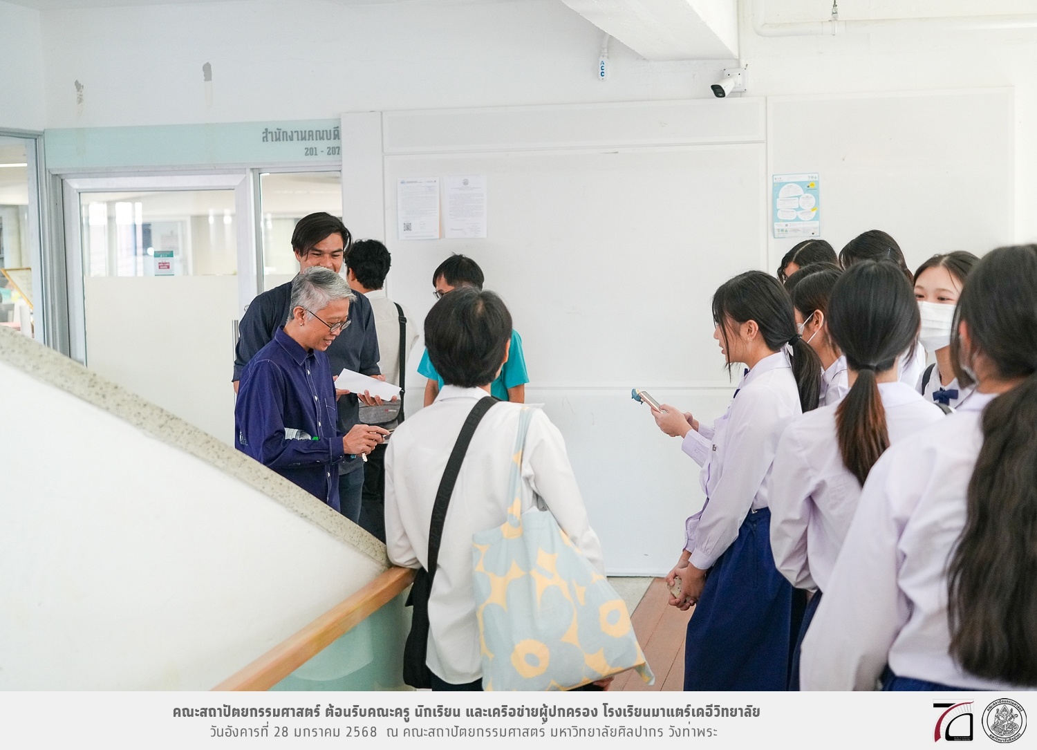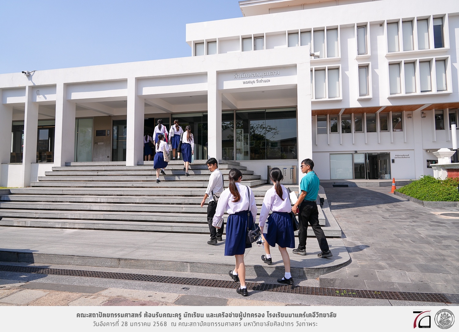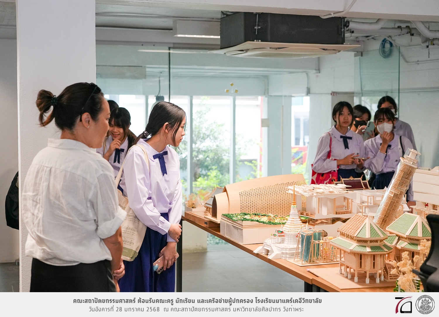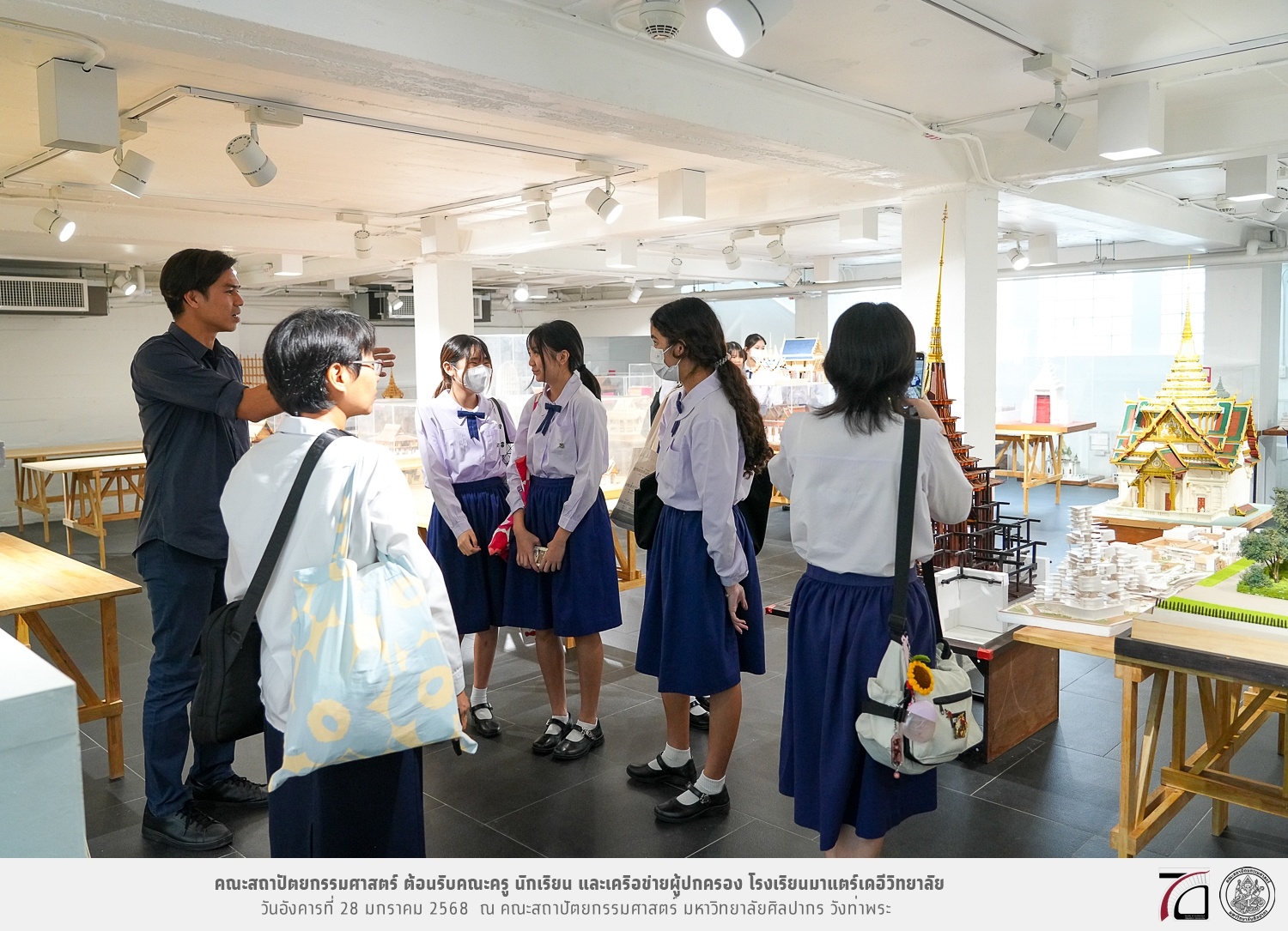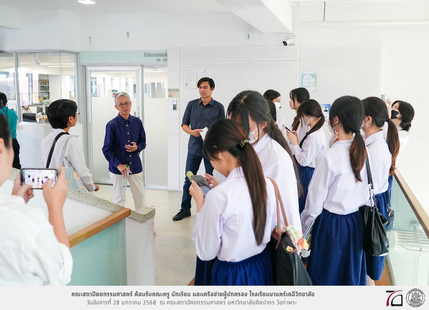 คณะครู นักเรียน และเครือข่ายผู้ปกครอง โรงเรียนมาแตร์เดอีวิทยาลัย เยี่ยมชมการเรียนการสอนคณะสถาปัตยกรรมศาสตร์ โดยมีผู้ช่วยศาสตราจารย์ ดร. เจนยุทธ ล่อใจ รองคณบดีฝ่ายกิจการนักศึกษา และผู้ช่วยศาสตราจารย์ ดร. ธาริณี รามสูต รองคณบดีฝ่ายวิชาการ ให้เกียรติแนะแนวการศึกษาต่อและนำชมคณะสถาปัตยกรรมศาสตร์ และบรรยากาศโดยรอบของมหาวิทยาลัยศิลปากร วังท่าพระ เมื่อวันอังคารที่ 28 มกราคม 2568 ณ คณะสถาปัตยกรรมศาสตร์ มหาวิทยาลัยศิลปากร วังท่าพระ