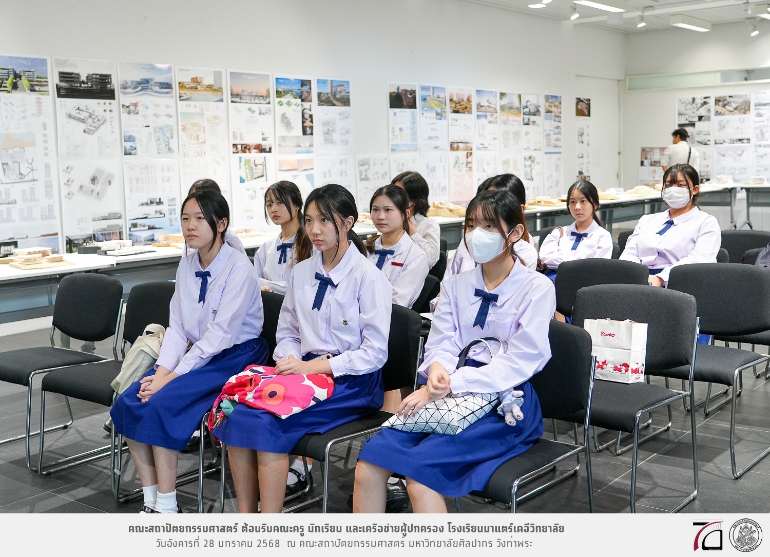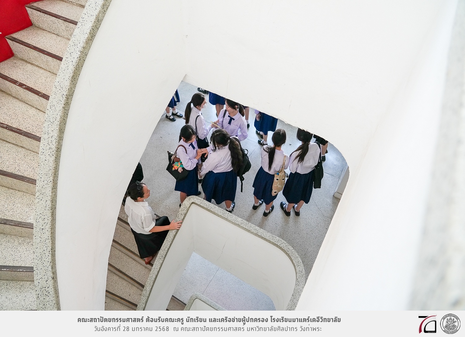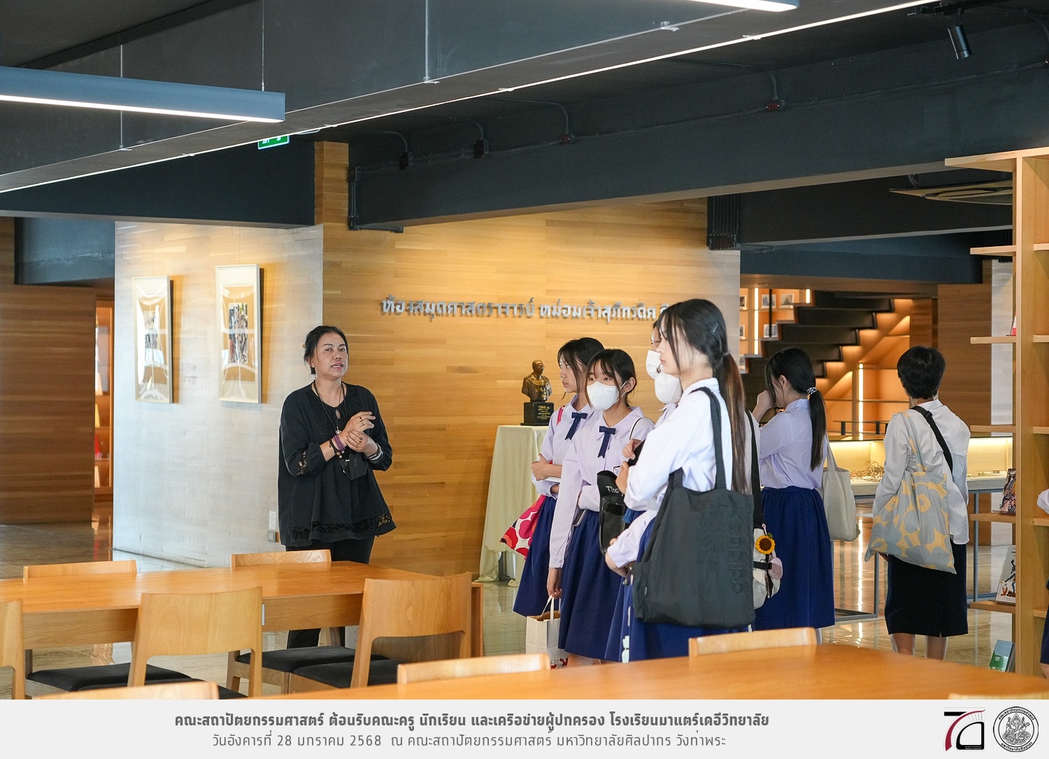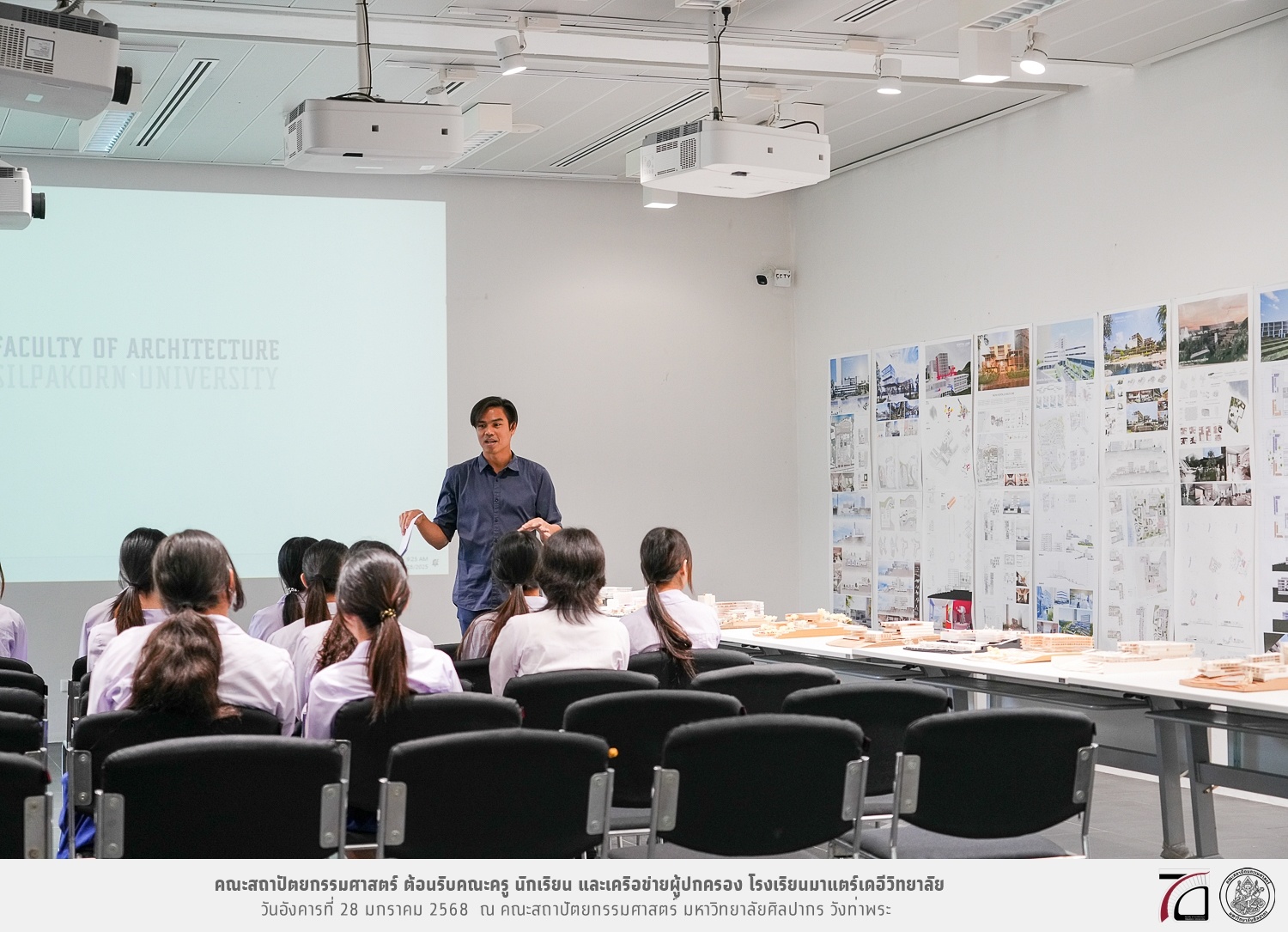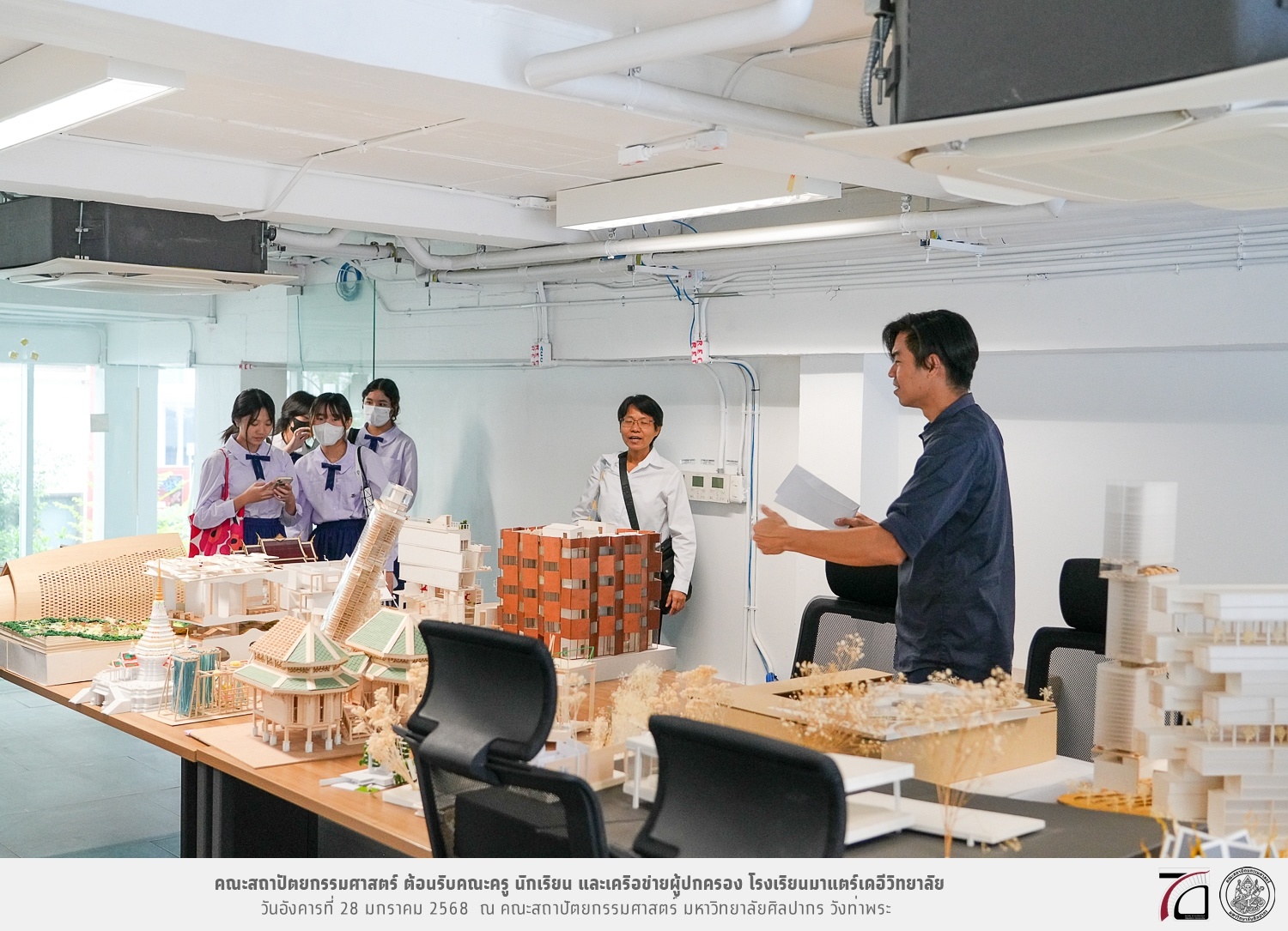 คณะครู นักเรียน และเครือข่ายผู้ปกครอง โรงเรียนมาแตร์เดอีวิทยาลัย เยี่ยมชมการเรียนการสอนคณะสถาปัตยกรรมศาสตร์ โดยมีผู้ช่วยศาสตราจารย์ ดร. เจนยุทธ ล่อใจ รองคณบดีฝ่ายกิจการนักศึกษา และผู้ช่วยศาสตราจารย์ ดร. ธาริณี รามสูต รองคณบดีฝ่ายวิชาการ ให้เกียรติแนะแนวการศึกษาต่อและนำชมคณะสถาปัตยกรรมศาสตร์ และบรรยากาศโดยรอบของมหาวิทยาลัยศิลปากร วังท่าพระ เมื่อวันอังคารที่ 28 มกราคม 2568 ณ คณะสถาปัตยกรรมศาสตร์ มหาวิทยาลัยศิลปากร วังท่าพระ
