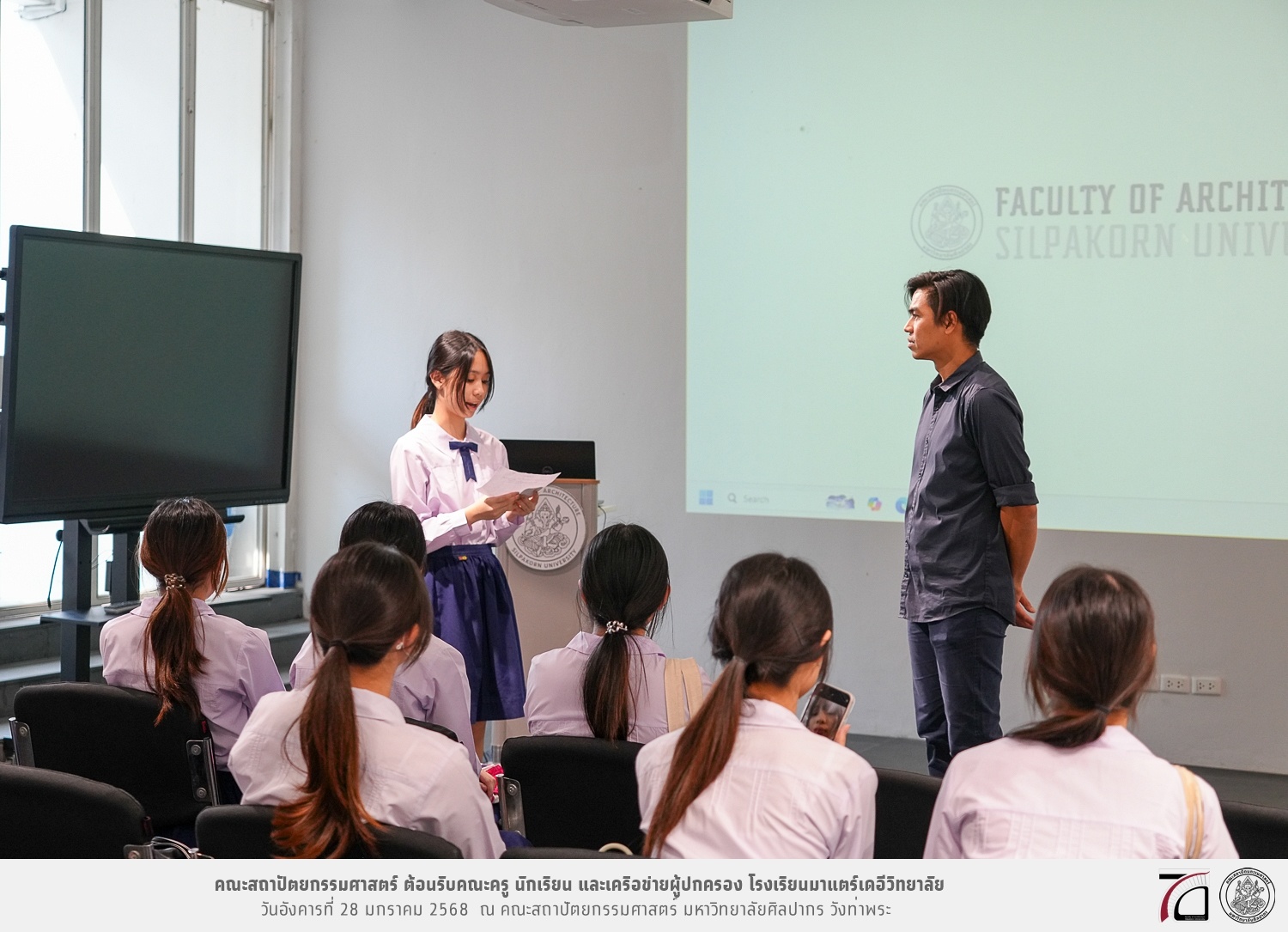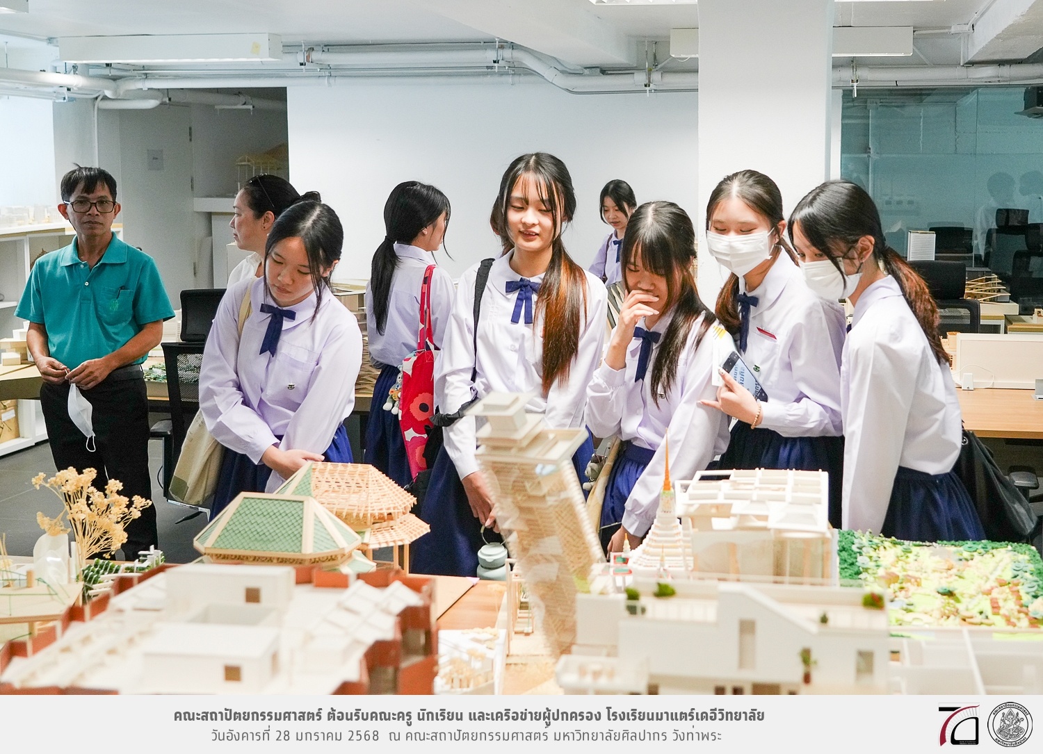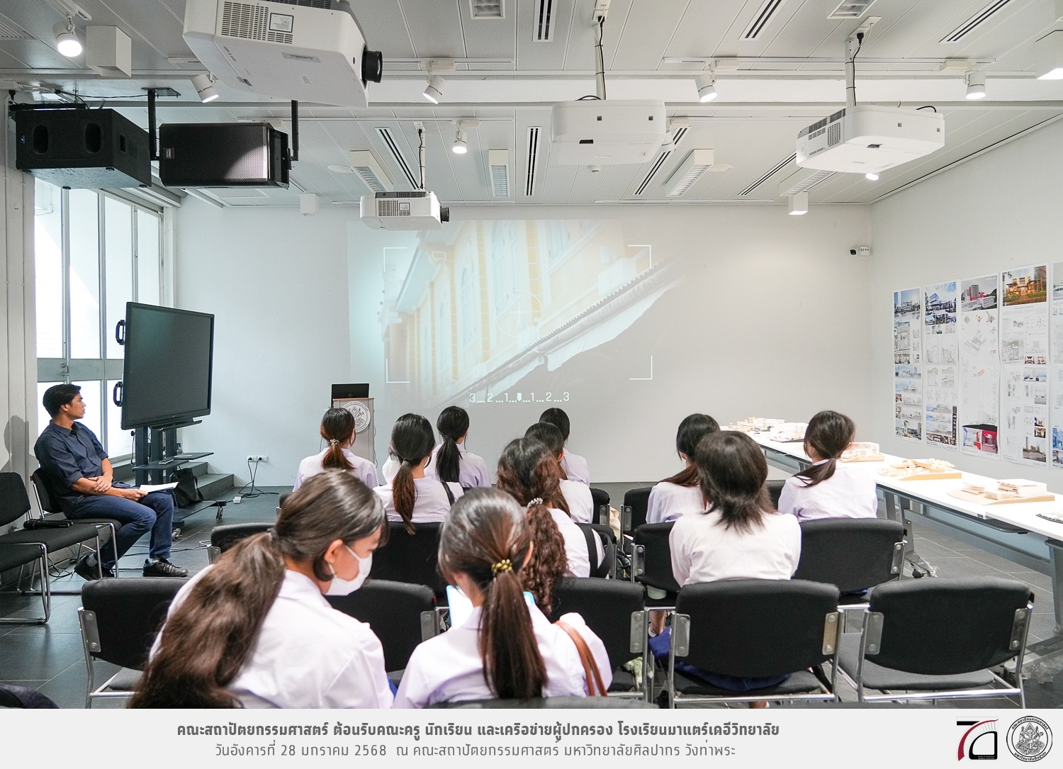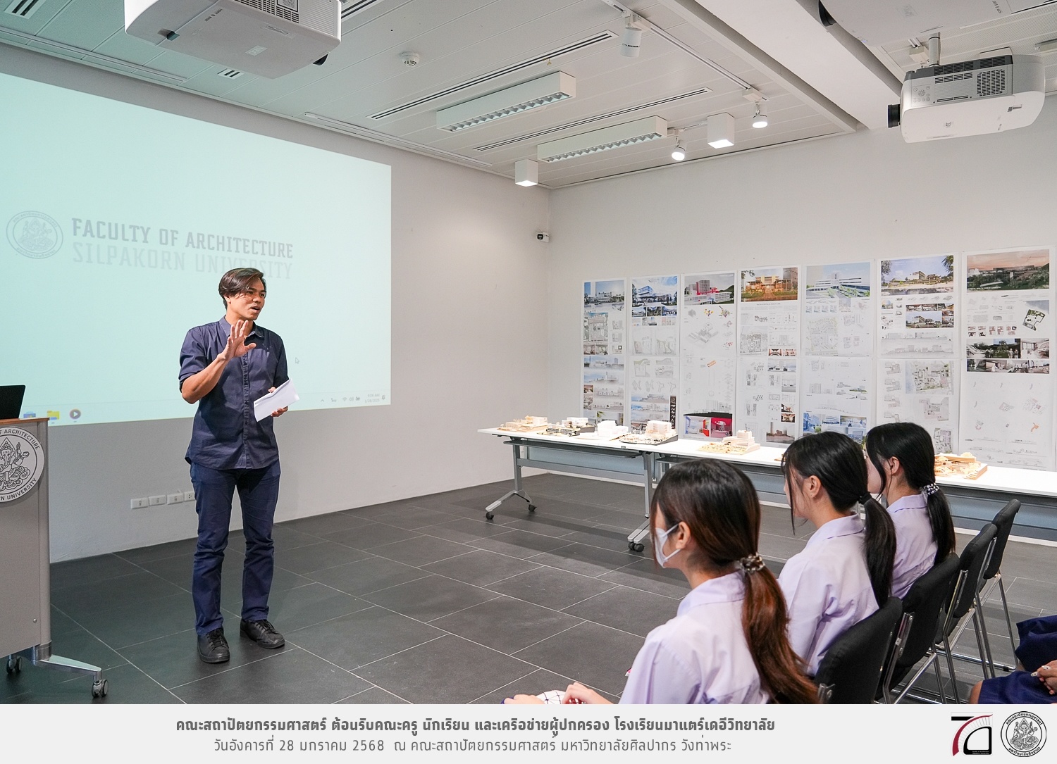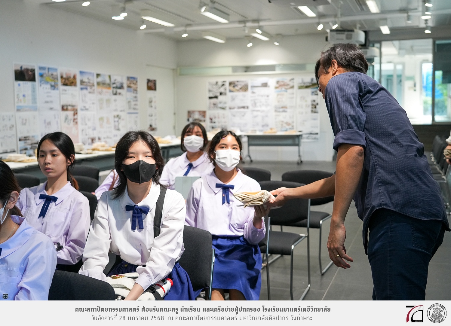 คณะครู นักเรียน และเครือข่ายผู้ปกครอง โรงเรียนมาแตร์เดอีวิทยาลัย เยี่ยมชมการเรียนการสอนคณะสถาปัตยกรรมศาสตร์ โดยมีผู้ช่วยศาสตราจารย์ ดร. เจนยุทธ ล่อใจ รองคณบดีฝ่ายกิจการนักศึกษา และผู้ช่วยศาสตราจารย์ ดร. ธาริณี รามสูต รองคณบดีฝ่ายวิชาการ ให้เกียรติแนะแนวการศึกษาต่อและนำชมคณะสถาปัตยกรรมศาสตร์ และบรรยากาศโดยรอบของมหาวิทยาลัยศิลปากร วังท่าพระ เมื่อวันอังคารที่ 28 มกราคม 2568 ณ คณะสถาปัตยกรรมศาสตร์ มหาวิทยาลัยศิลปากร วังท่าพระ