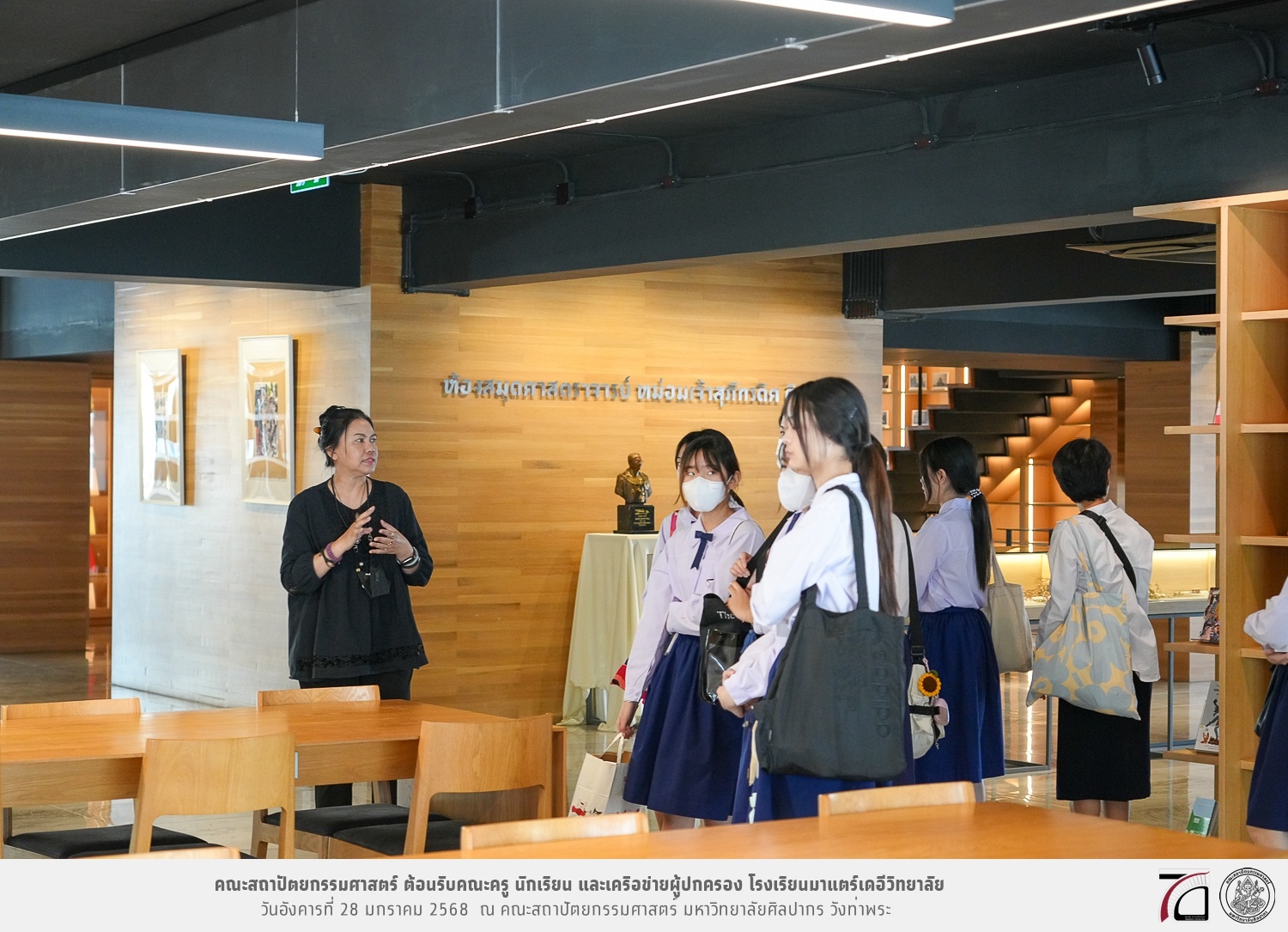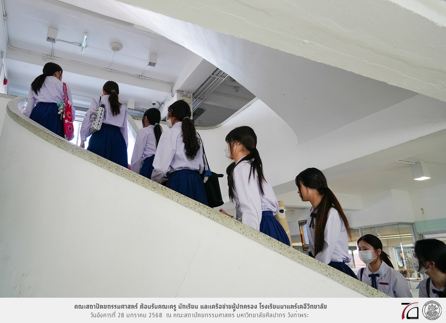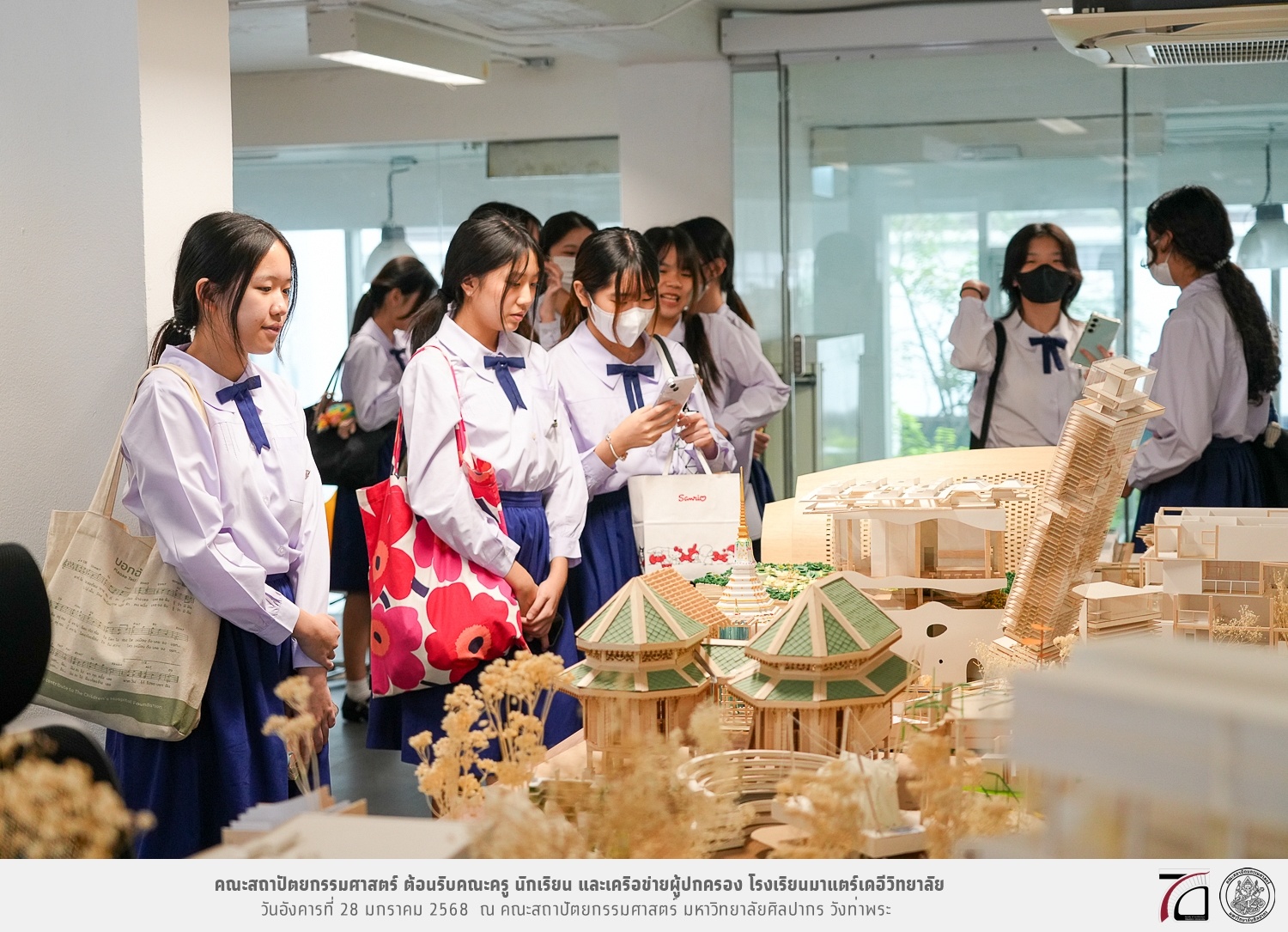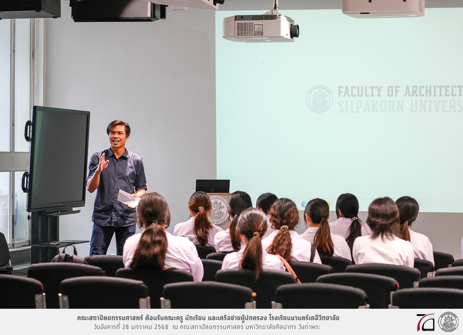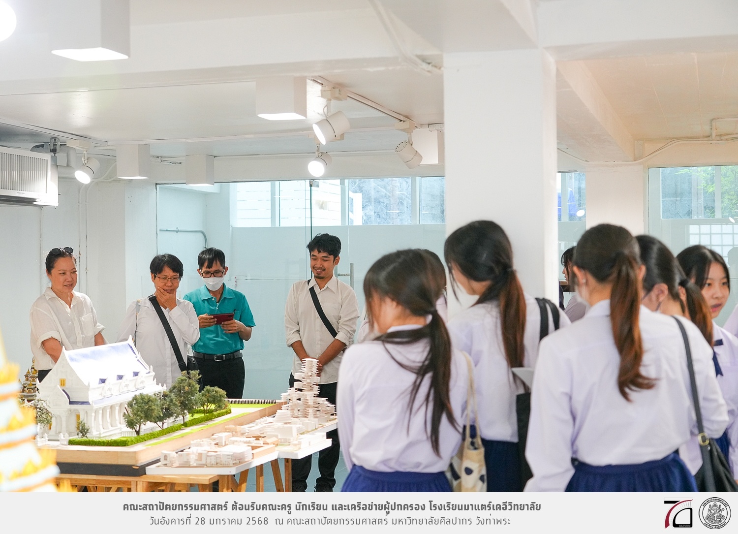 คณะครู นักเรียน และเครือข่ายผู้ปกครอง โรงเรียนมาแตร์เดอีวิทยาลัย เยี่ยมชมการเรียนการสอนคณะสถาปัตยกรรมศาสตร์ โดยมีผู้ช่วยศาสตราจารย์ ดร. เจนยุทธ ล่อใจ รองคณบดีฝ่ายกิจการนักศึกษา และผู้ช่วยศาสตราจารย์ ดร. ธาริณี รามสูต รองคณบดีฝ่ายวิชาการ ให้เกียรติแนะแนวการศึกษาต่อและนำชมคณะสถาปัตยกรรมศาสตร์ และบรรยากาศโดยรอบของมหาวิทยาลัยศิลปากร วังท่าพระ เมื่อวันอังคารที่ 28 มกราคม 2568 ณ คณะสถาปัตยกรรมศาสตร์ มหาวิทยาลัยศิลปากร วังท่าพระ