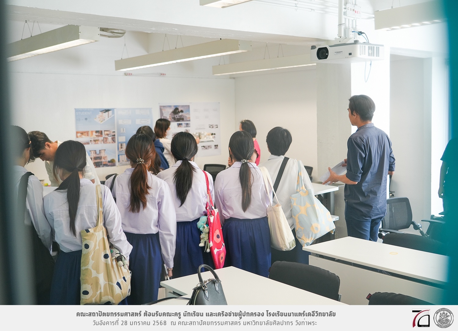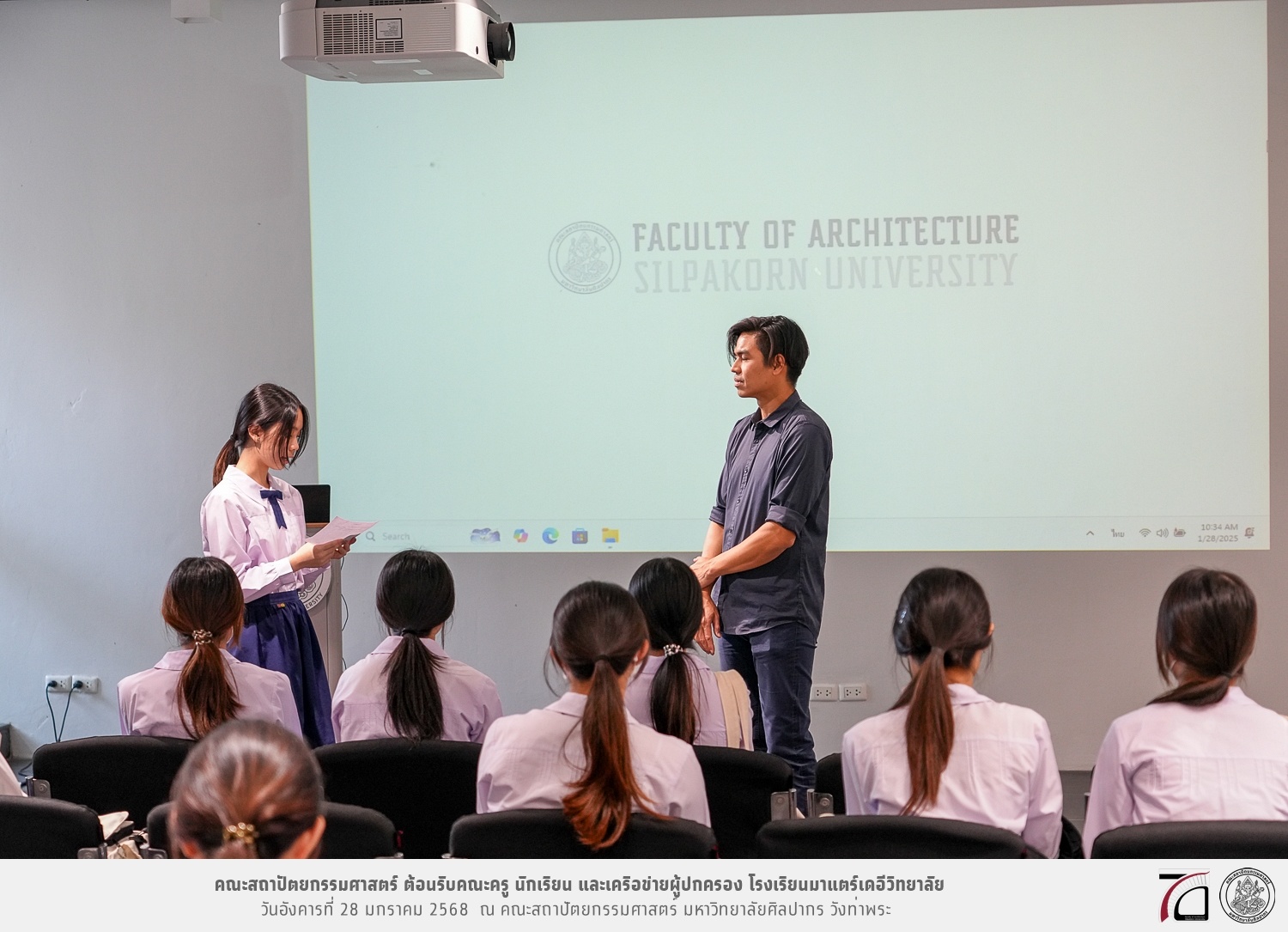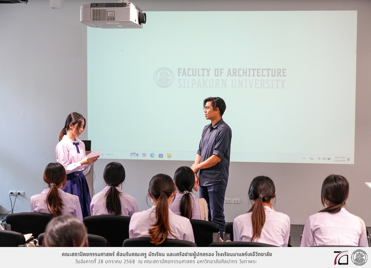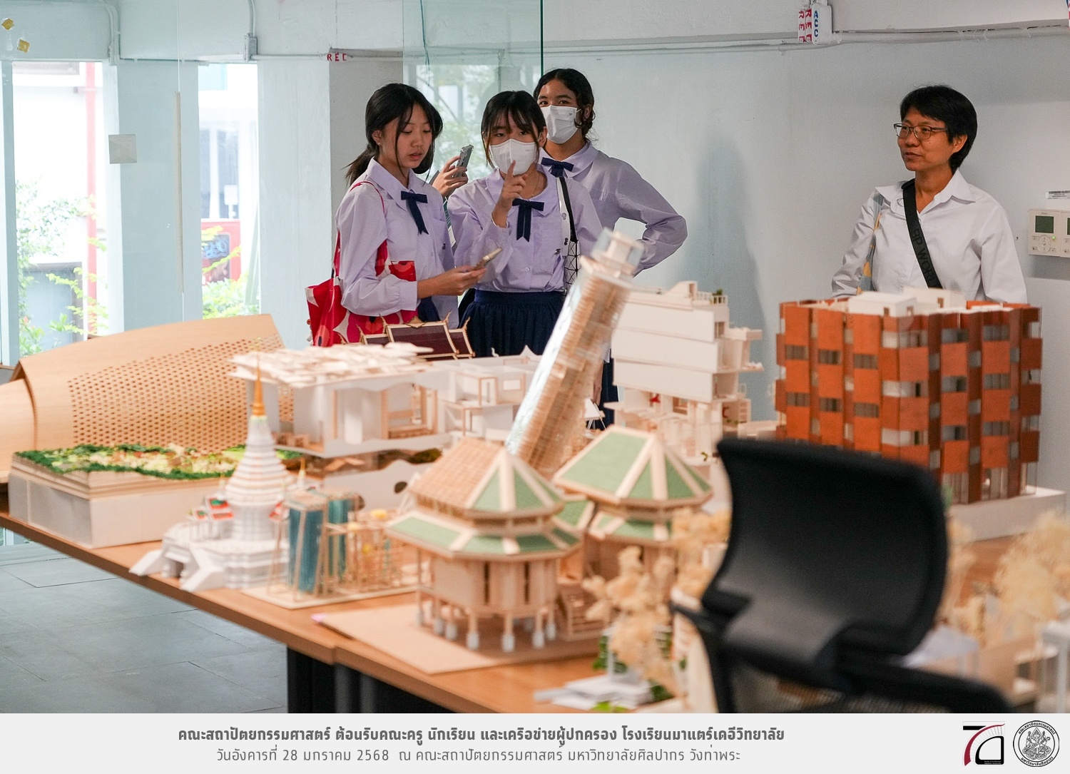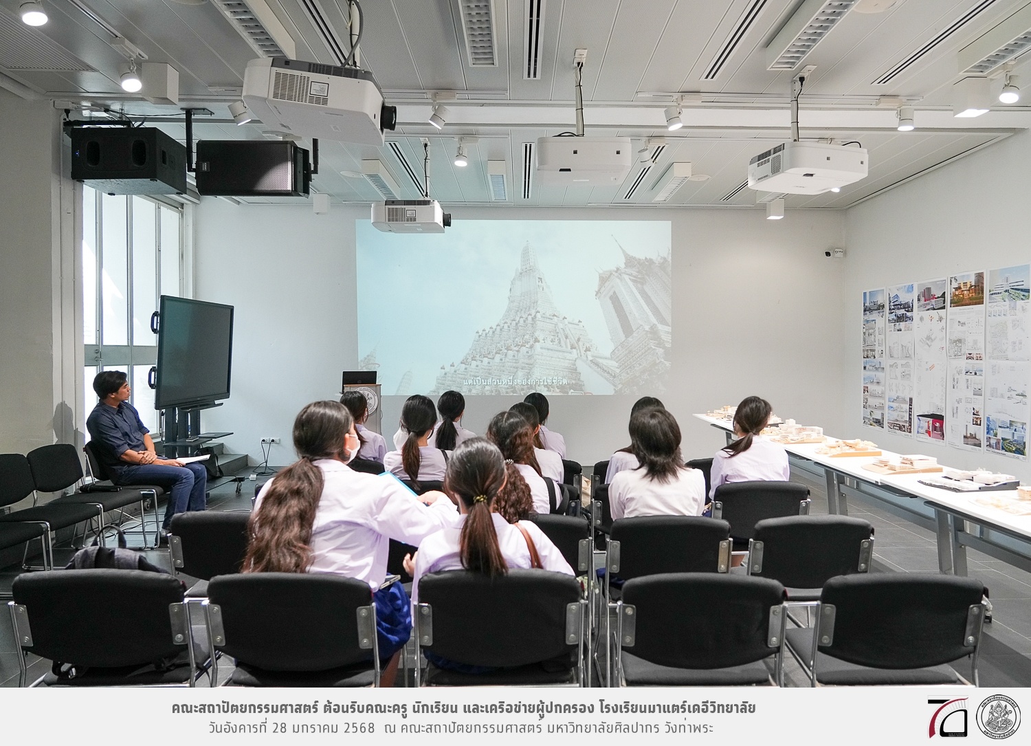 คณะครู นักเรียน และเครือข่ายผู้ปกครอง โรงเรียนมาแตร์เดอีวิทยาลัย เยี่ยมชมการเรียนการสอนคณะสถาปัตยกรรมศาสตร์ โดยมีผู้ช่วยศาสตราจารย์ ดร. เจนยุทธ ล่อใจ รองคณบดีฝ่ายกิจการนักศึกษา และผู้ช่วยศาสตราจารย์ ดร. ธาริณี รามสูต รองคณบดีฝ่ายวิชาการ ให้เกียรติแนะแนวการศึกษาต่อและนำชมคณะสถาปัตยกรรมศาสตร์ และบรรยากาศโดยรอบของมหาวิทยาลัยศิลปากร วังท่าพระ เมื่อวันอังคารที่ 28 มกราคม 2568 ณ คณะสถาปัตยกรรมศาสตร์ มหาวิทยาลัยศิลปากร วังท่าพระ