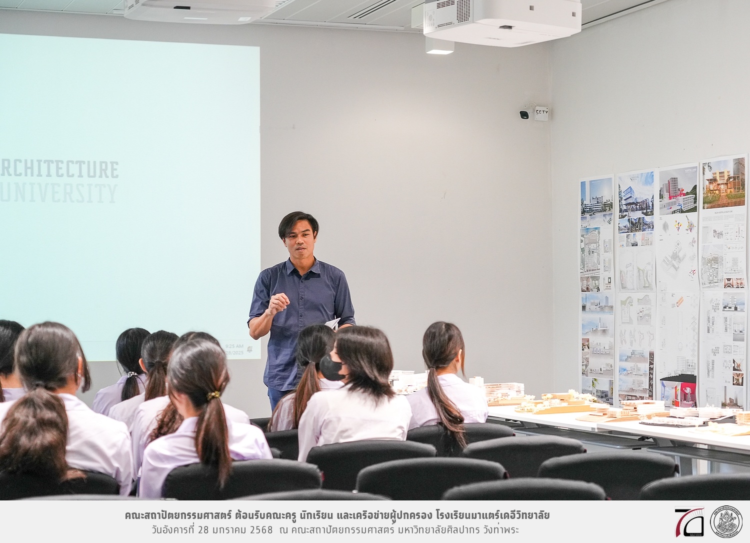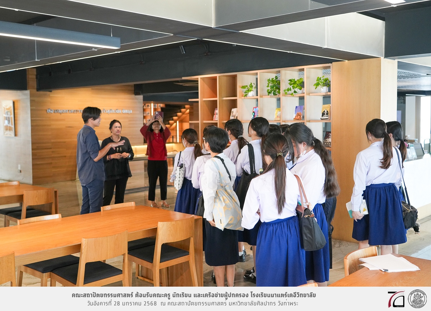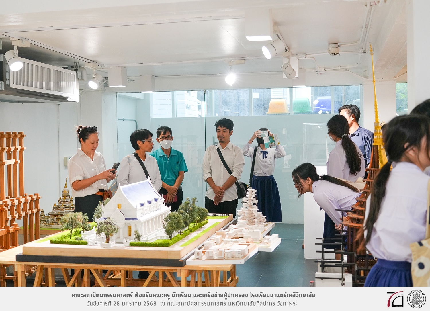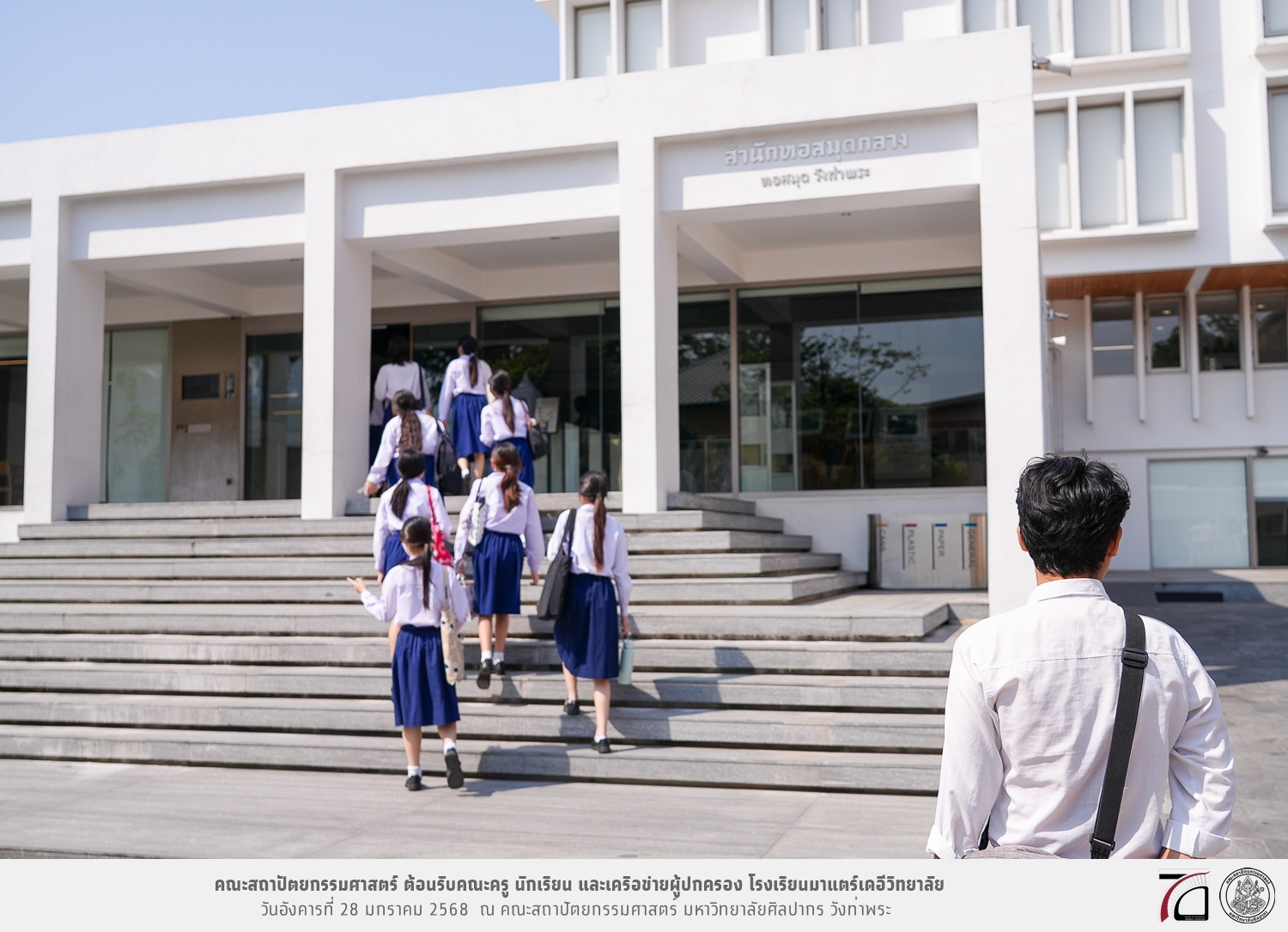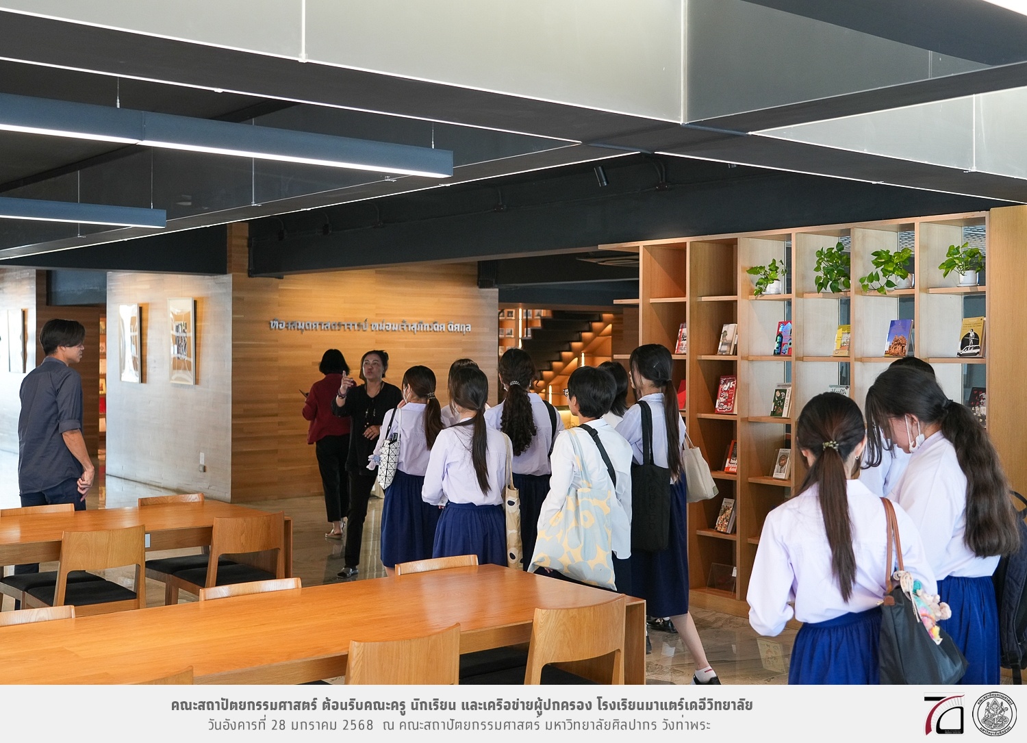 คณะครู นักเรียน และเครือข่ายผู้ปกครอง โรงเรียนมาแตร์เดอีวิทยาลัย เยี่ยมชมการเรียนการสอนคณะสถาปัตยกรรมศาสตร์ โดยมีผู้ช่วยศาสตราจารย์ ดร. เจนยุทธ ล่อใจ รองคณบดีฝ่ายกิจการนักศึกษา และผู้ช่วยศาสตราจารย์ ดร. ธาริณี รามสูต รองคณบดีฝ่ายวิชาการ ให้เกียรติแนะแนวการศึกษาต่อและนำชมคณะสถาปัตยกรรมศาสตร์ และบรรยากาศโดยรอบของมหาวิทยาลัยศิลปากร วังท่าพระ เมื่อวันอังคารที่ 28 มกราคม 2568 ณ คณะสถาปัตยกรรมศาสตร์ มหาวิทยาลัยศิลปากร วังท่าพระ