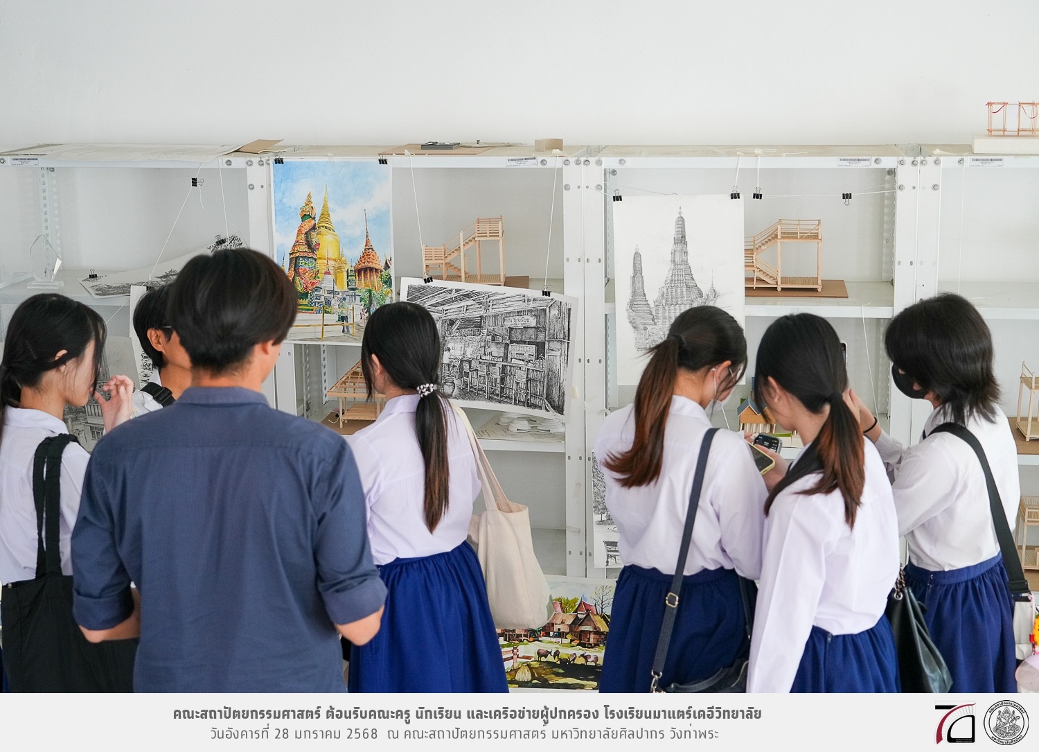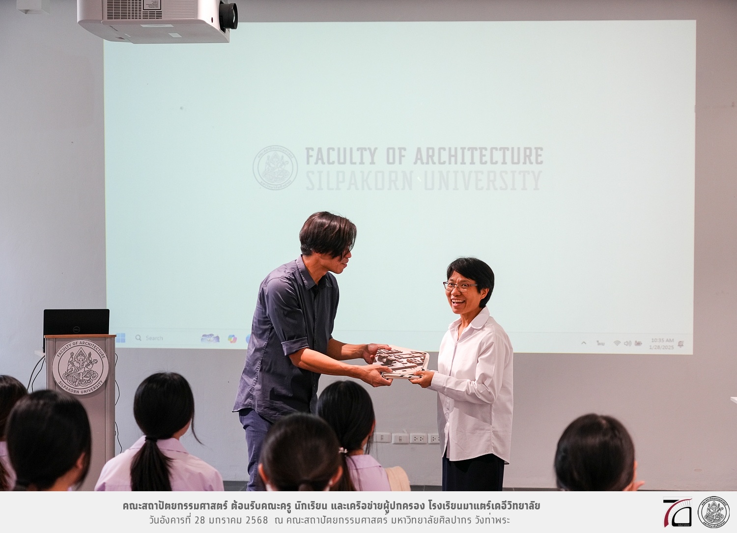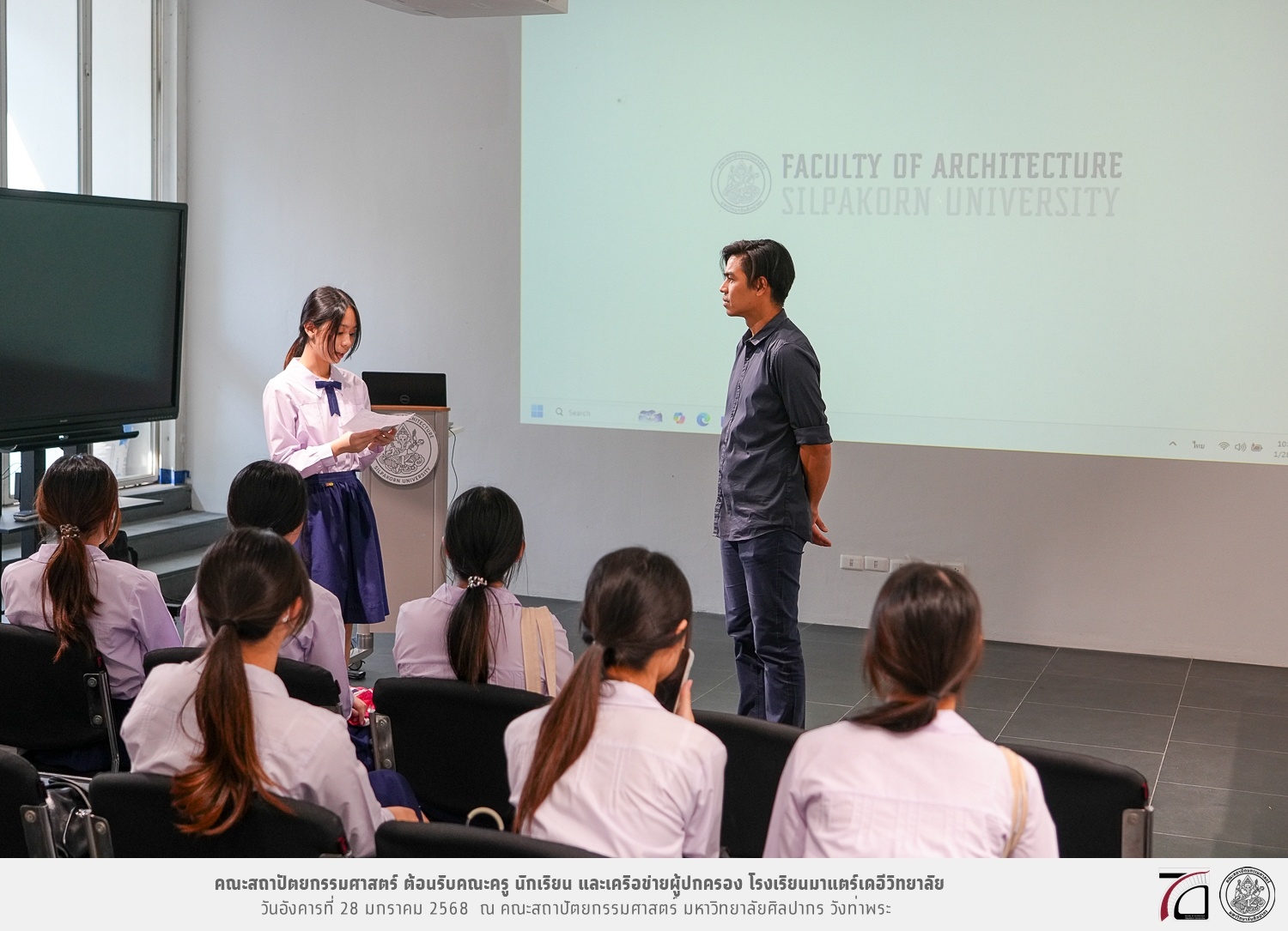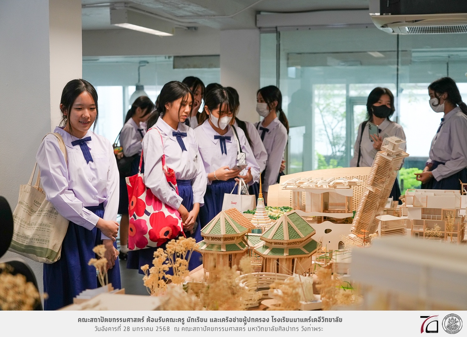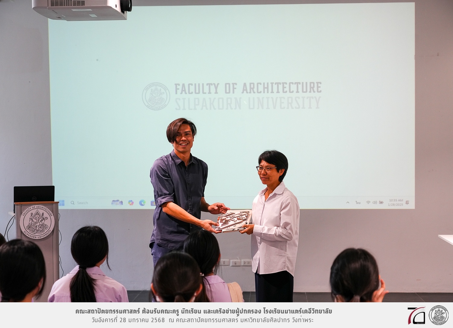 คณะครู นักเรียน และเครือข่ายผู้ปกครอง โรงเรียนมาแตร์เดอีวิทยาลัย เยี่ยมชมการเรียนการสอนคณะสถาปัตยกรรมศาสตร์ โดยมีผู้ช่วยศาสตราจารย์ ดร. เจนยุทธ ล่อใจ รองคณบดีฝ่ายกิจการนักศึกษา และผู้ช่วยศาสตราจารย์ ดร. ธาริณี รามสูต รองคณบดีฝ่ายวิชาการ ให้เกียรติแนะแนวการศึกษาต่อและนำชมคณะสถาปัตยกรรมศาสตร์ และบรรยากาศโดยรอบของมหาวิทยาลัยศิลปากร วังท่าพระ เมื่อวันอังคารที่ 28 มกราคม 2568 ณ คณะสถาปัตยกรรมศาสตร์ มหาวิทยาลัยศิลปากร วังท่าพระ