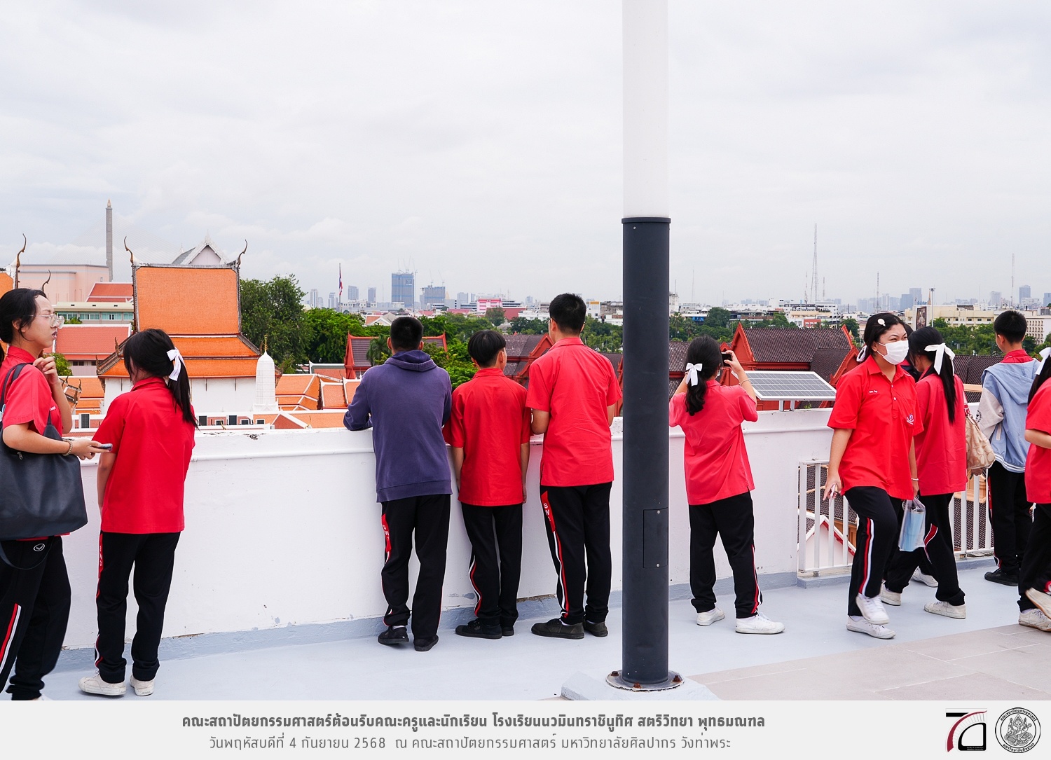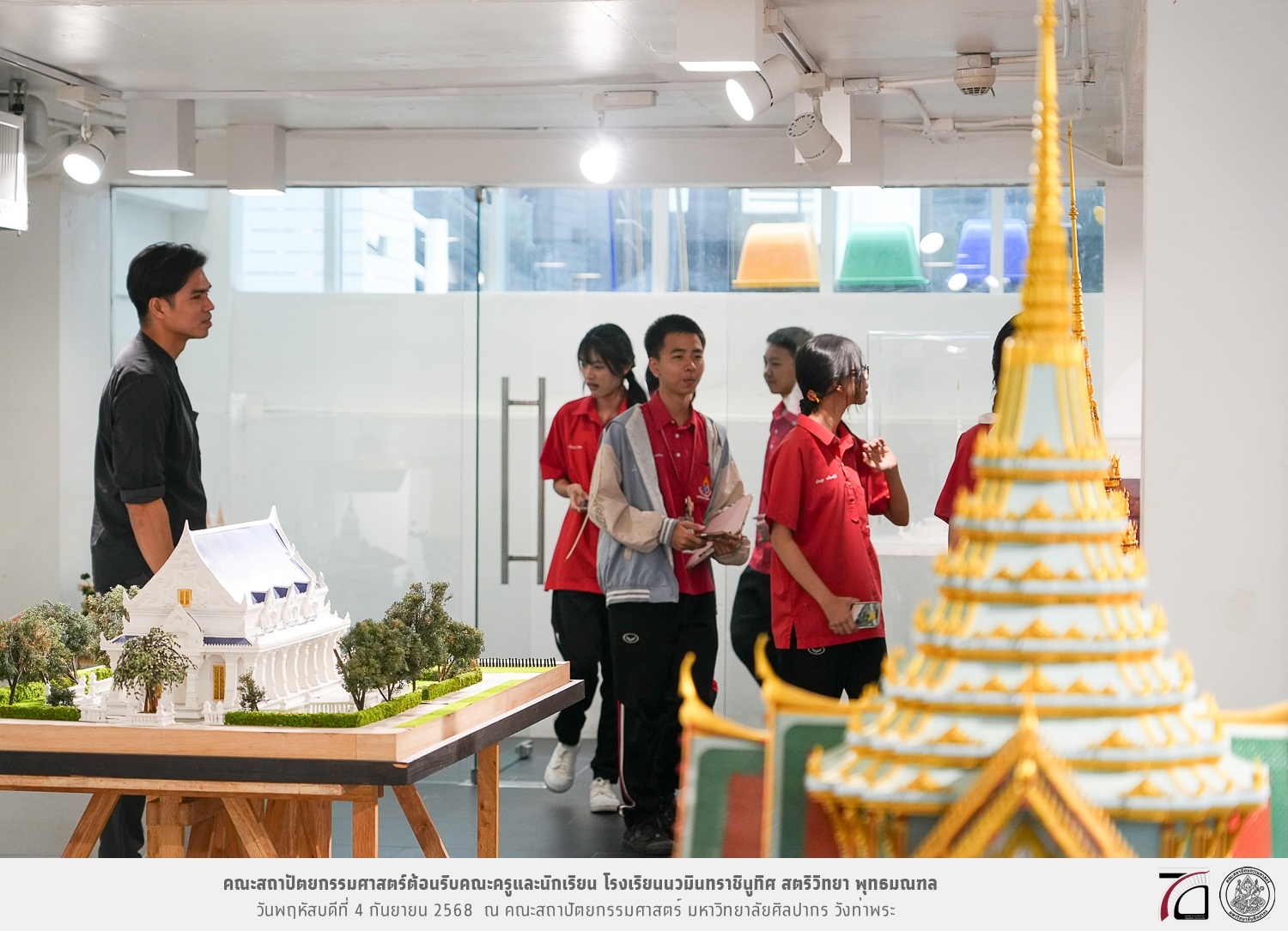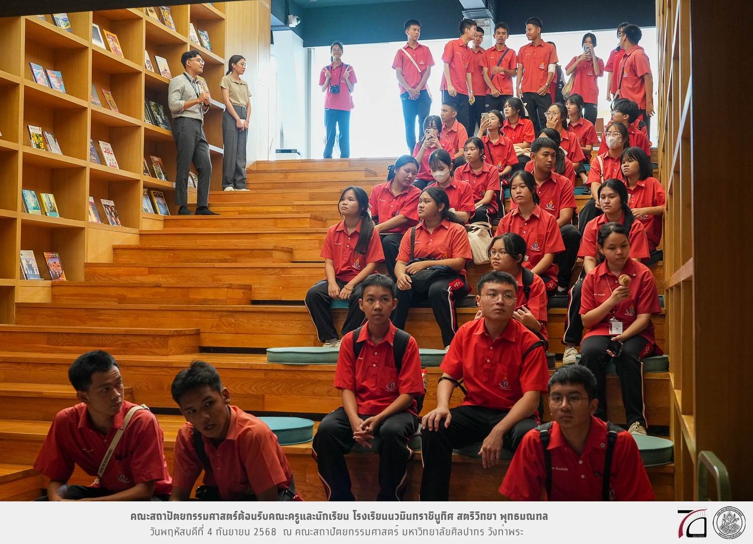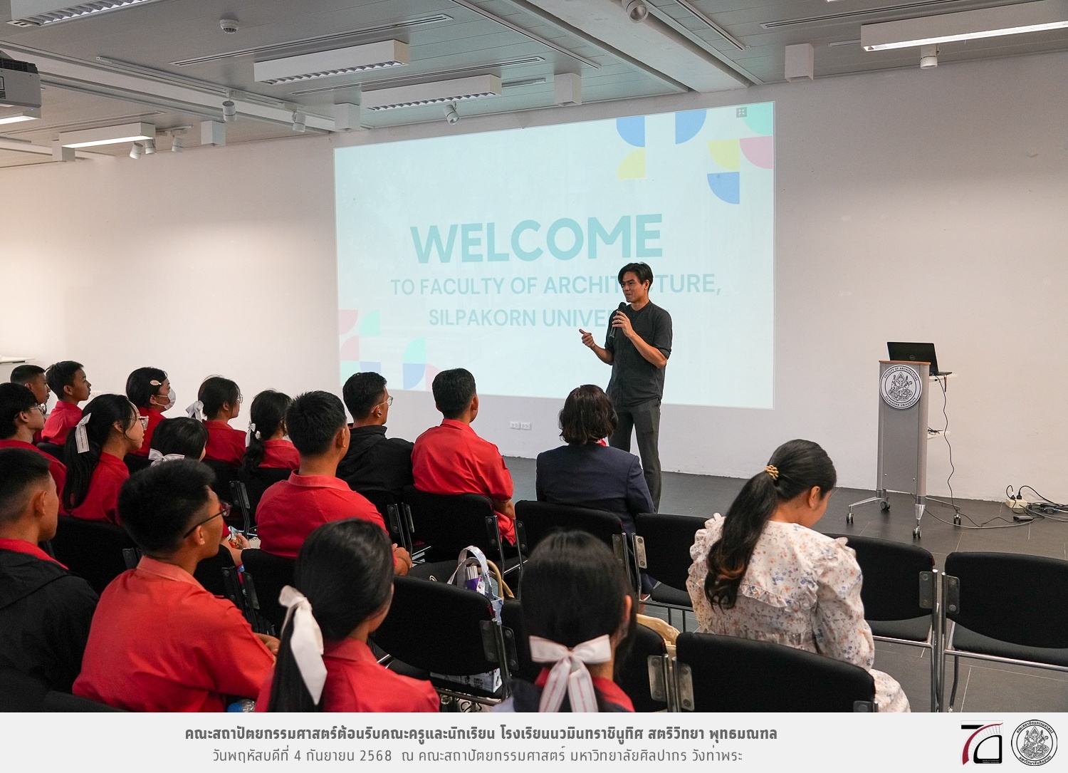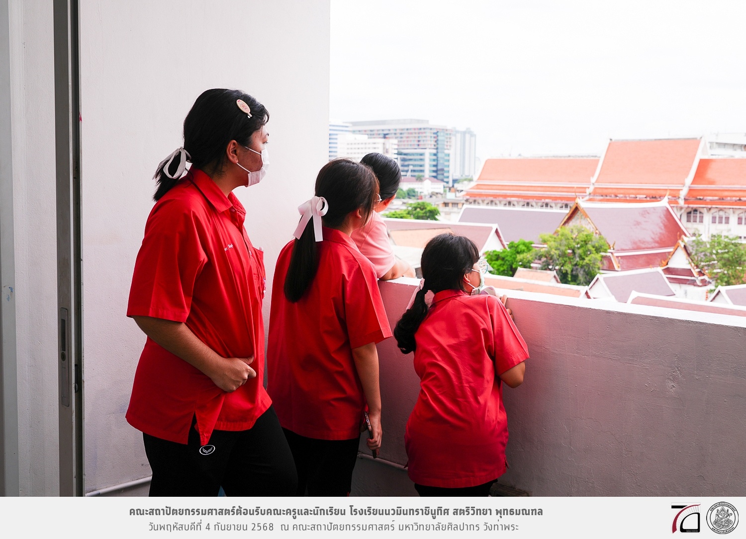 คณะฯ ให้การต้อนรับคณะครูและนักเรียน โรงเรียนนวมินทราชินูทิศ สตรีวิทยา พุทธมณฑล โดยมี ผู้ช่วยศาสตราจารย์ ดร.เจนยุทธ ล่อใจ รองคณบดีฝ่ายกิจการนักศึกษา นำชมคณะสถาปัตยกรรมศาสตร์และบรรยากาศโดยรอบของมหาวิทยาลัยศิลปากร วังท่าพระ เมื่อวันพฤหัสบดีที่ 4 กันยายน 2568 ณ คณะสถาปัตยกรรมศาสตร์ มหาวิทยาลัยศิลปากร วังท่าพระ