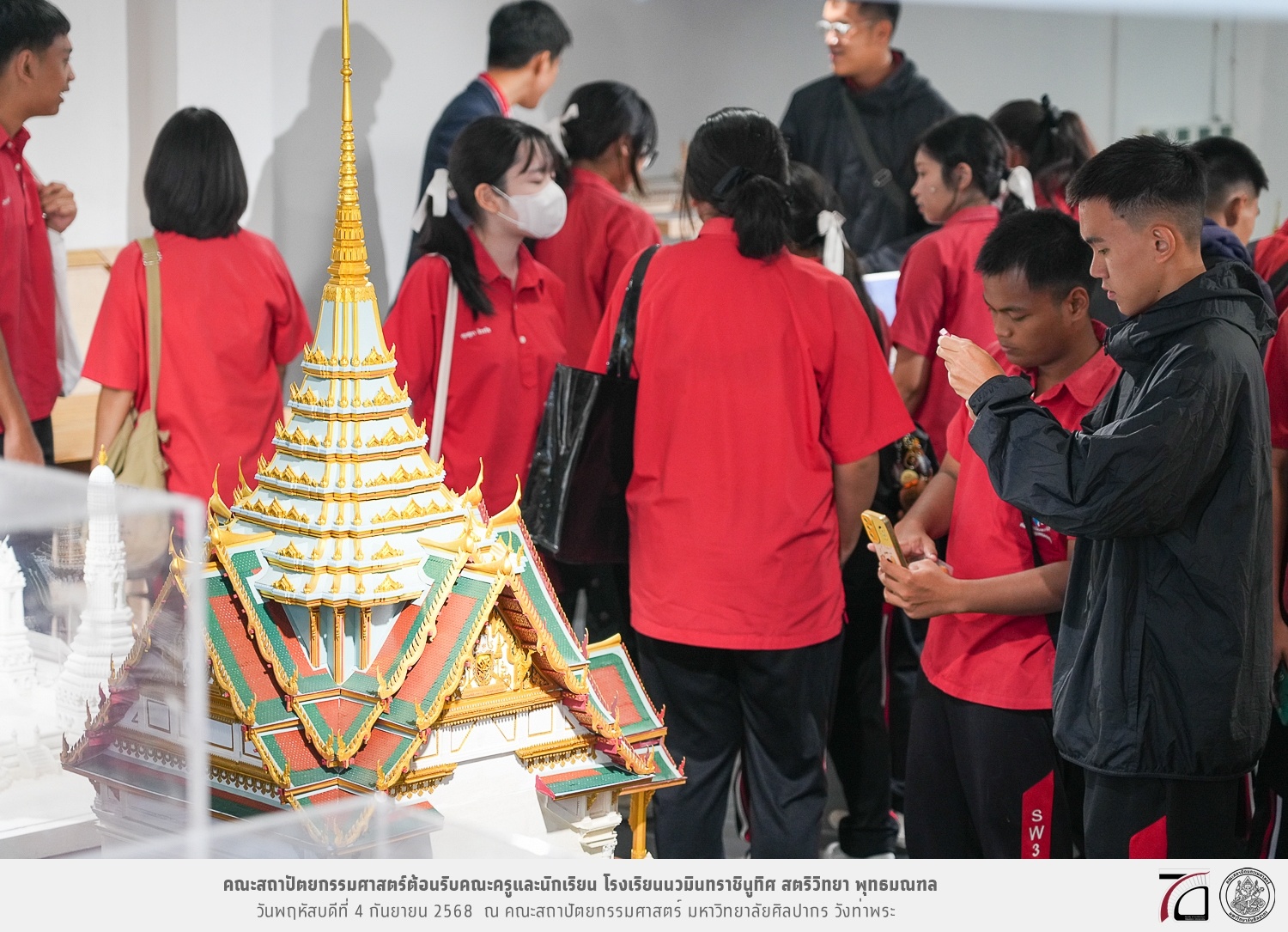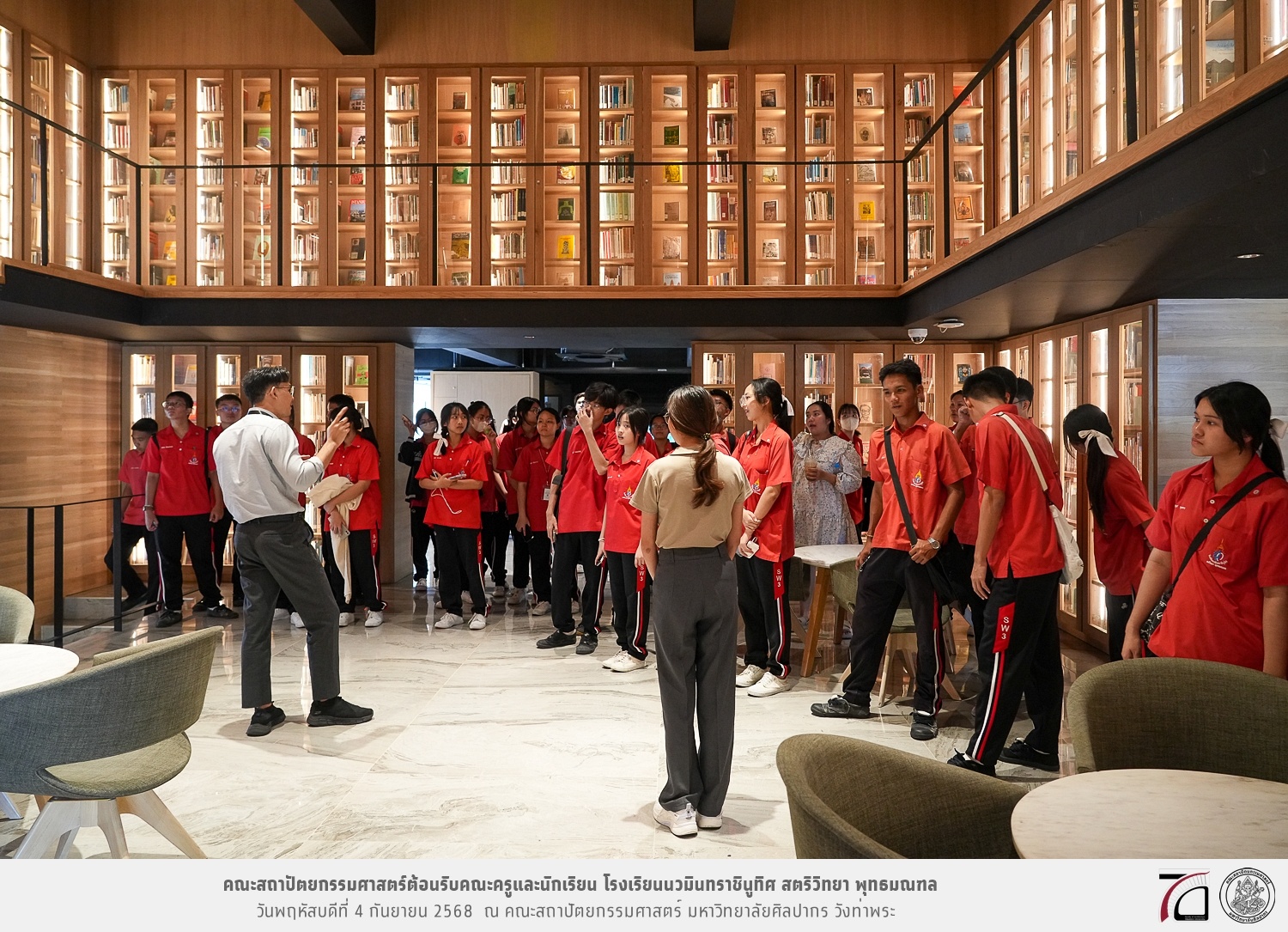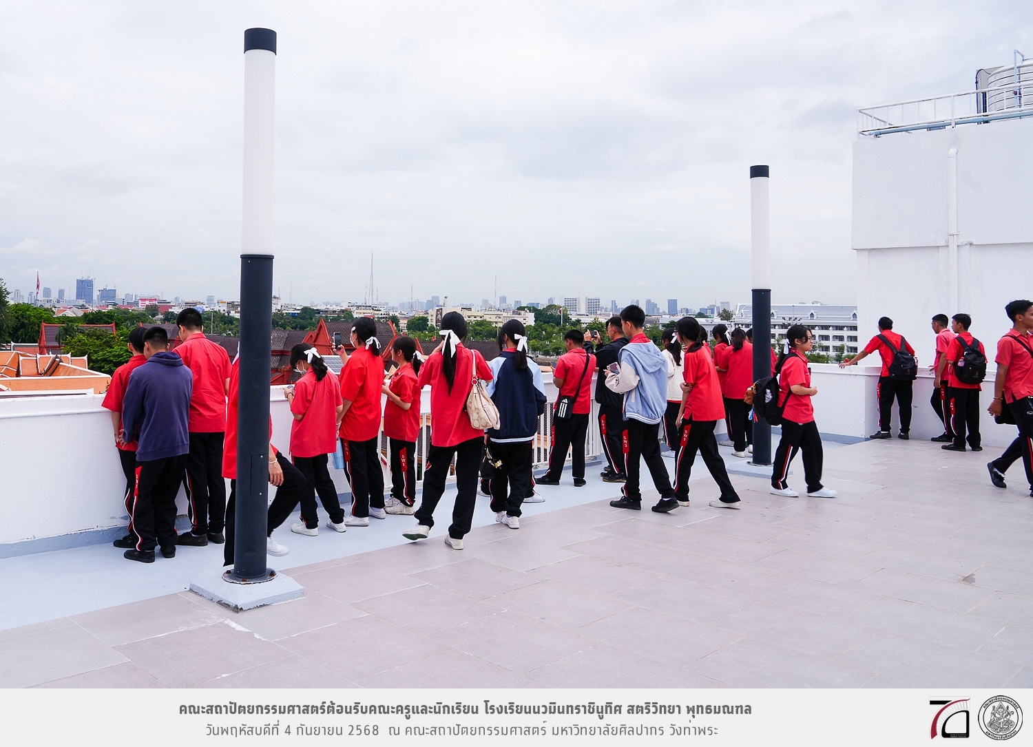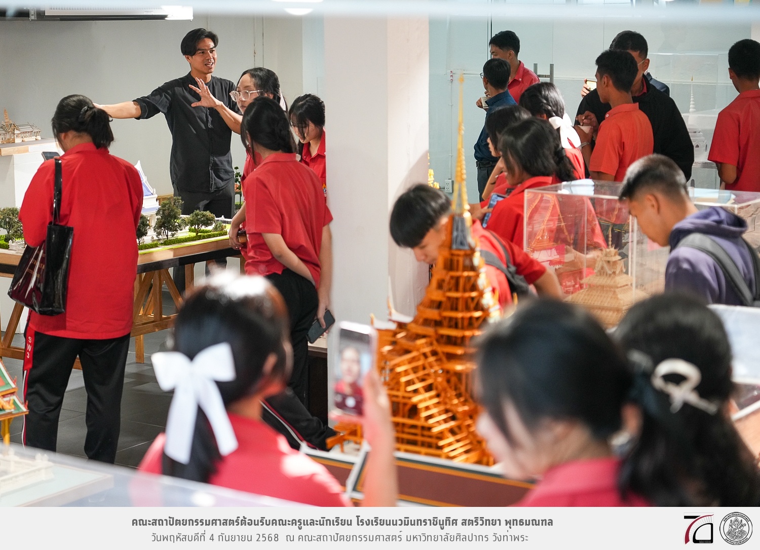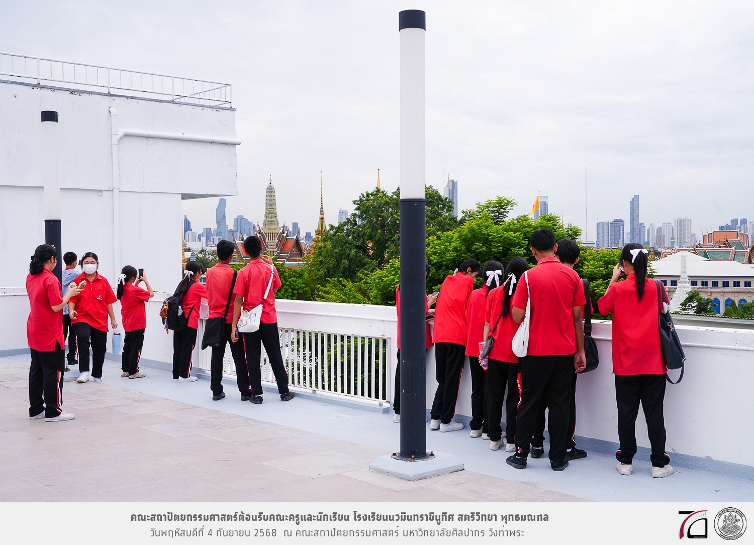 คณะฯ ให้การต้อนรับคณะครูและนักเรียน โรงเรียนนวมินทราชินูทิศ สตรีวิทยา พุทธมณฑล โดยมี ผู้ช่วยศาสตราจารย์ ดร.เจนยุทธ ล่อใจ รองคณบดีฝ่ายกิจการนักศึกษา นำชมคณะสถาปัตยกรรมศาสตร์และบรรยากาศโดยรอบของมหาวิทยาลัยศิลปากร วังท่าพระ เมื่อวันพฤหัสบดีที่ 4 กันยายน 2568 ณ คณะสถาปัตยกรรมศาสตร์ มหาวิทยาลัยศิลปากร วังท่าพระ