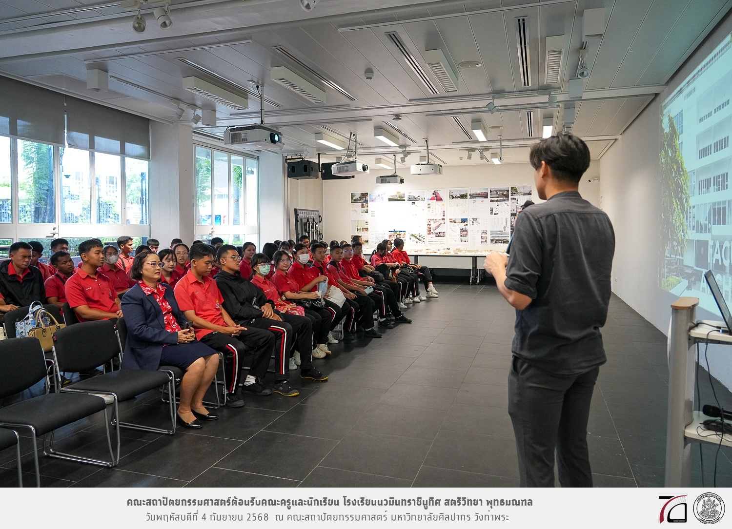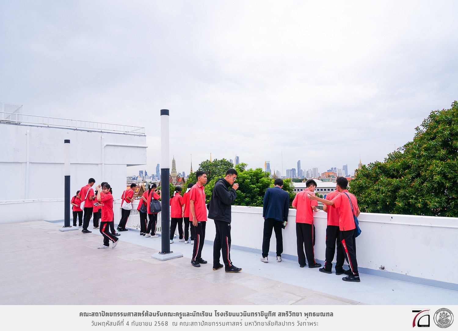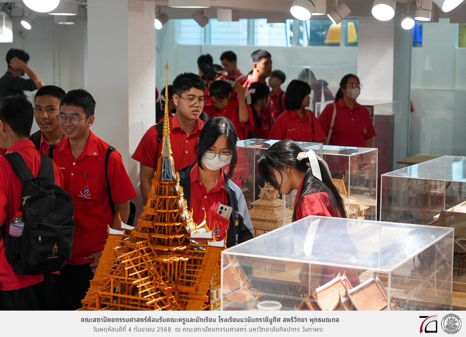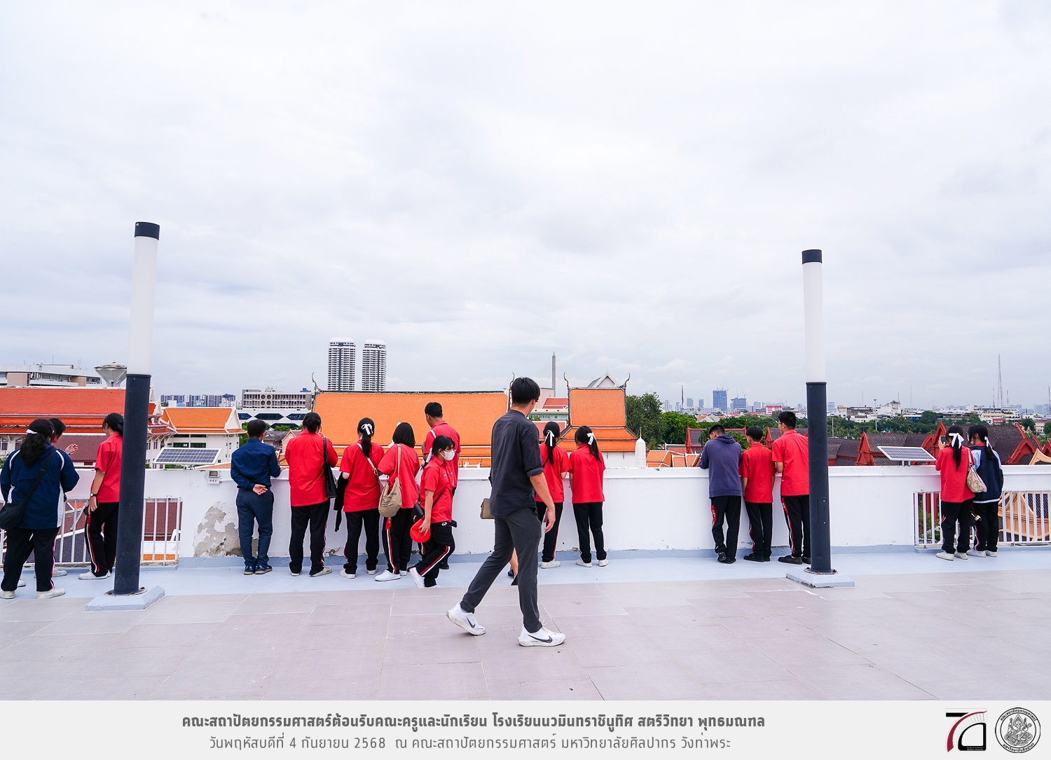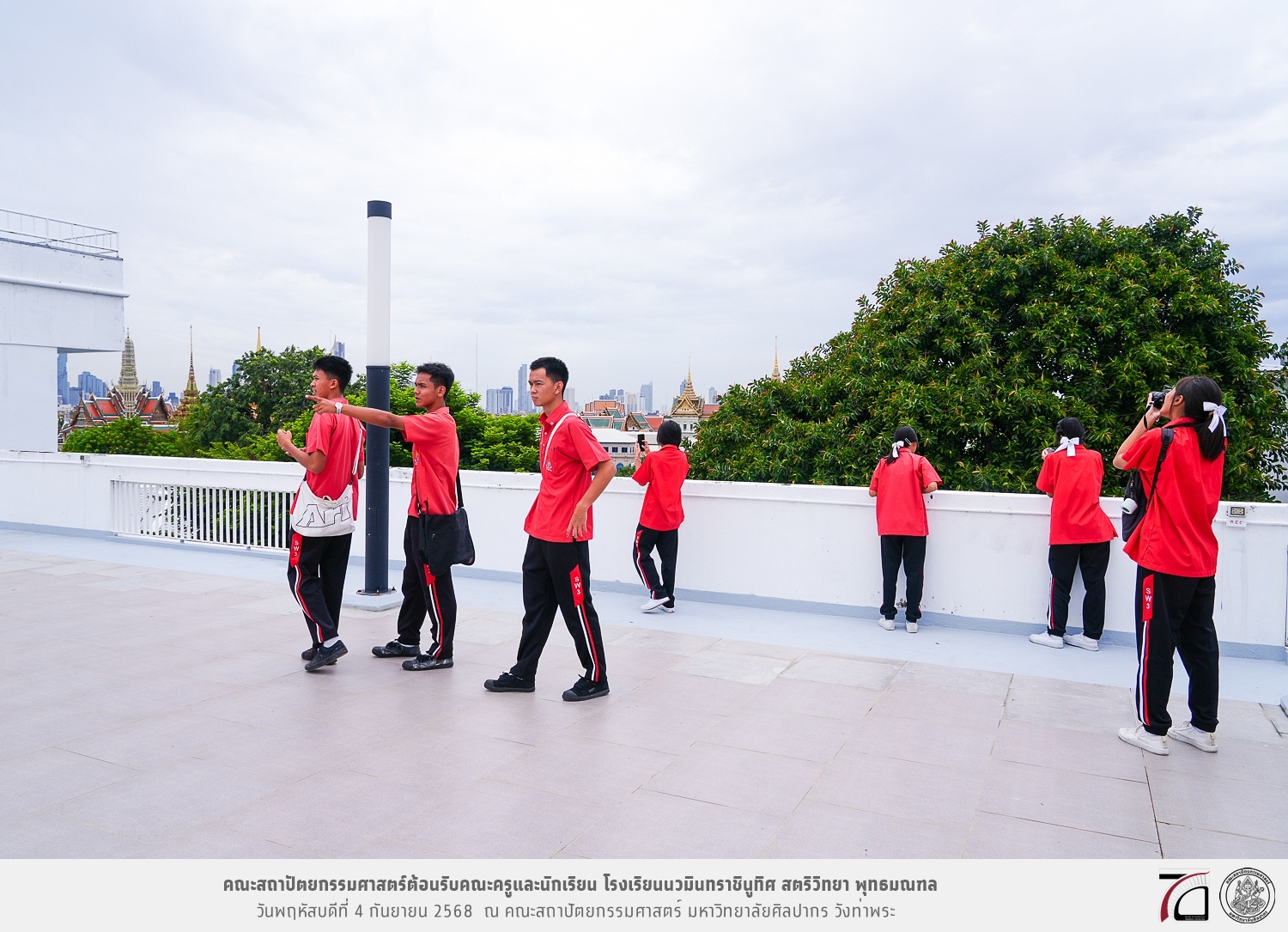 คณะฯ ให้การต้อนรับคณะครูและนักเรียน โรงเรียนนวมินทราชินูทิศ สตรีวิทยา พุทธมณฑล โดยมี ผู้ช่วยศาสตราจารย์ ดร.เจนยุทธ ล่อใจ รองคณบดีฝ่ายกิจการนักศึกษา นำชมคณะสถาปัตยกรรมศาสตร์และบรรยากาศโดยรอบของมหาวิทยาลัยศิลปากร วังท่าพระ เมื่อวันพฤหัสบดีที่ 4 กันยายน 2568 ณ คณะสถาปัตยกรรมศาสตร์ มหาวิทยาลัยศิลปากร วังท่าพระ