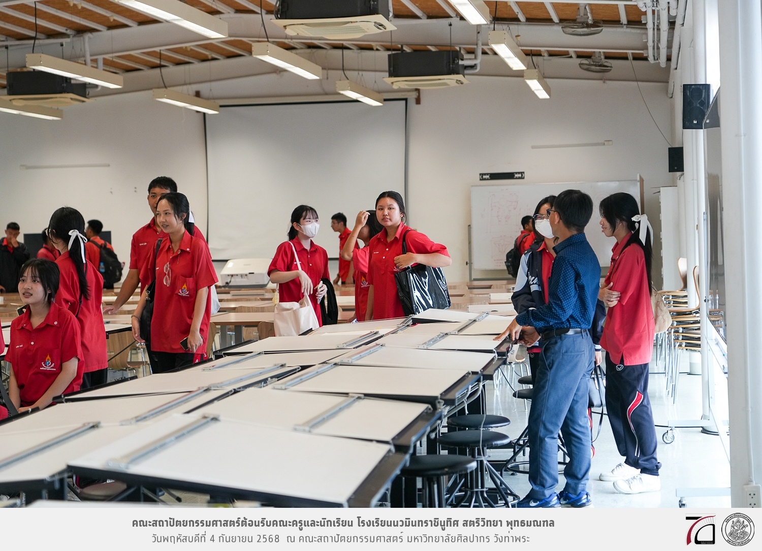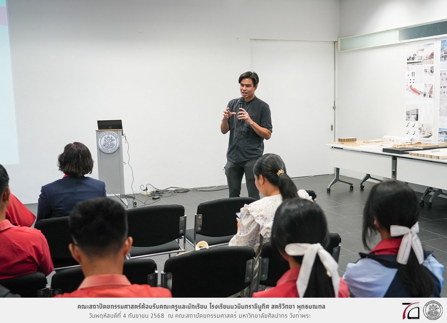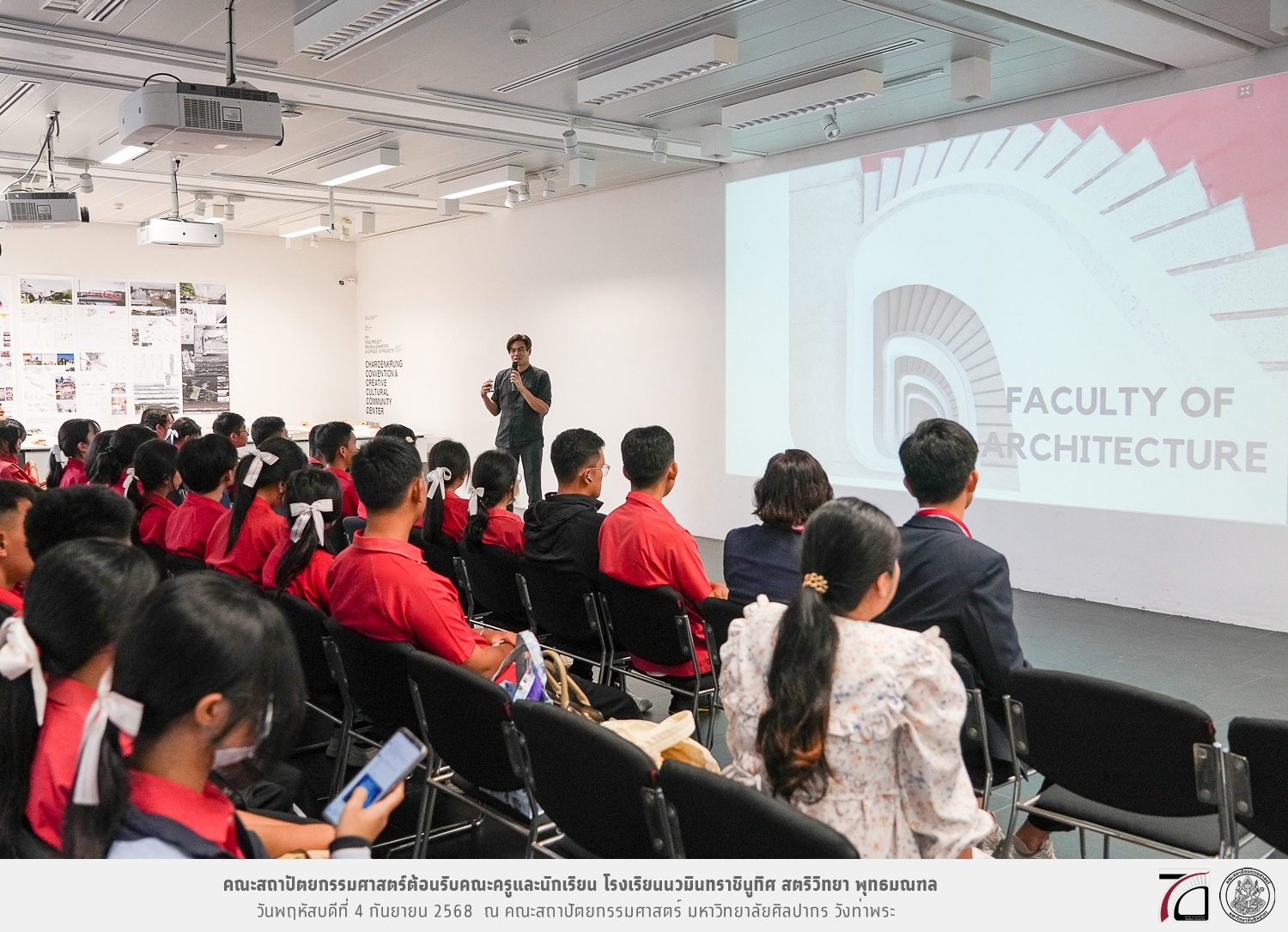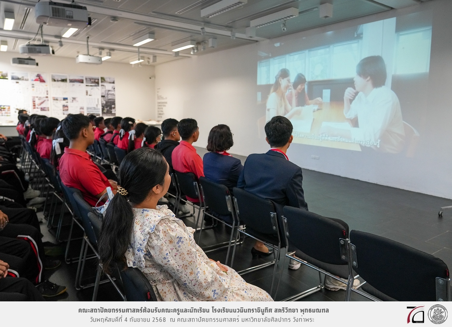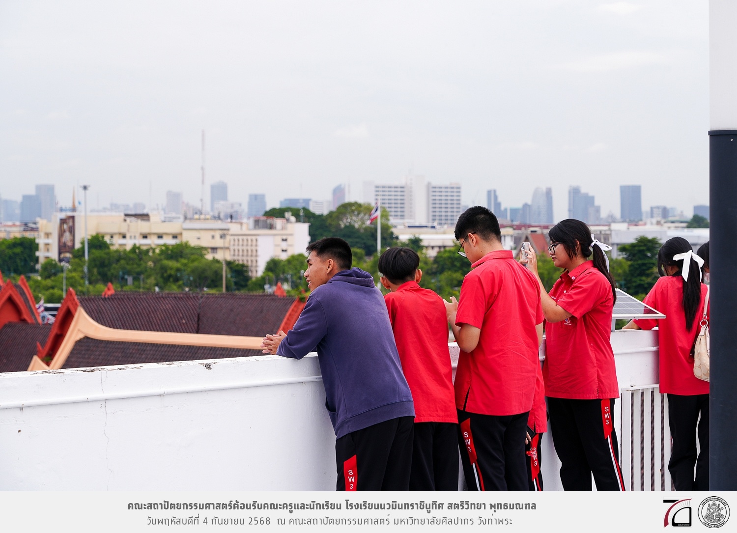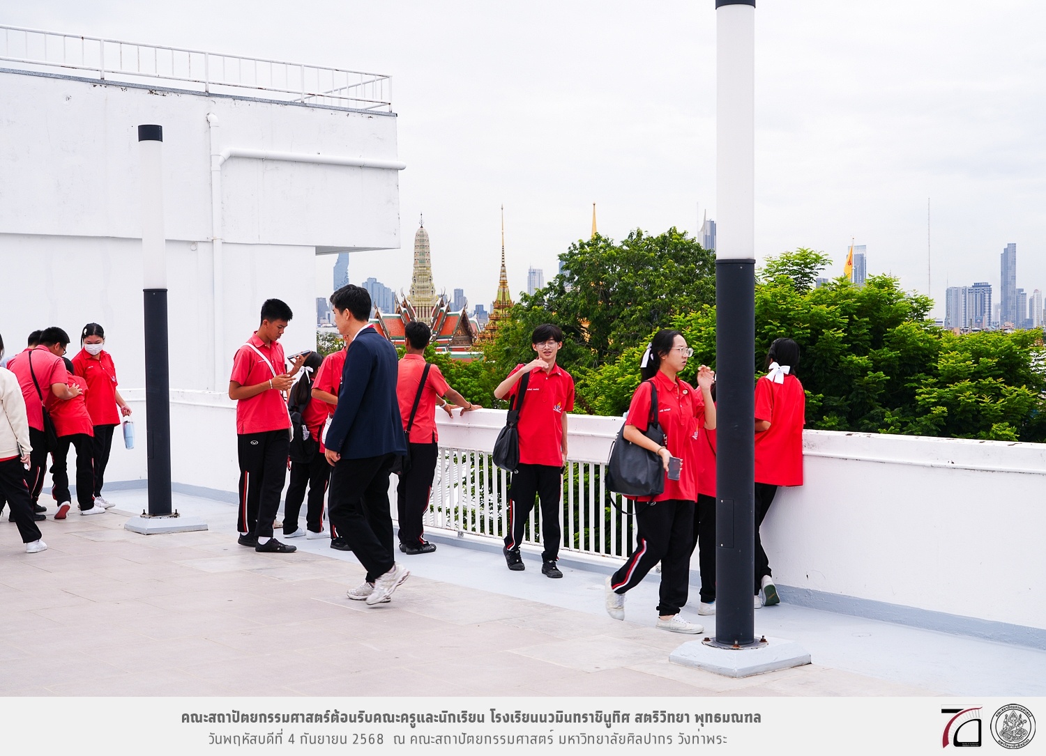 คณะฯ ให้การต้อนรับคณะครูและนักเรียน โรงเรียนนวมินทราชินูทิศ สตรีวิทยา พุทธมณฑล โดยมี ผู้ช่วยศาสตราจารย์ ดร.เจนยุทธ ล่อใจ รองคณบดีฝ่ายกิจการนักศึกษา นำชมคณะสถาปัตยกรรมศาสตร์และบรรยากาศโดยรอบของมหาวิทยาลัยศิลปากร วังท่าพระ เมื่อวันพฤหัสบดีที่ 4 กันยายน 2568 ณ คณะสถาปัตยกรรมศาสตร์ มหาวิทยาลัยศิลปากร วังท่าพระ