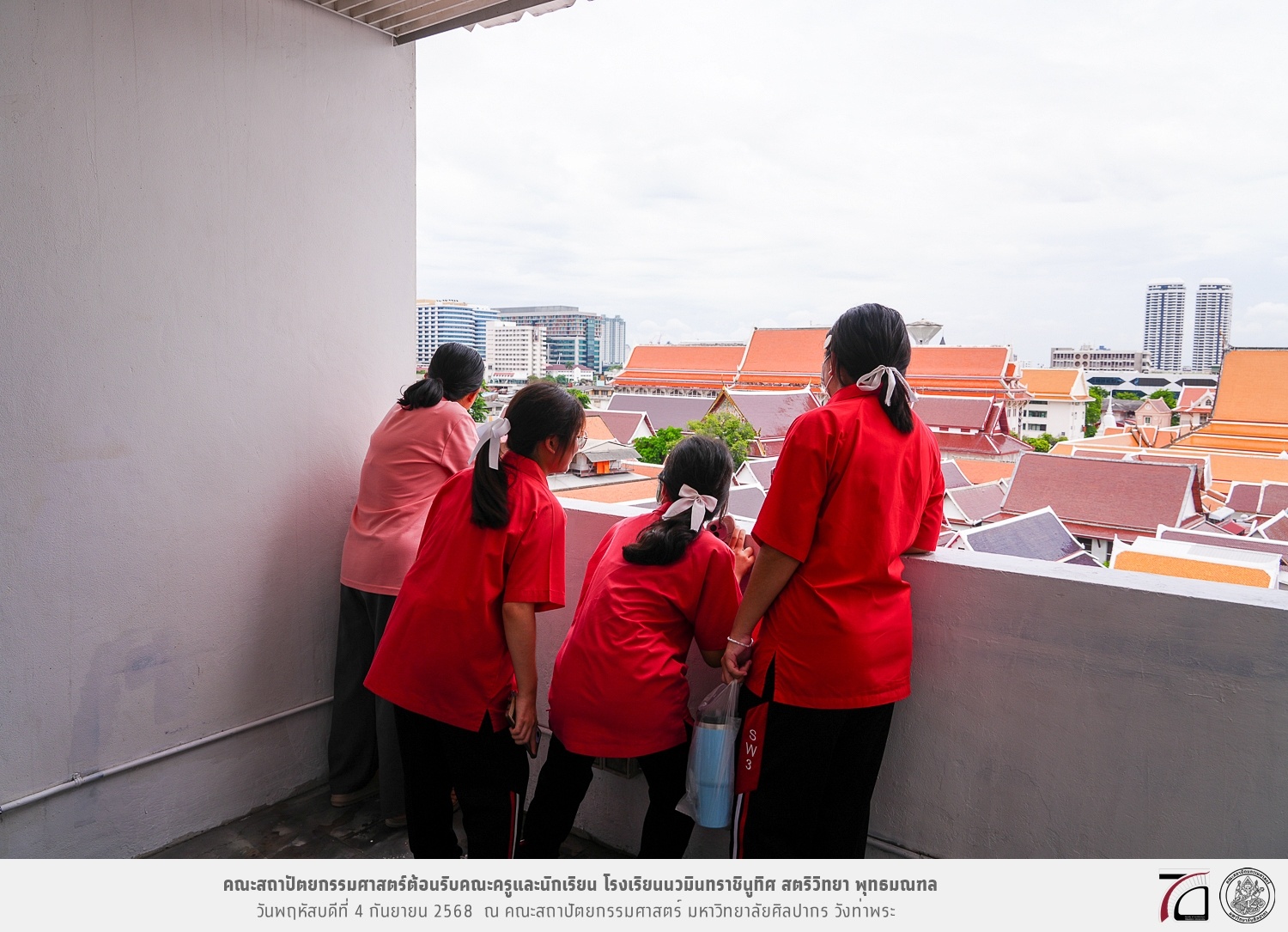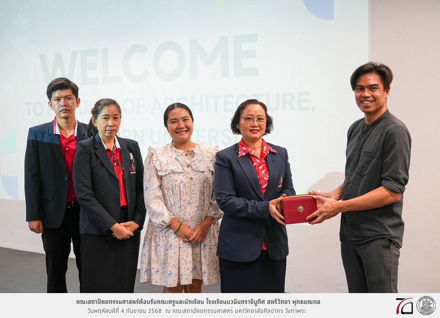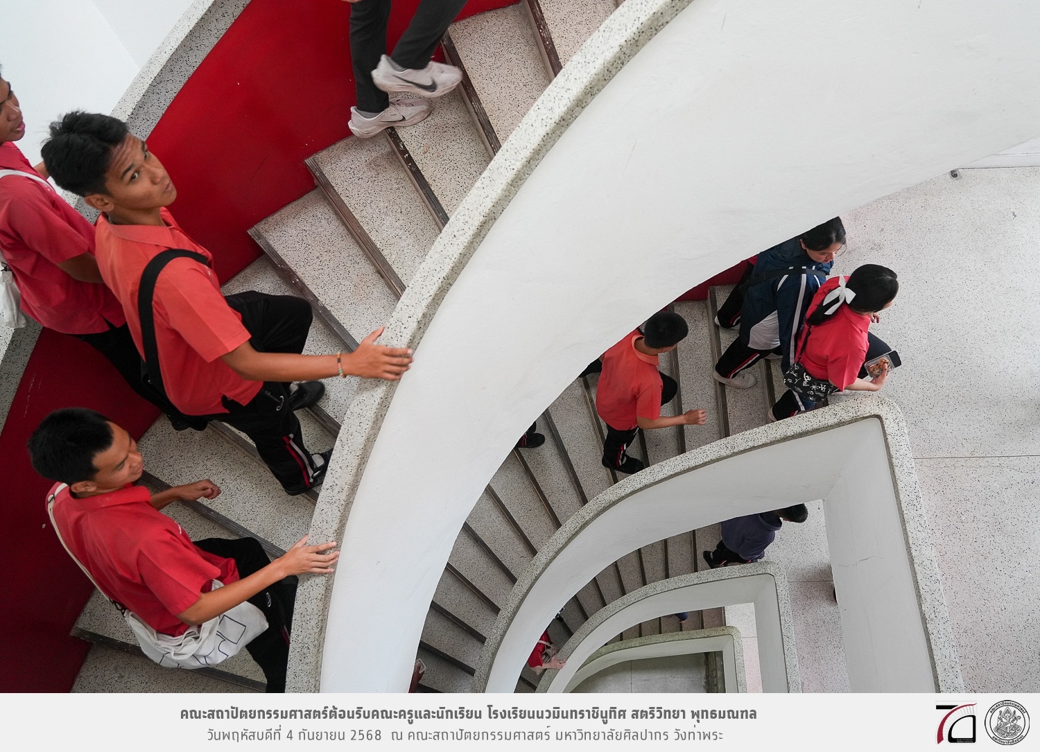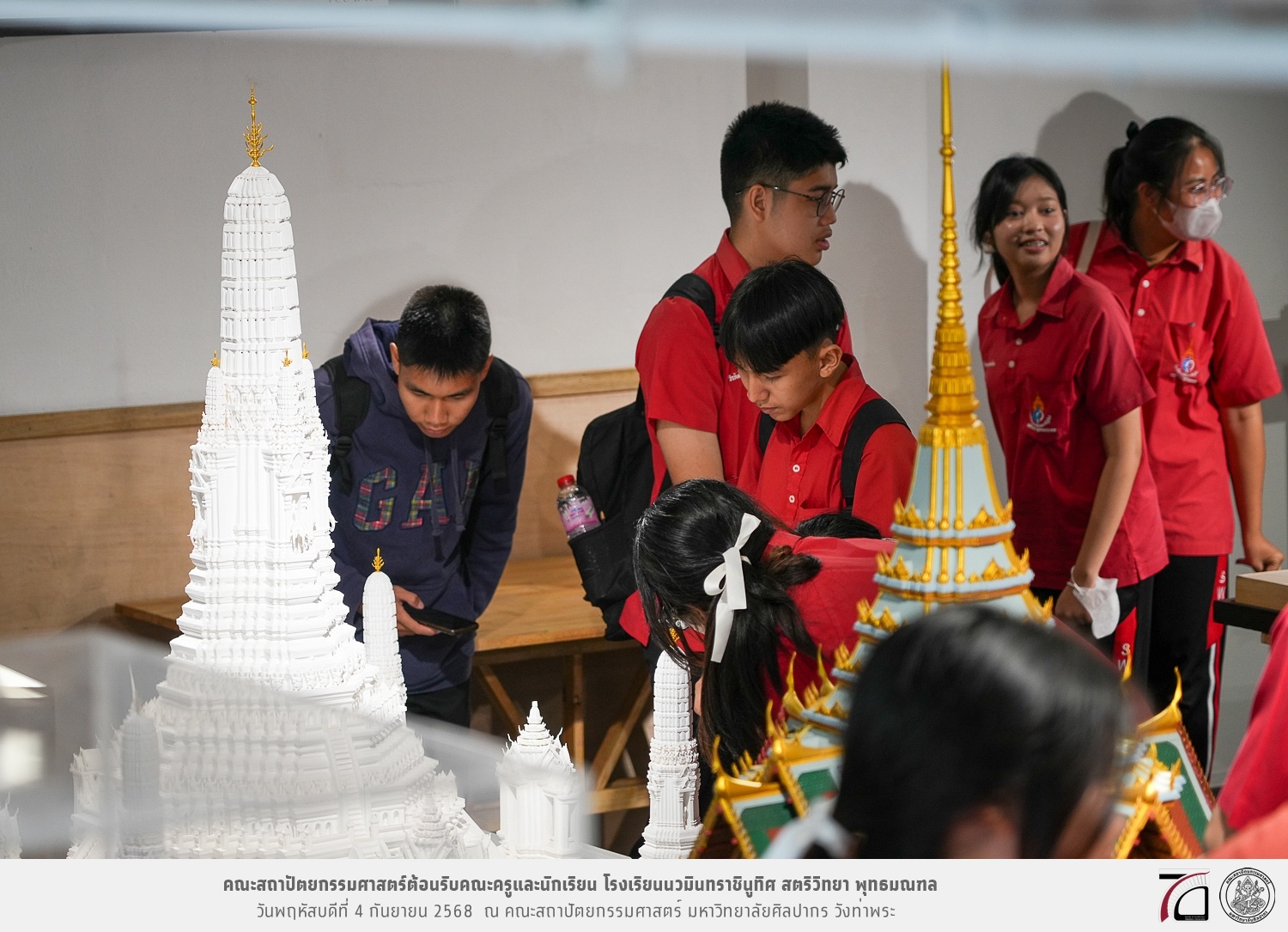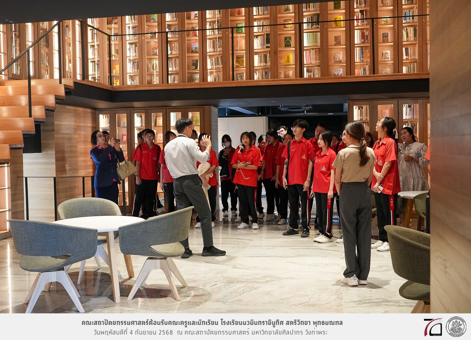 คณะฯ ให้การต้อนรับคณะครูและนักเรียน โรงเรียนนวมินทราชินูทิศ สตรีวิทยา พุทธมณฑล โดยมี ผู้ช่วยศาสตราจารย์ ดร.เจนยุทธ ล่อใจ รองคณบดีฝ่ายกิจการนักศึกษา นำชมคณะสถาปัตยกรรมศาสตร์และบรรยากาศโดยรอบของมหาวิทยาลัยศิลปากร วังท่าพระ เมื่อวันพฤหัสบดีที่ 4 กันยายน 2568 ณ คณะสถาปัตยกรรมศาสตร์ มหาวิทยาลัยศิลปากร วังท่าพระ