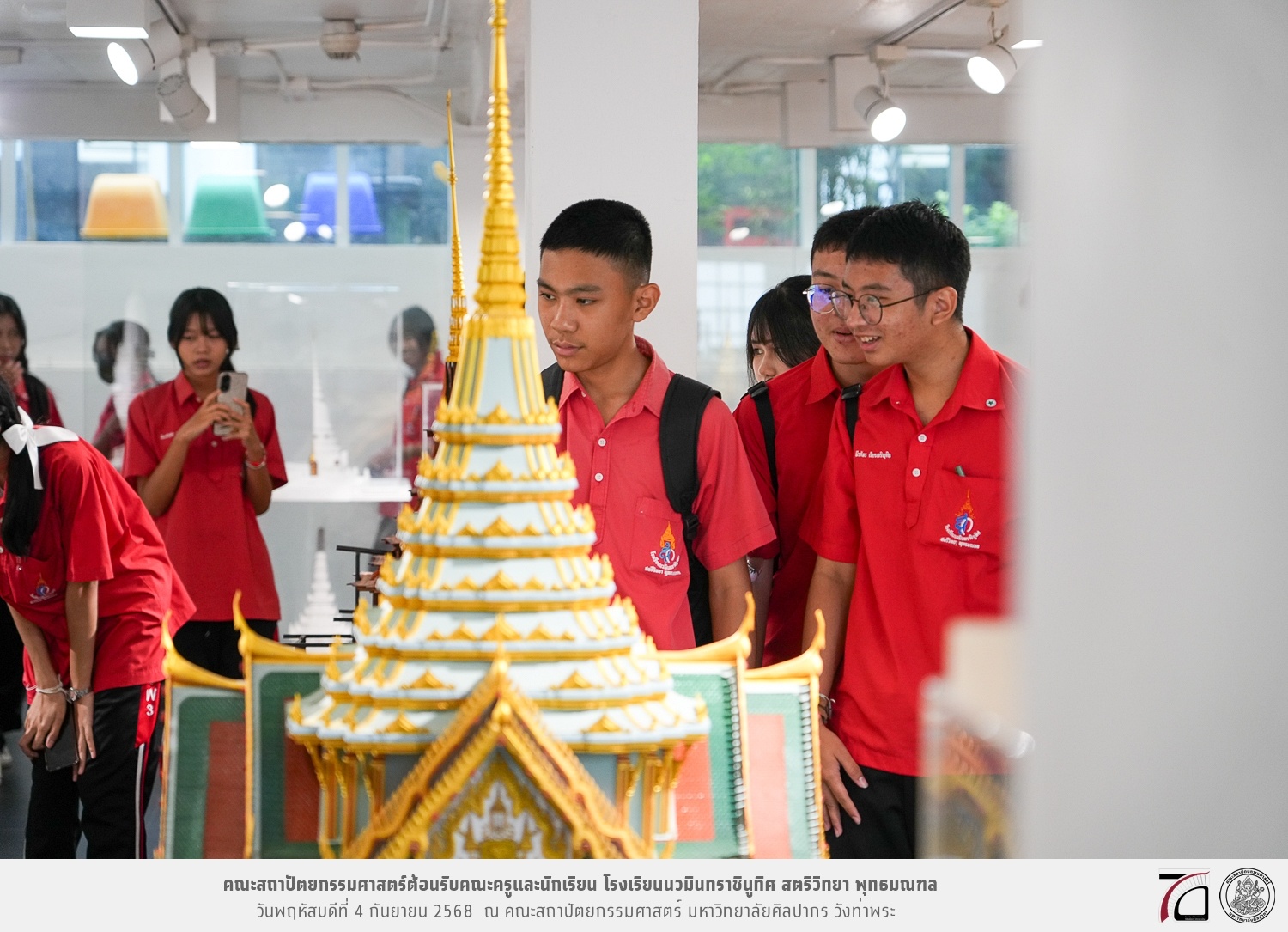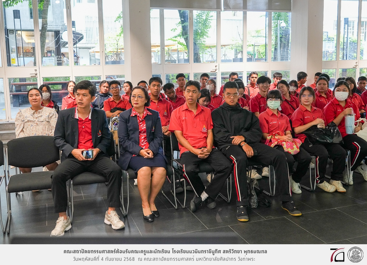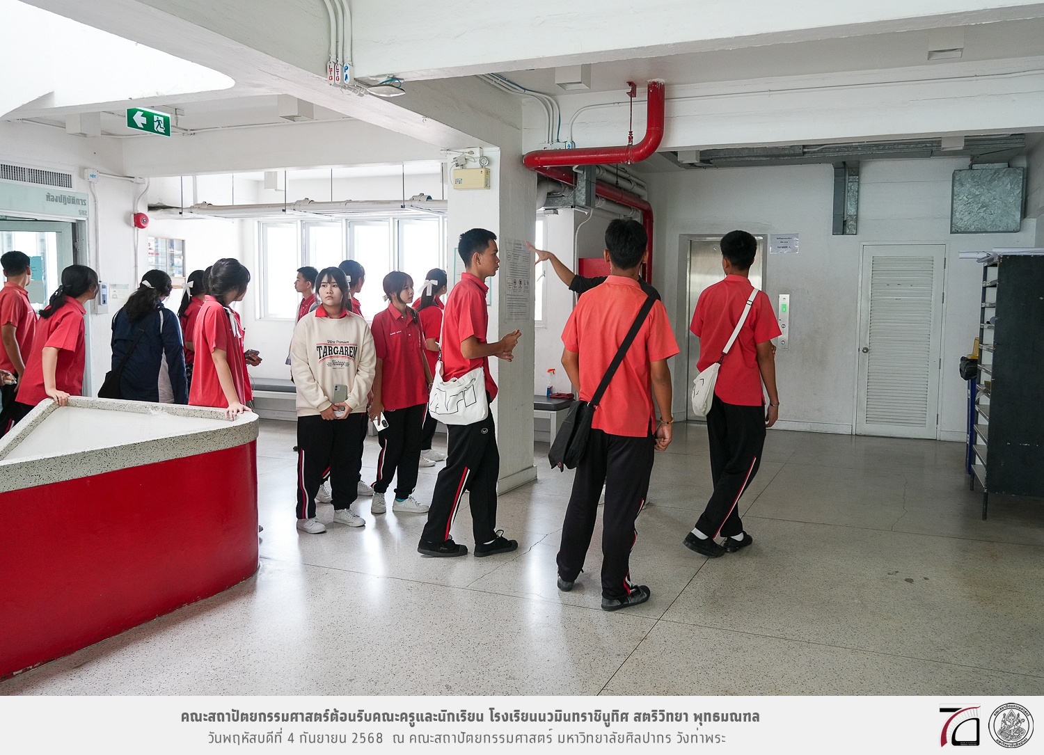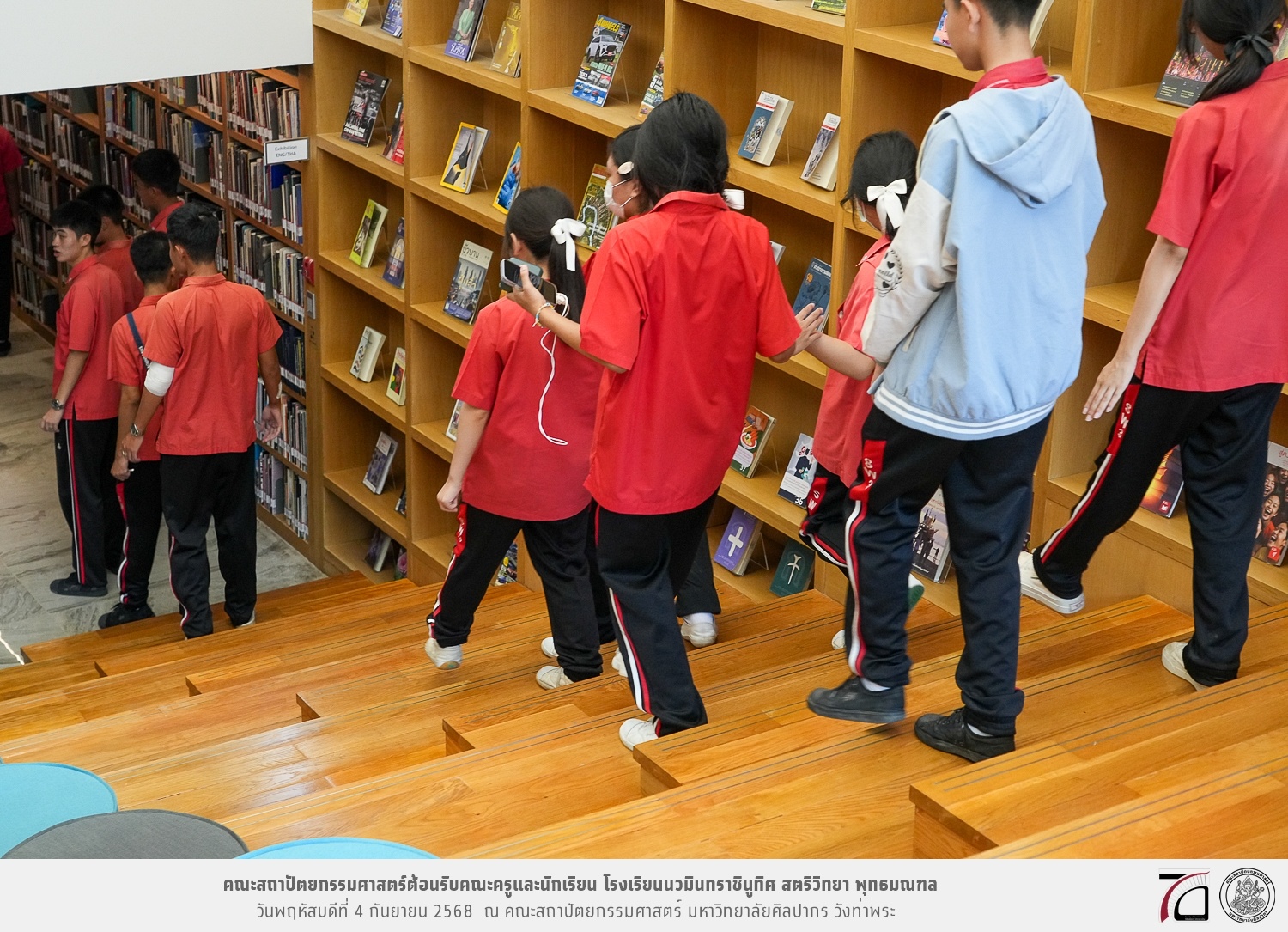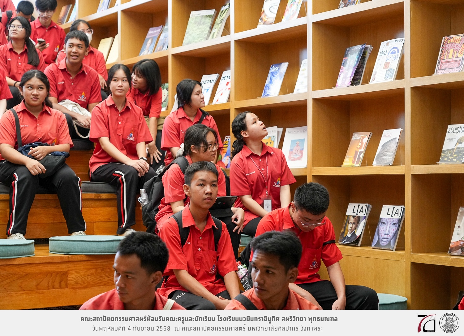 คณะฯ ให้การต้อนรับคณะครูและนักเรียน โรงเรียนนวมินทราชินูทิศ สตรีวิทยา พุทธมณฑล โดยมี ผู้ช่วยศาสตราจารย์ ดร.เจนยุทธ ล่อใจ รองคณบดีฝ่ายกิจการนักศึกษา นำชมคณะสถาปัตยกรรมศาสตร์และบรรยากาศโดยรอบของมหาวิทยาลัยศิลปากร วังท่าพระ เมื่อวันพฤหัสบดีที่ 4 กันยายน 2568 ณ คณะสถาปัตยกรรมศาสตร์ มหาวิทยาลัยศิลปากร วังท่าพระ