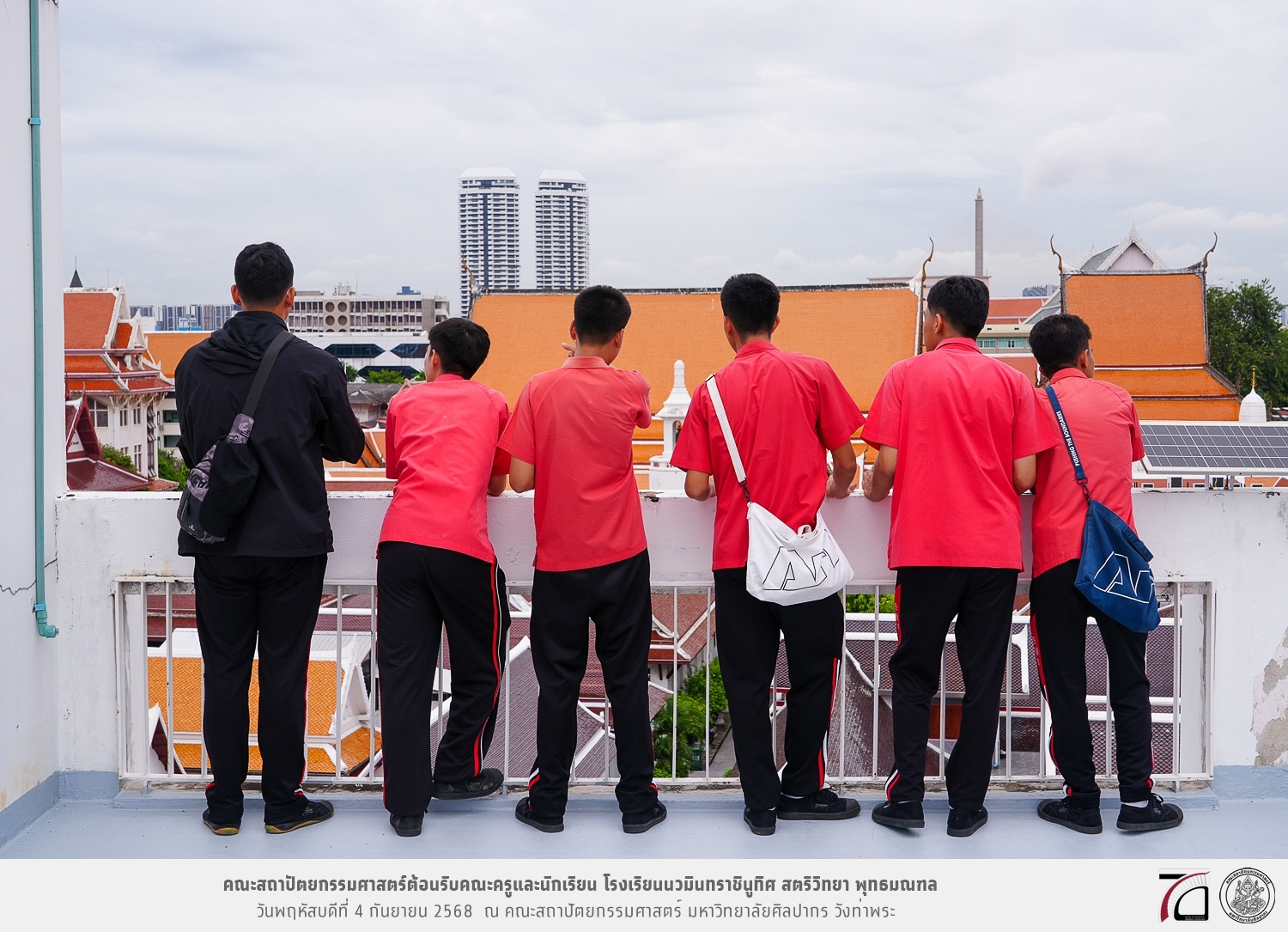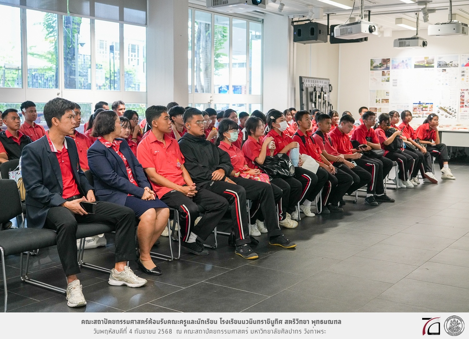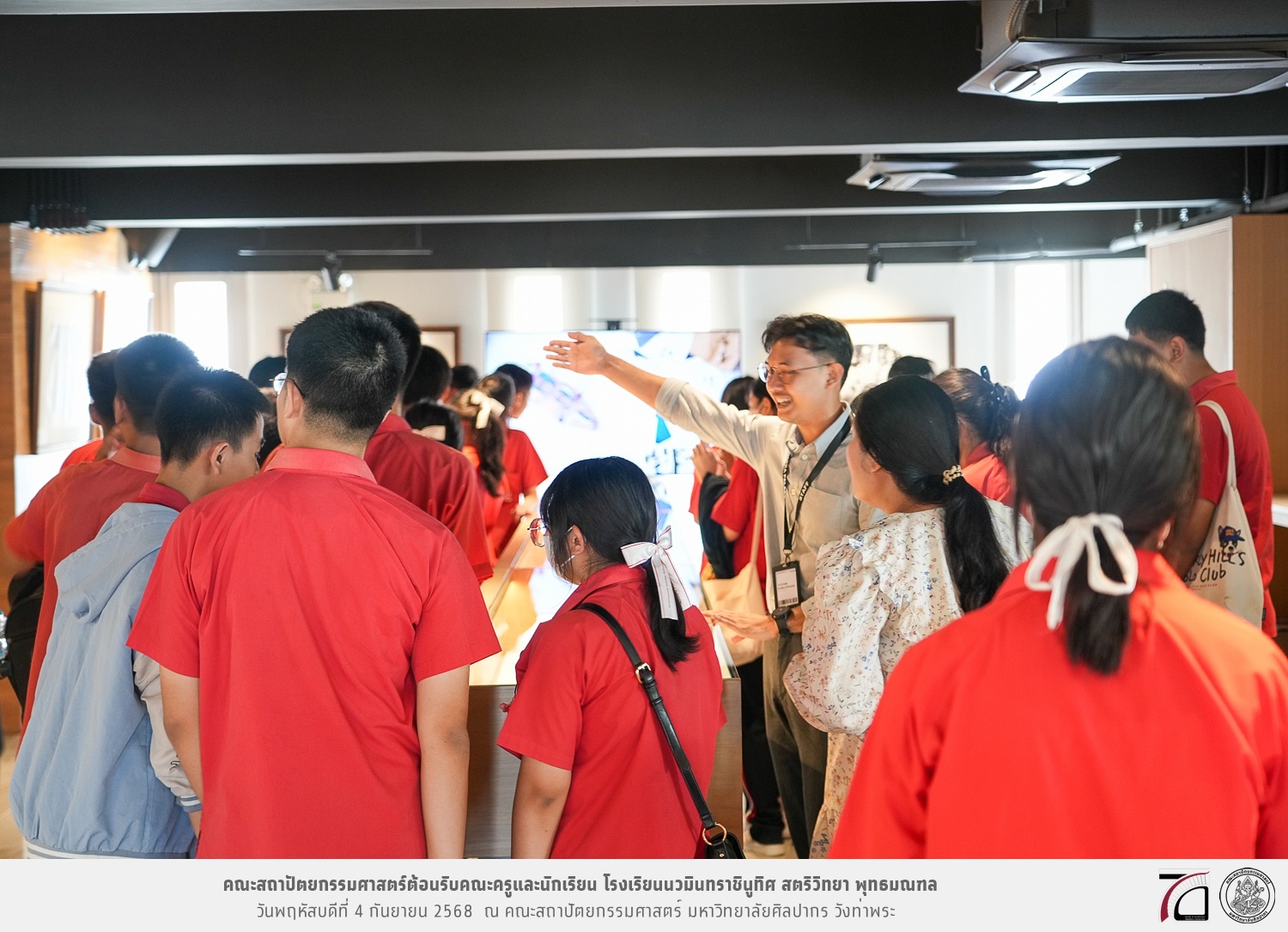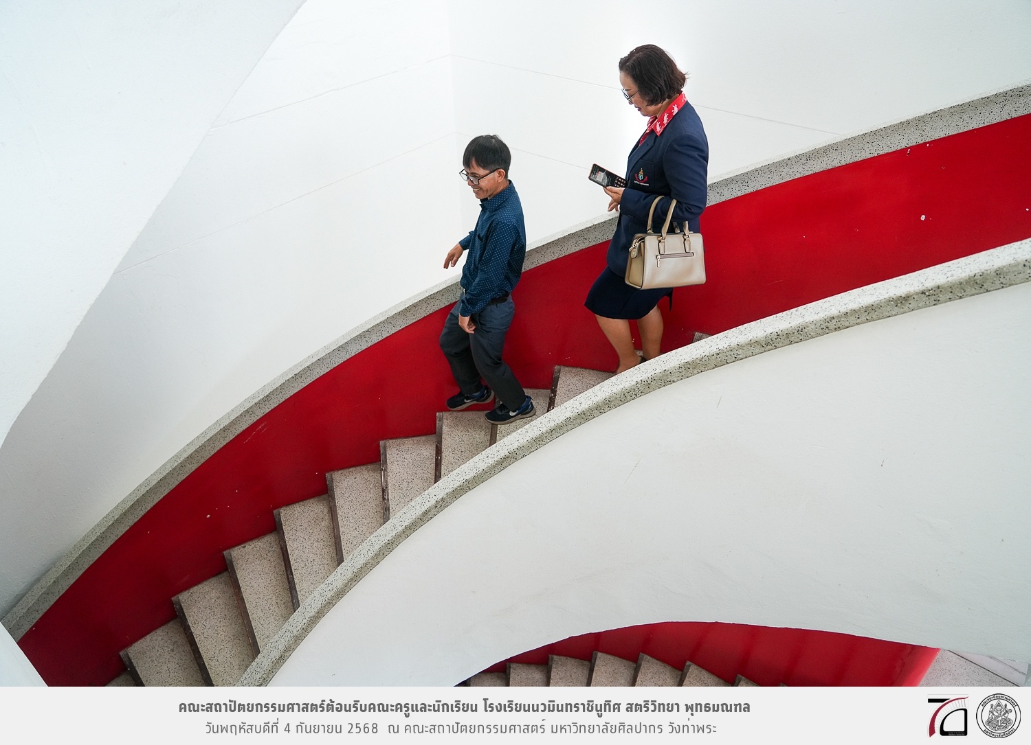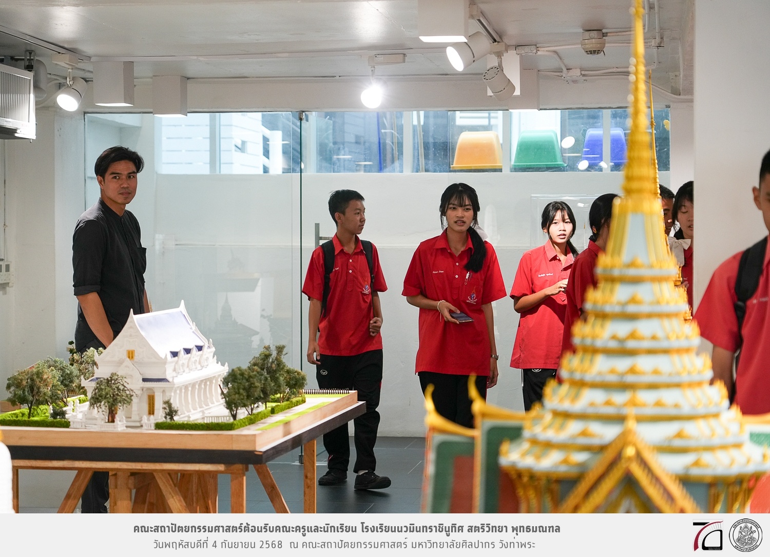 คณะฯ ให้การต้อนรับคณะครูและนักเรียน โรงเรียนนวมินทราชินูทิศ สตรีวิทยา พุทธมณฑล โดยมี ผู้ช่วยศาสตราจารย์ ดร.เจนยุทธ ล่อใจ รองคณบดีฝ่ายกิจการนักศึกษา นำชมคณะสถาปัตยกรรมศาสตร์และบรรยากาศโดยรอบของมหาวิทยาลัยศิลปากร วังท่าพระ เมื่อวันพฤหัสบดีที่ 4 กันยายน 2568 ณ คณะสถาปัตยกรรมศาสตร์ มหาวิทยาลัยศิลปากร วังท่าพระ