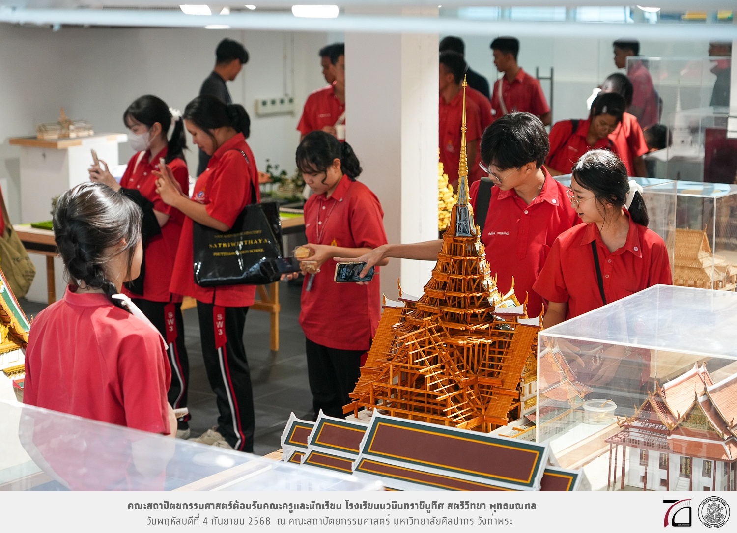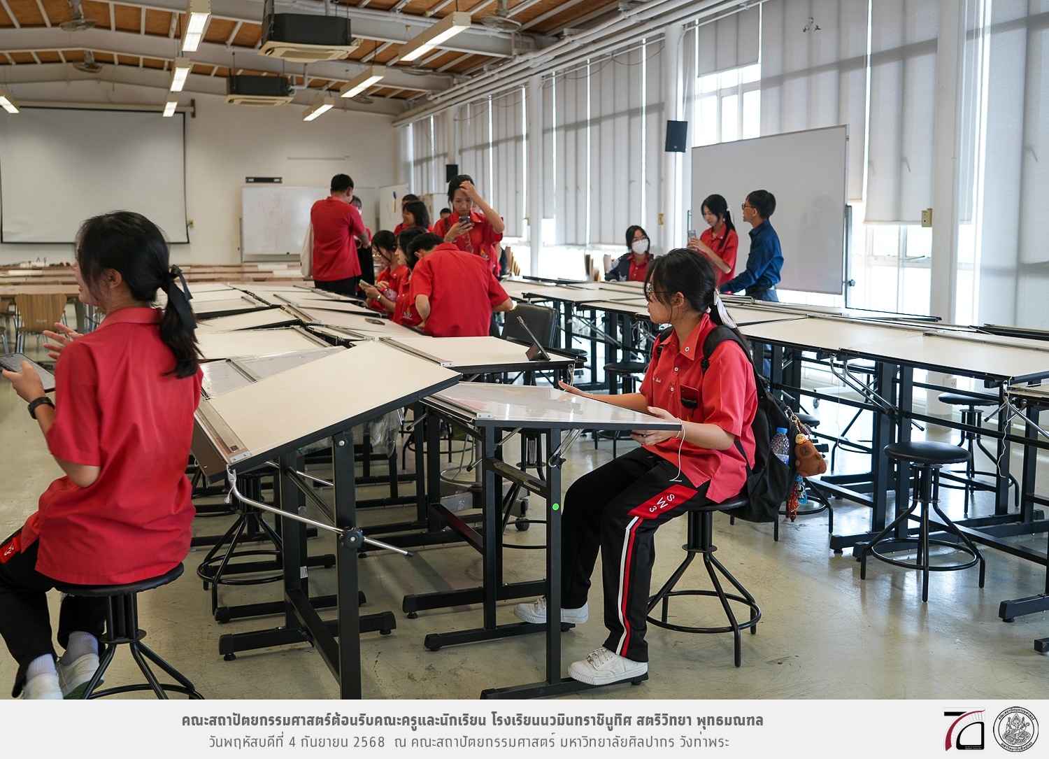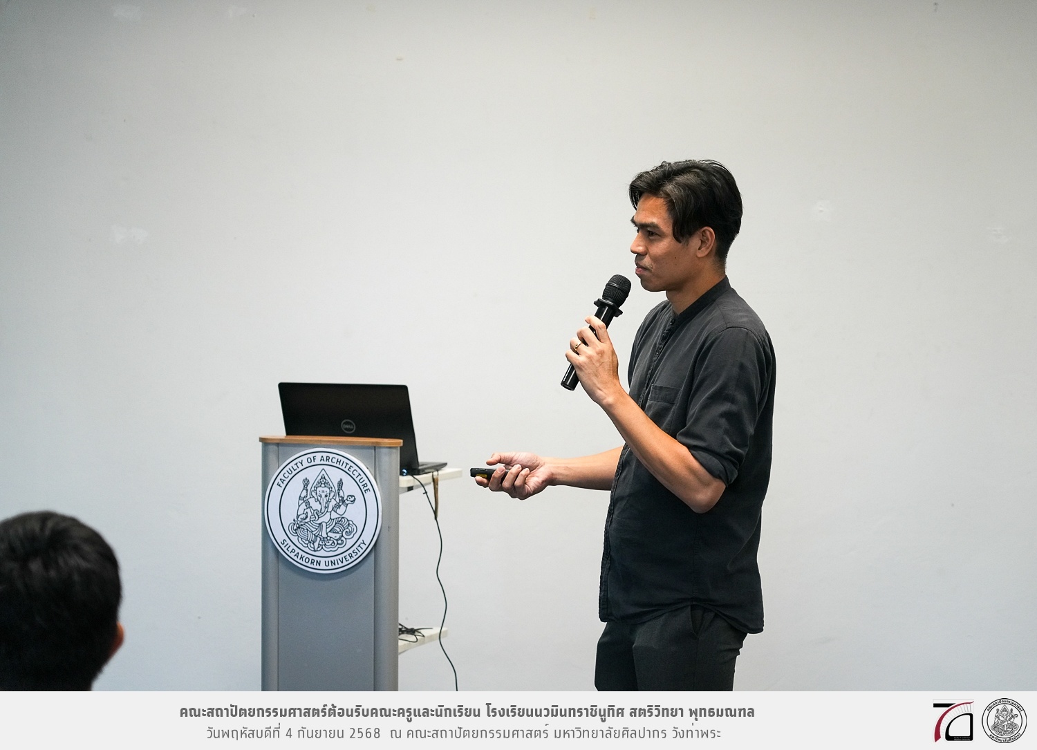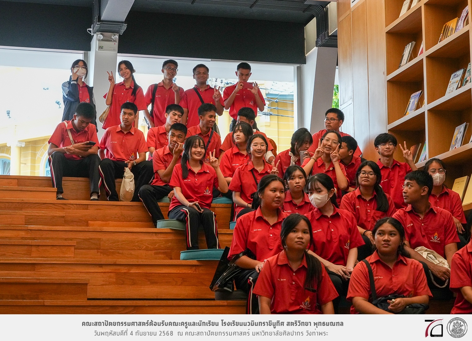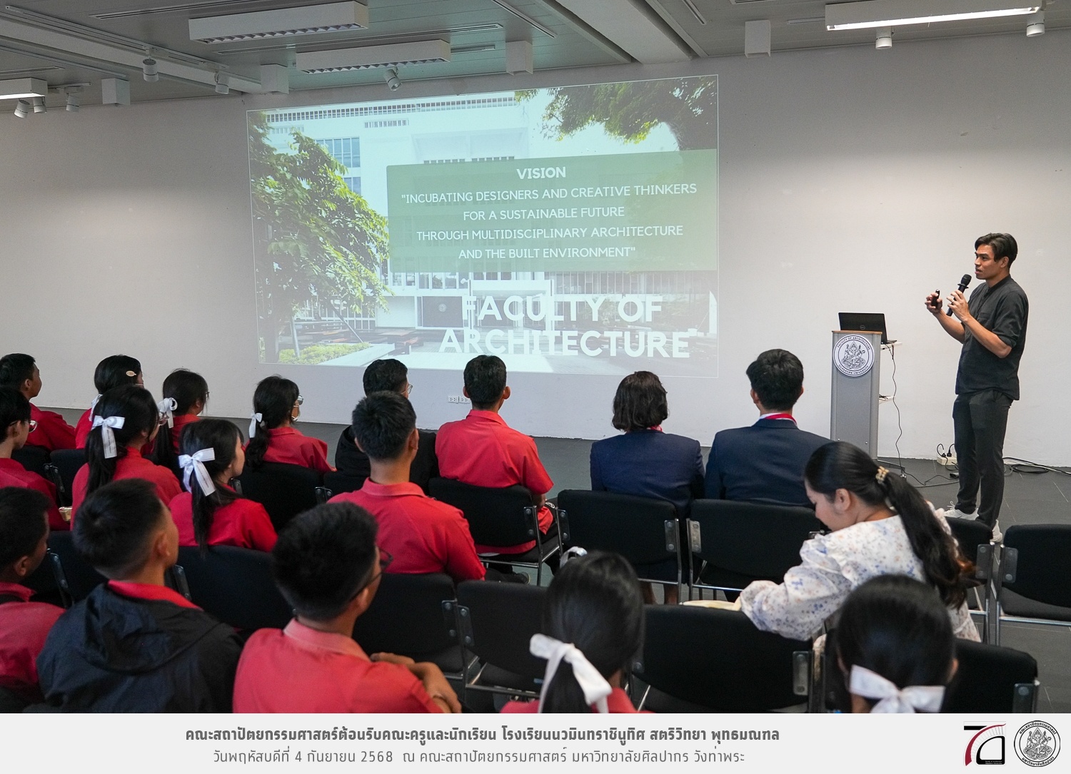 คณะฯ ให้การต้อนรับคณะครูและนักเรียน โรงเรียนนวมินทราชินูทิศ สตรีวิทยา พุทธมณฑล โดยมี ผู้ช่วยศาสตราจารย์ ดร.เจนยุทธ ล่อใจ รองคณบดีฝ่ายกิจการนักศึกษา นำชมคณะสถาปัตยกรรมศาสตร์และบรรยากาศโดยรอบของมหาวิทยาลัยศิลปากร วังท่าพระ เมื่อวันพฤหัสบดีที่ 4 กันยายน 2568 ณ คณะสถาปัตยกรรมศาสตร์ มหาวิทยาลัยศิลปากร วังท่าพระ