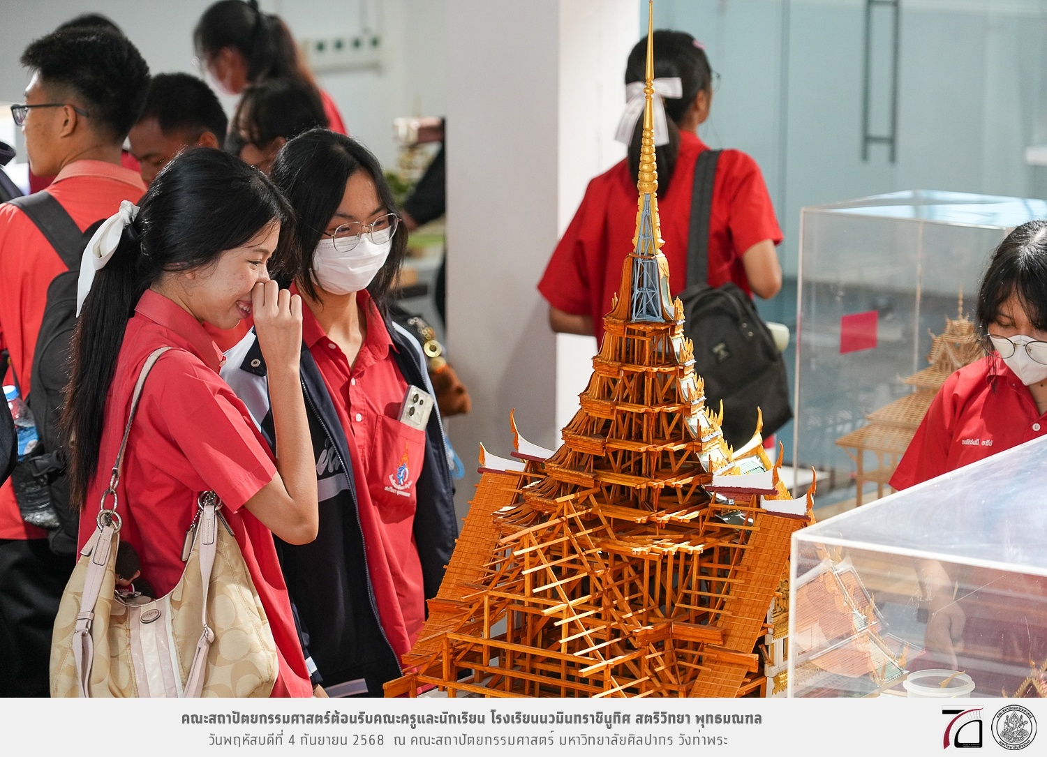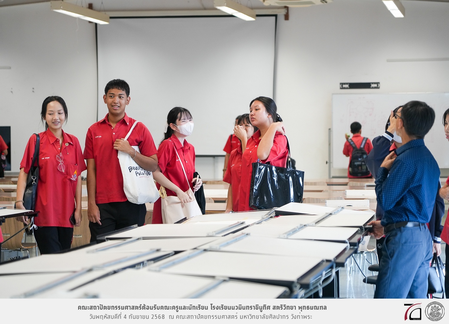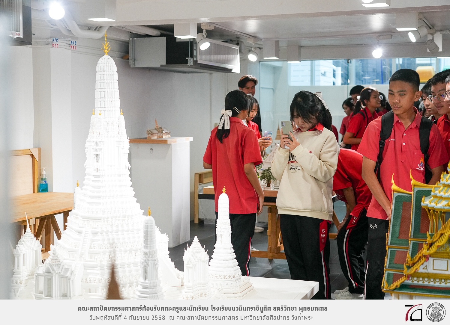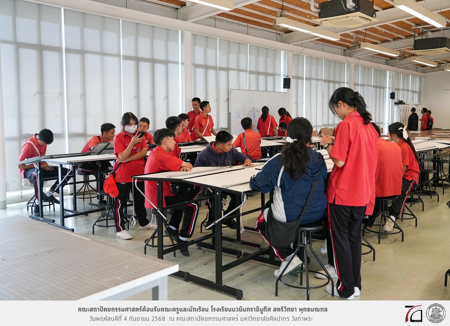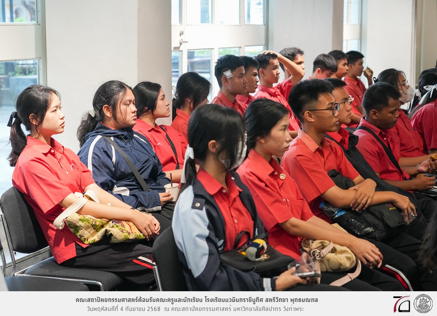 คณะฯ ให้การต้อนรับคณะครูและนักเรียน โรงเรียนนวมินทราชินูทิศ สตรีวิทยา พุทธมณฑล โดยมี ผู้ช่วยศาสตราจารย์ ดร.เจนยุทธ ล่อใจ รองคณบดีฝ่ายกิจการนักศึกษา นำชมคณะสถาปัตยกรรมศาสตร์และบรรยากาศโดยรอบของมหาวิทยาลัยศิลปากร วังท่าพระ เมื่อวันพฤหัสบดีที่ 4 กันยายน 2568 ณ คณะสถาปัตยกรรมศาสตร์ มหาวิทยาลัยศิลปากร วังท่าพระ