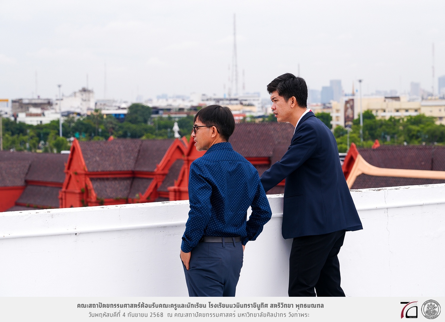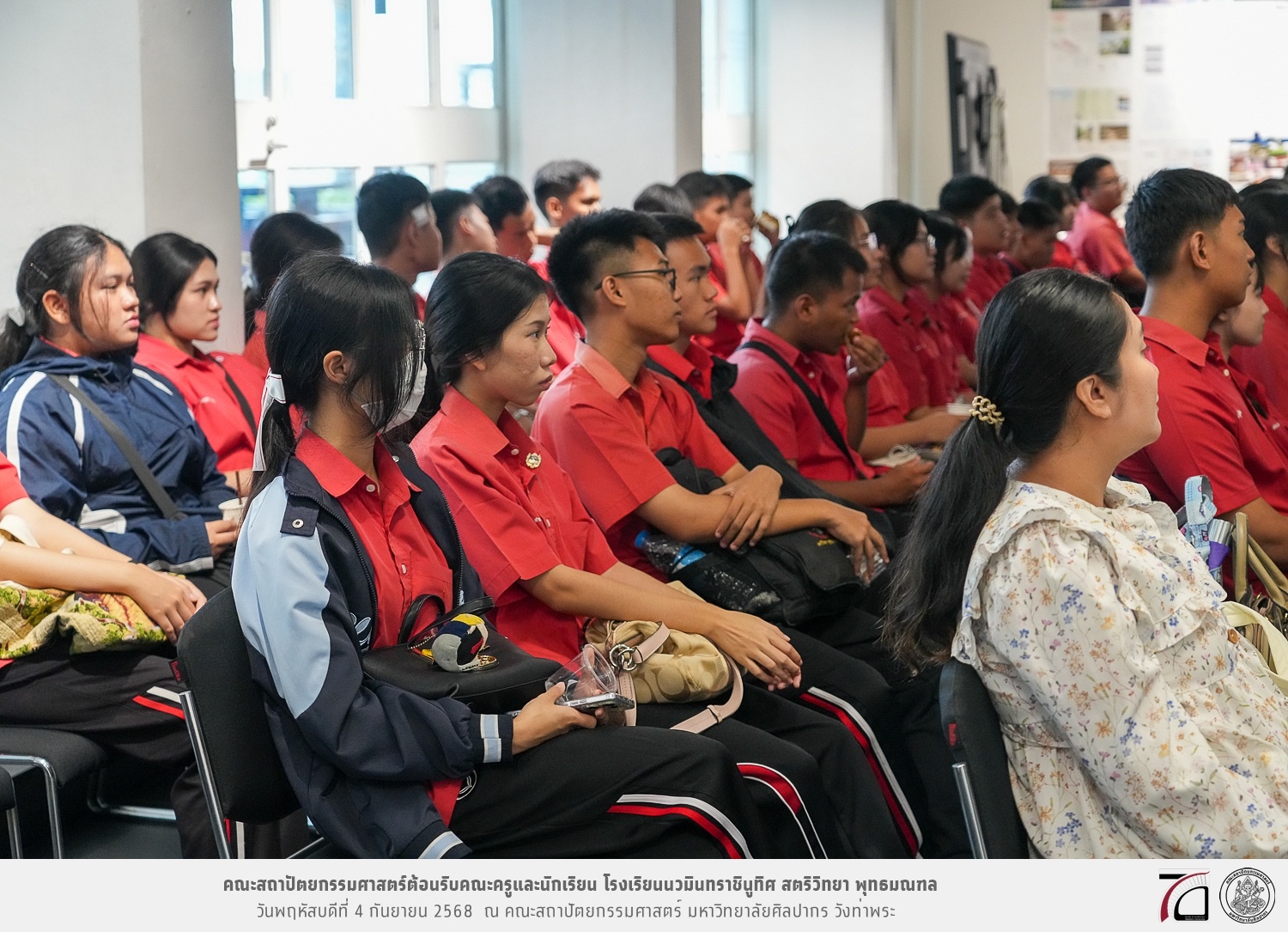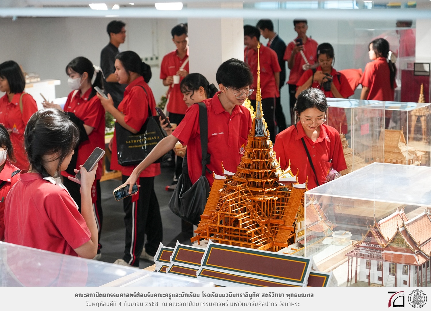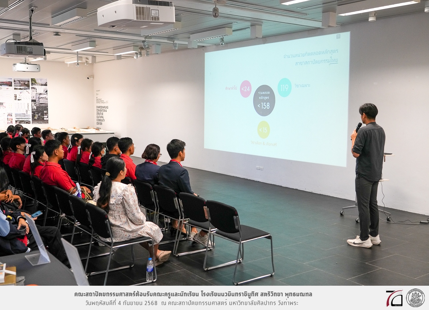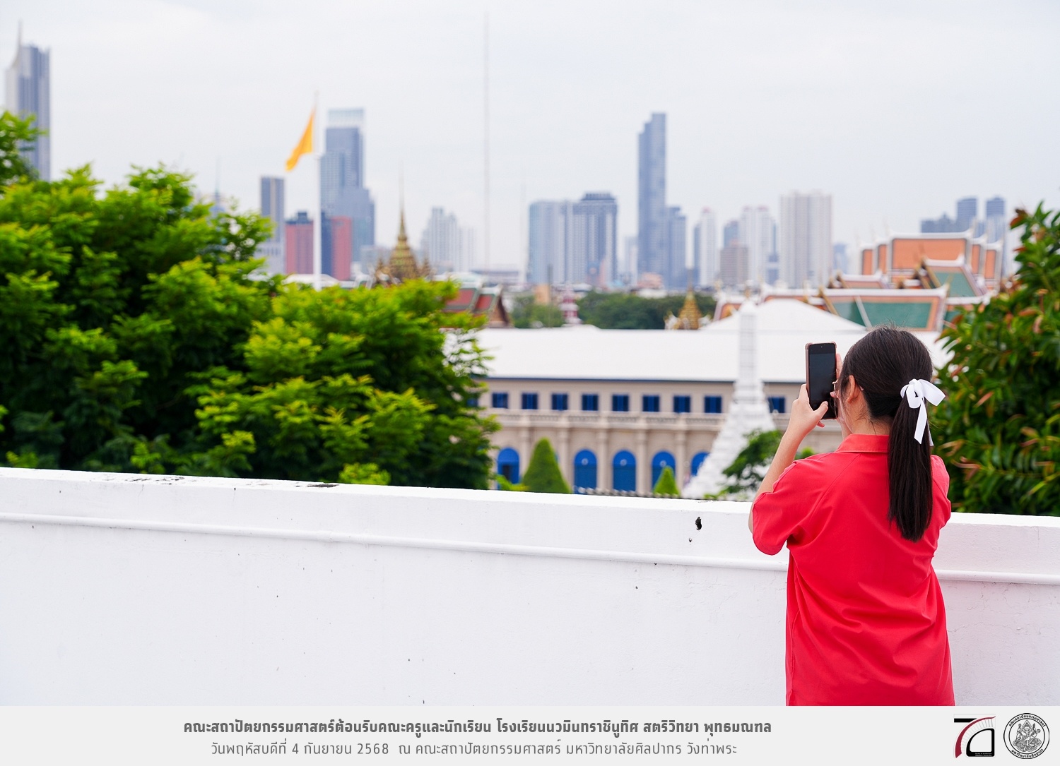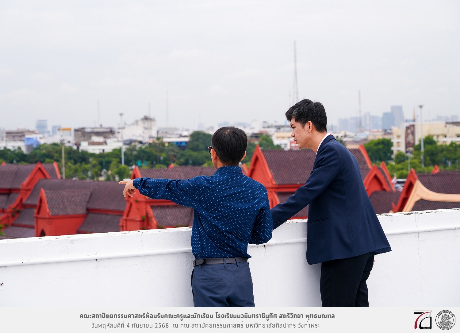 คณะฯ ให้การต้อนรับคณะครูและนักเรียน โรงเรียนนวมินทราชินูทิศ สตรีวิทยา พุทธมณฑล โดยมี ผู้ช่วยศาสตราจารย์ ดร.เจนยุทธ ล่อใจ รองคณบดีฝ่ายกิจการนักศึกษา นำชมคณะสถาปัตยกรรมศาสตร์และบรรยากาศโดยรอบของมหาวิทยาลัยศิลปากร วังท่าพระ เมื่อวันพฤหัสบดีที่ 4 กันยายน 2568 ณ คณะสถาปัตยกรรมศาสตร์ มหาวิทยาลัยศิลปากร วังท่าพระ