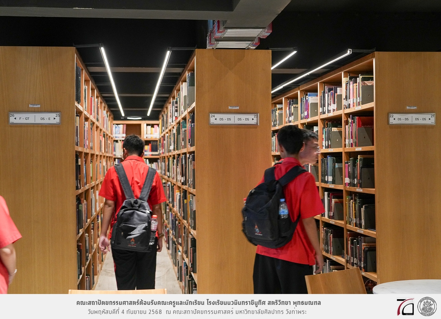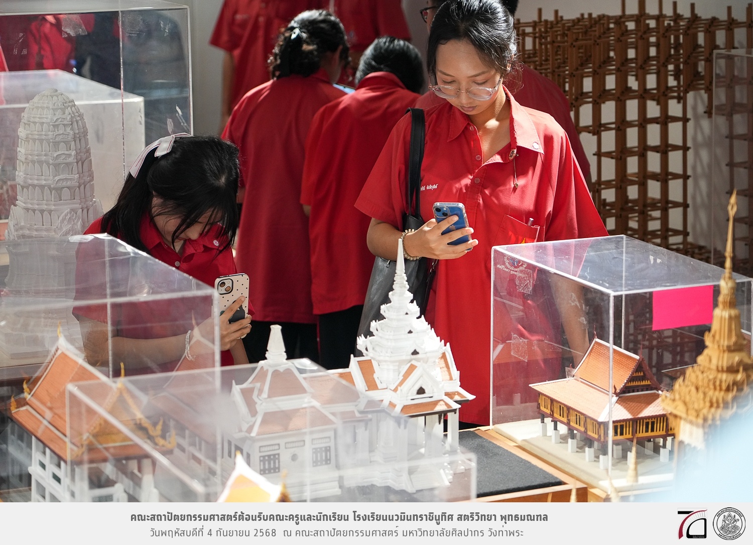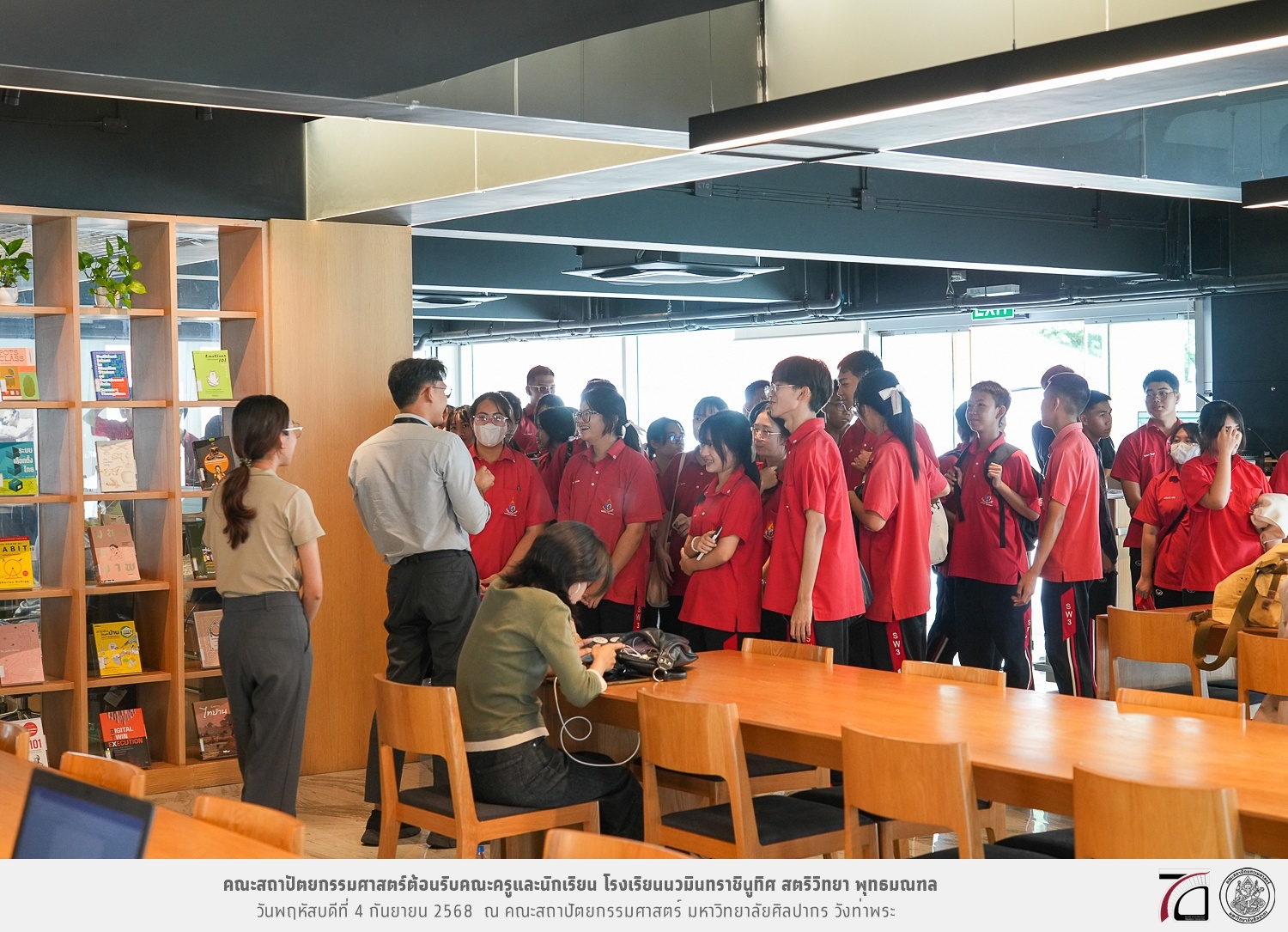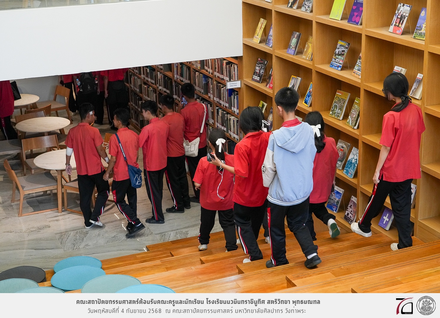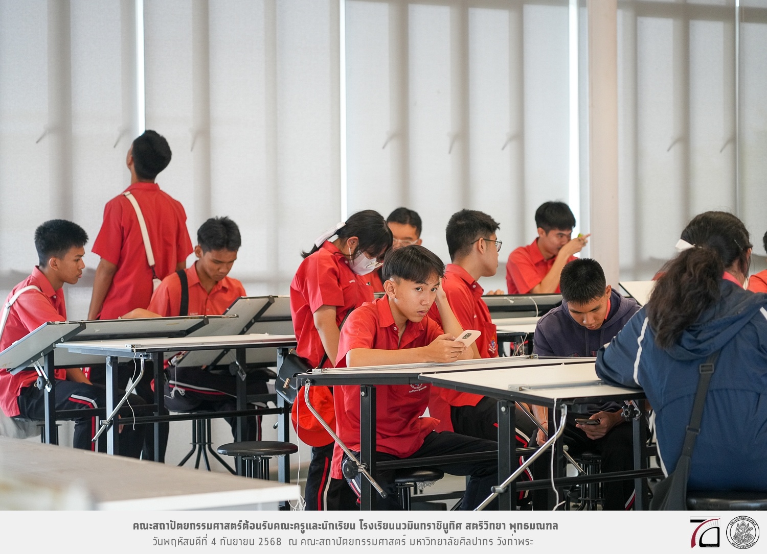 คณะฯ ให้การต้อนรับคณะครูและนักเรียน โรงเรียนนวมินทราชินูทิศ สตรีวิทยา พุทธมณฑล โดยมี ผู้ช่วยศาสตราจารย์ ดร.เจนยุทธ ล่อใจ รองคณบดีฝ่ายกิจการนักศึกษา นำชมคณะสถาปัตยกรรมศาสตร์และบรรยากาศโดยรอบของมหาวิทยาลัยศิลปากร วังท่าพระ เมื่อวันพฤหัสบดีที่ 4 กันยายน 2568 ณ คณะสถาปัตยกรรมศาสตร์ มหาวิทยาลัยศิลปากร วังท่าพระ