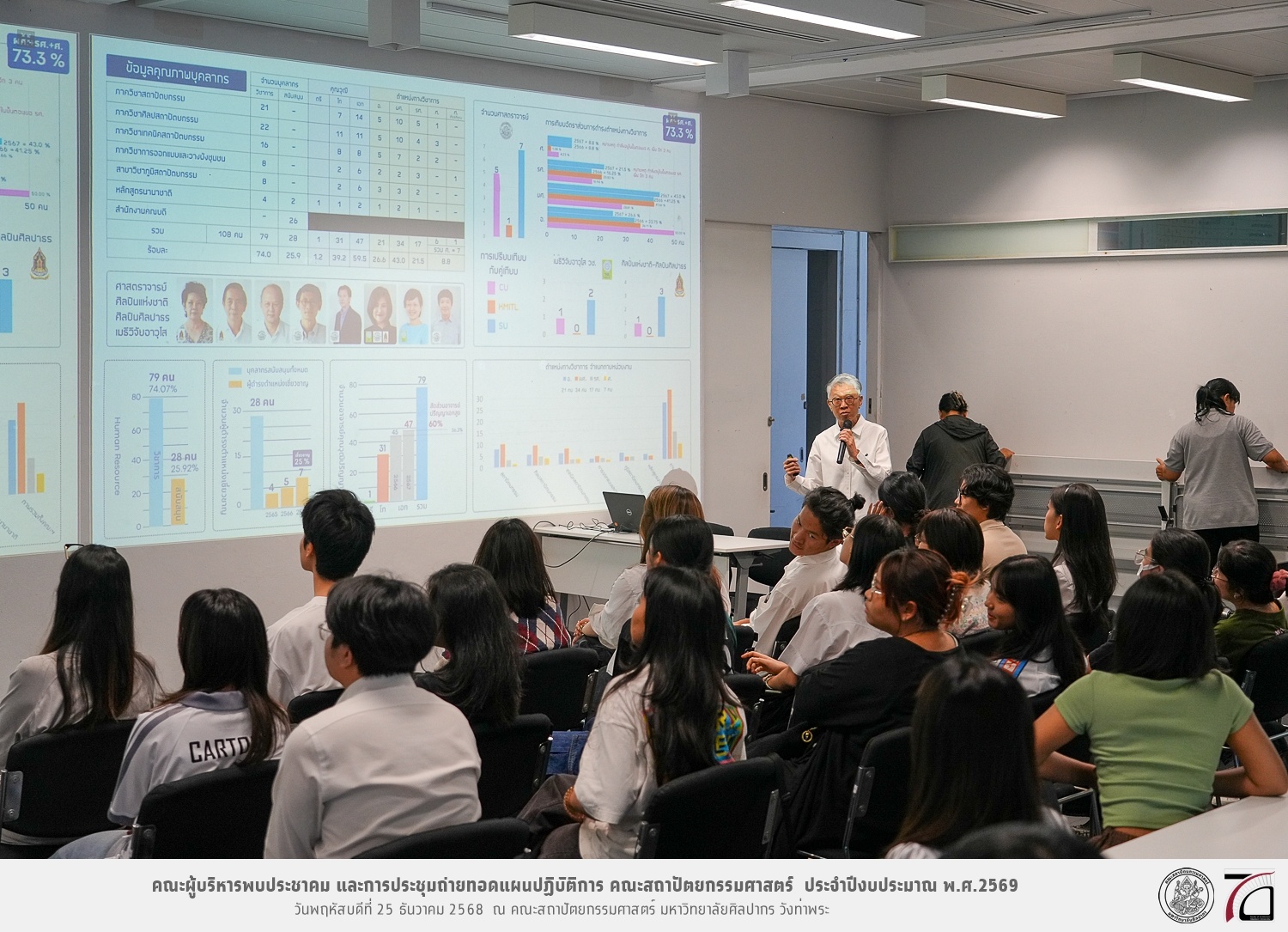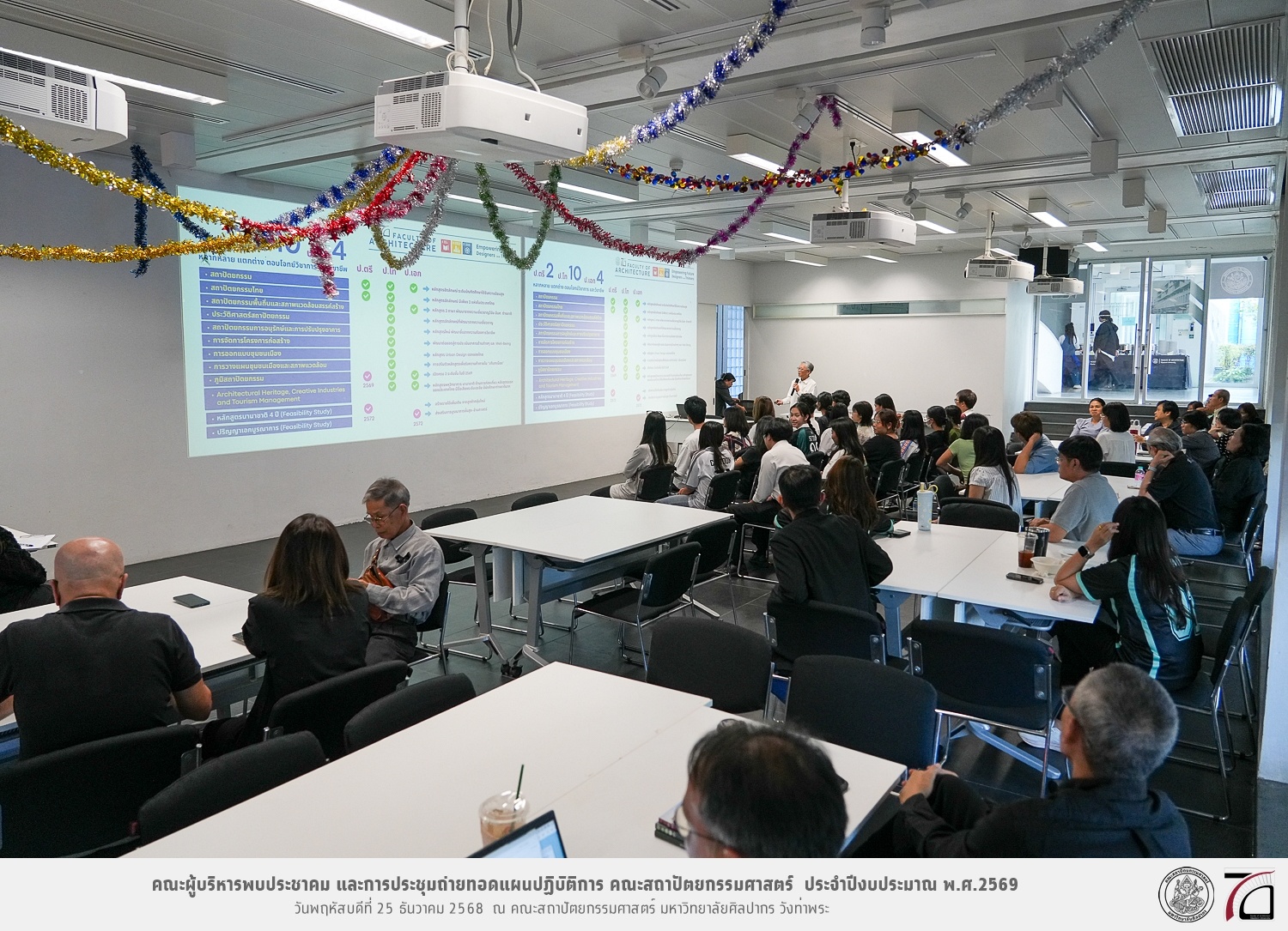 บรรยากาศคณะผู้บริหารพบประชาคม และการประชุมถ่ายทอดแผนปฏิบัติการ คณะสถาปัตยกรรมศาสตร์ ประจำปีงบประมาณ พ.ศ. 2569 เมื่อวันพฤหัสบดีที่ 25 ธันวาคม 2568 ณ หอศิลปะสถาปัตยกรรม พระพรหมพิจิตร (ห้อง 104) คณะสถาปัตยกรรมศาสตร์ มหาวิทยาลัยศิลปากร