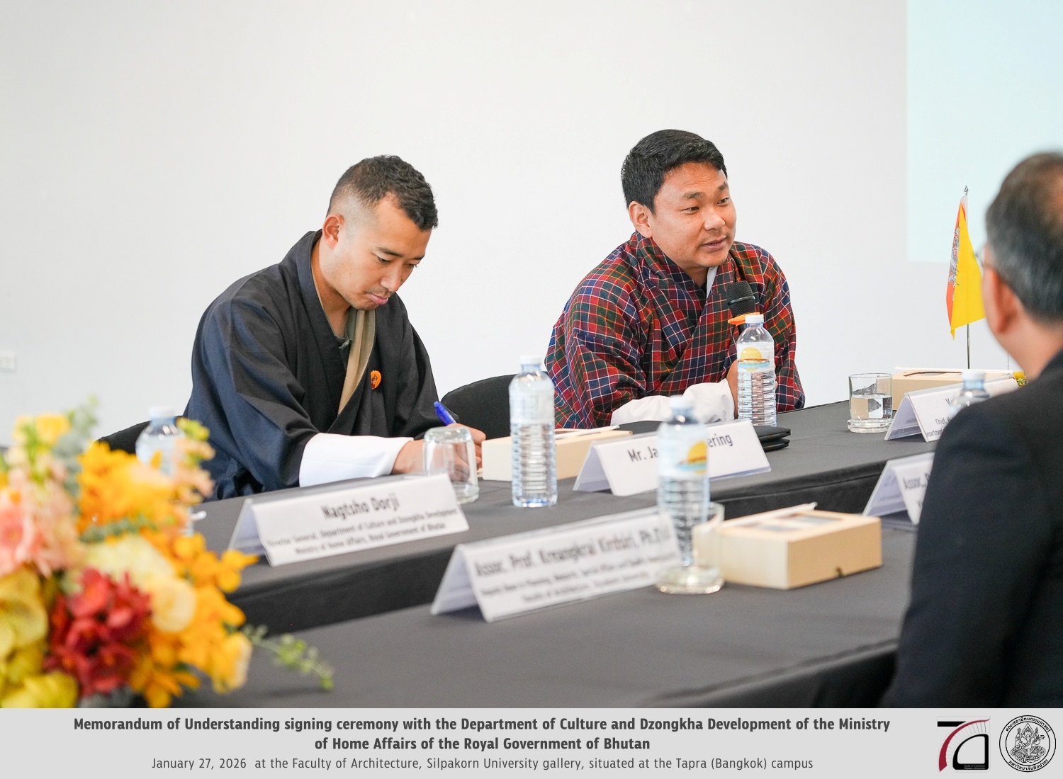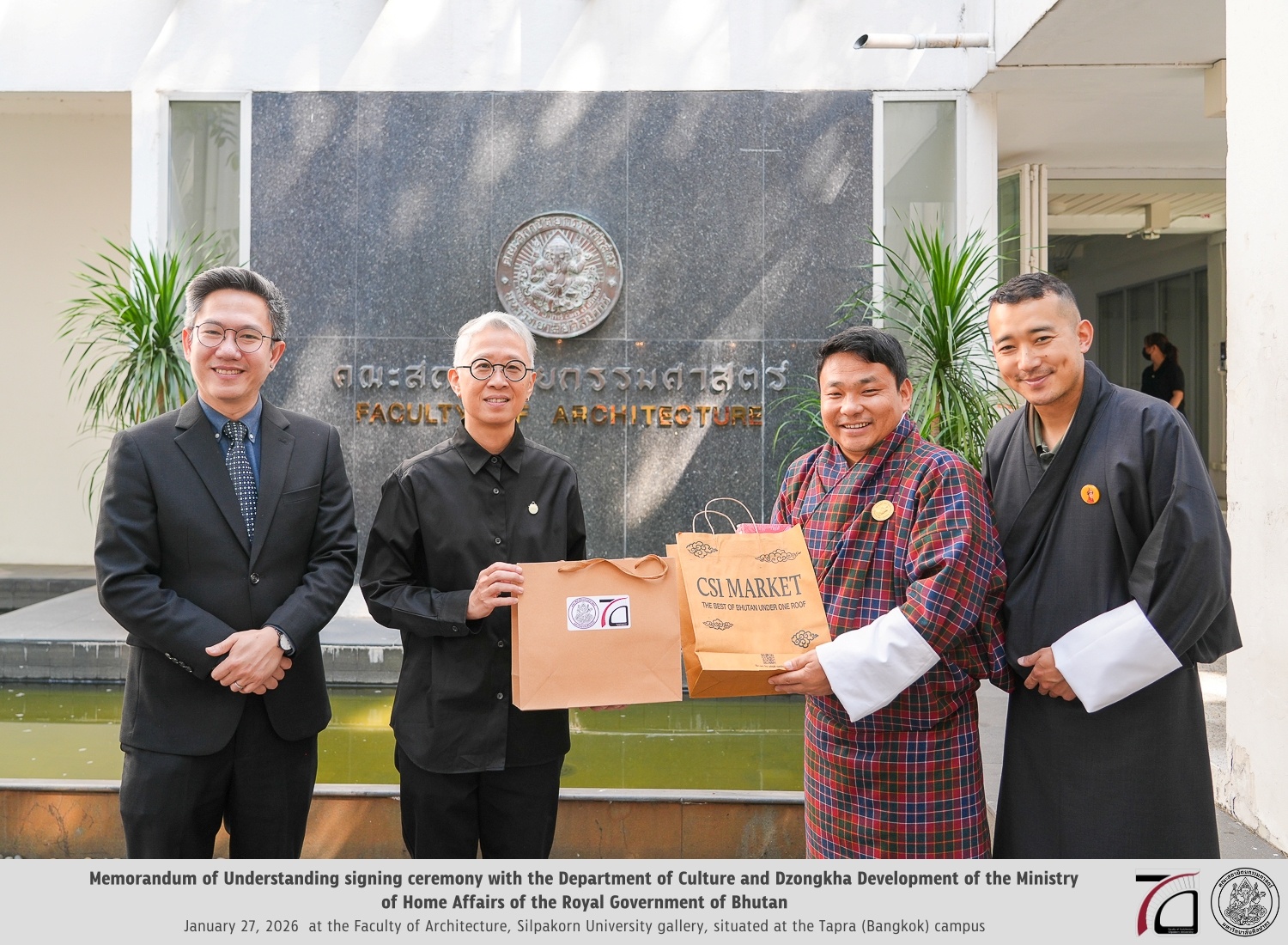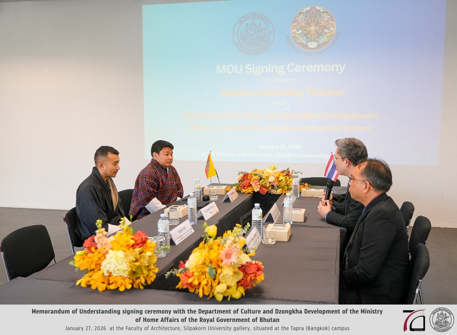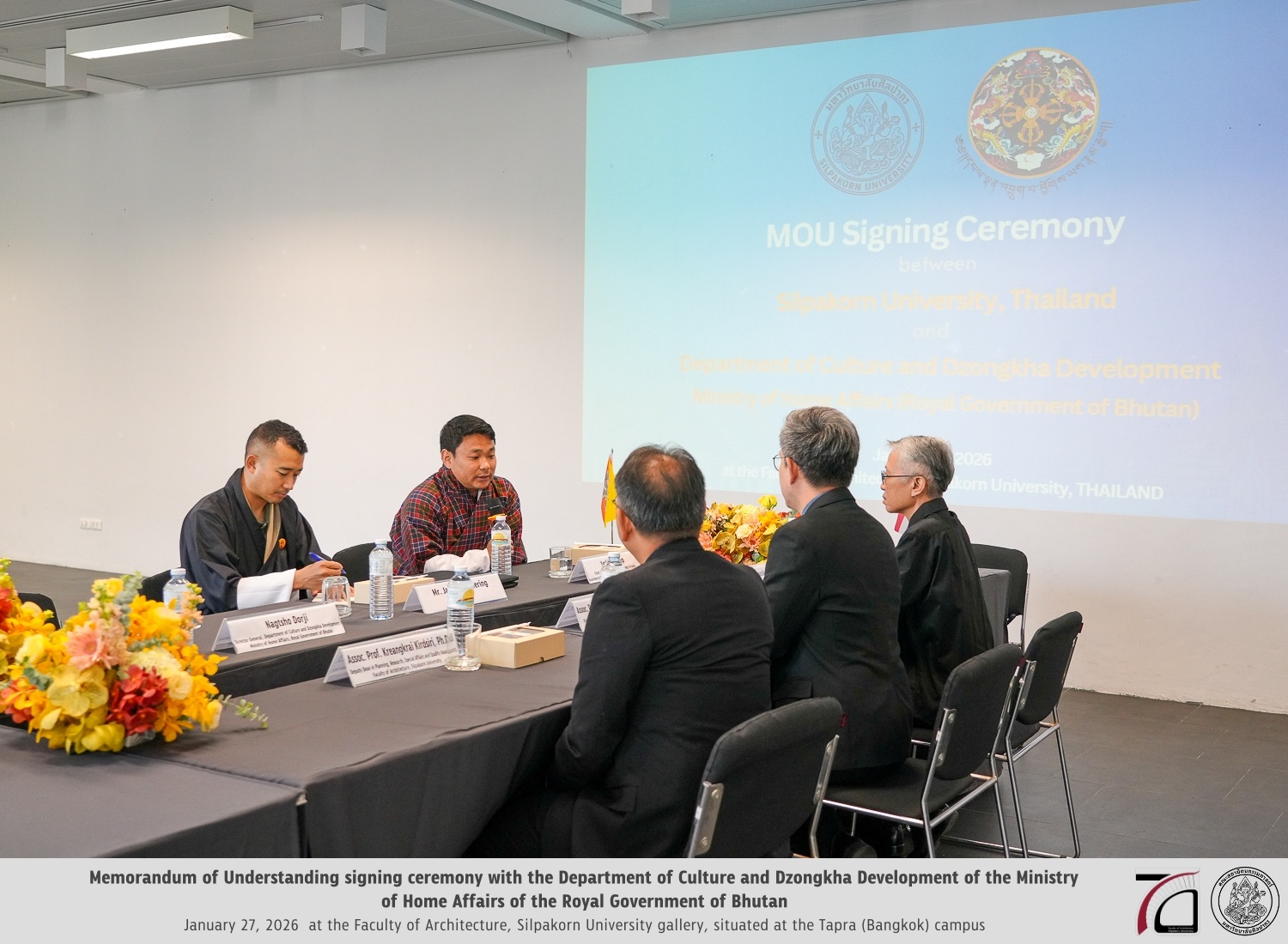 การลงนามในครั้งนี้เป็นความร่วมมือระหว่าง คณะสถาปัตยกรรมศาสตร์ มหาวิทยาลัยศิลปากร นำโดย รองศาสตราจารย์ ดร.อภิรดี เกษมสุข และ กรมวัฒนธรรมและการพัฒนาภาษาซองคา (Department of Culture and Dzongkha Development) กระทรวงมหาดไทย แห่งราชอาณาจักรภูฏาน โดยมี ท่านเยชี ซัมดรุป (Yeshi Samdrup) หัวหน้ากองโบราณสถานและโบราณคดี เป็นผู้แทน เพื่อเริ่มต้นความร่วมมืออย่างเป็นทางการตามกรอบบันทึกความเข้าใจระหว่างสองสถาบันและสองประเทศ